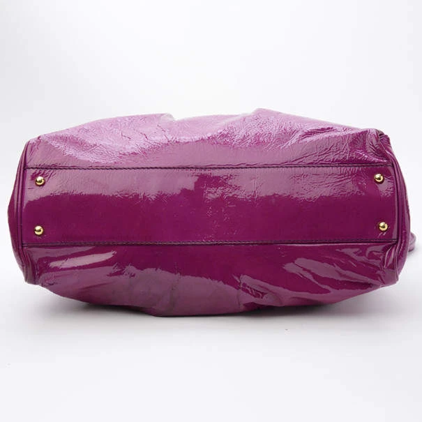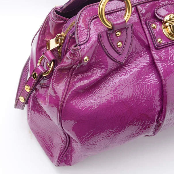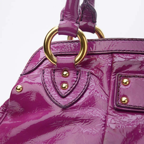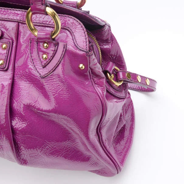 Eye catching and simple, this Marc Jacobs Alyona Satchel will have all eyes on you! Made from shiny patent leather, it features a push lock detailing on front, two rolled handles, pleat detailing from the center and a detachable shoulder strap. The multiple compartment interior is lined with satin with one patch pocket and a D ring. Original Retail Price: US $1,350