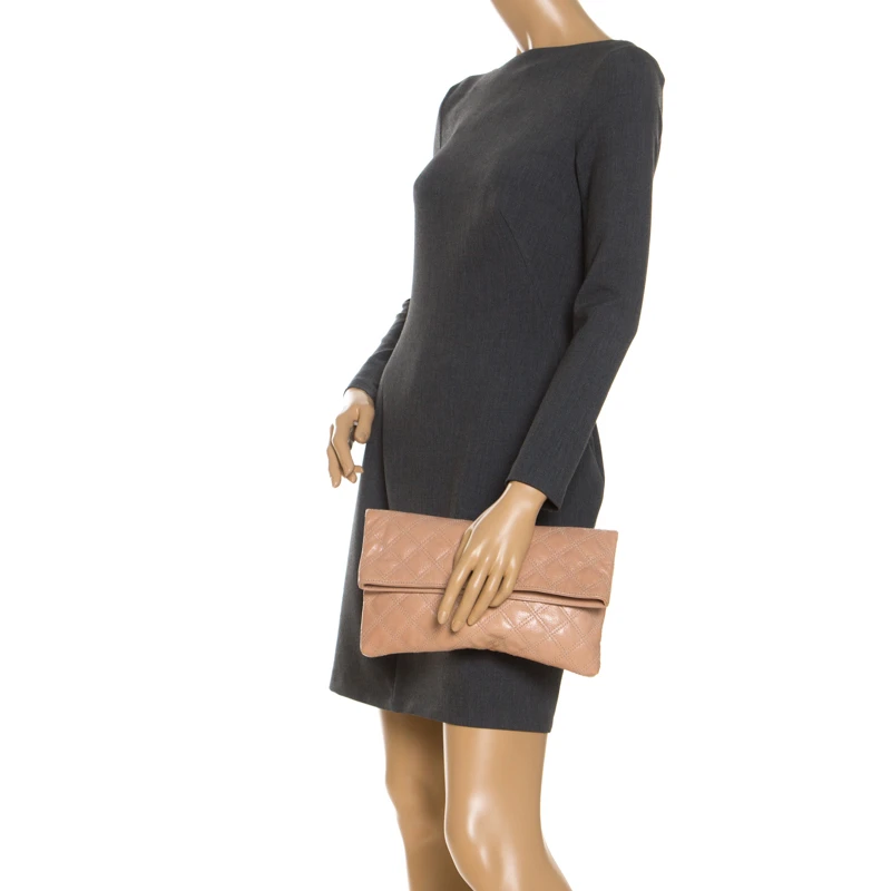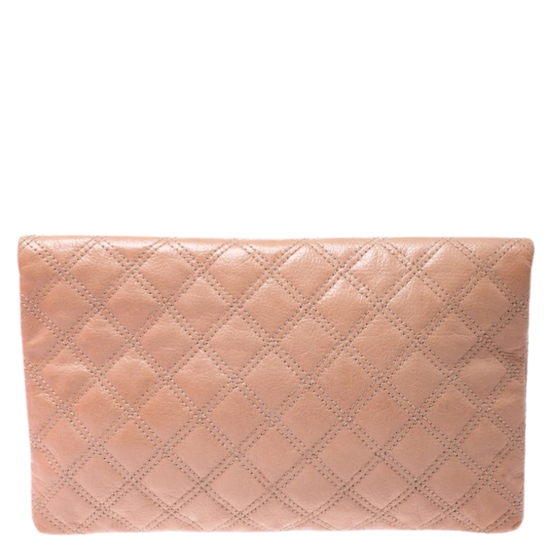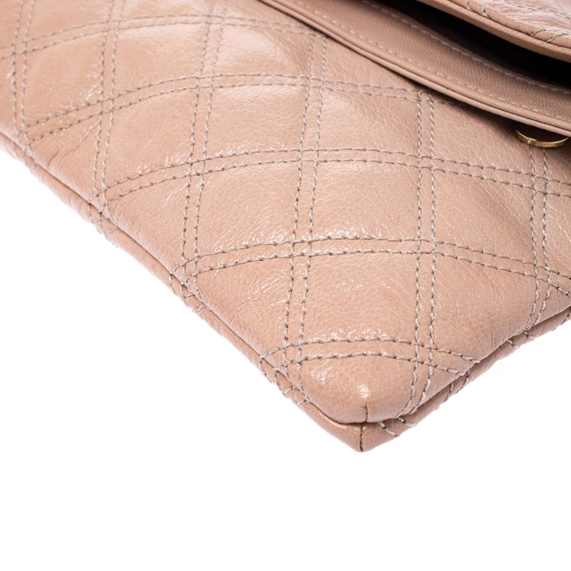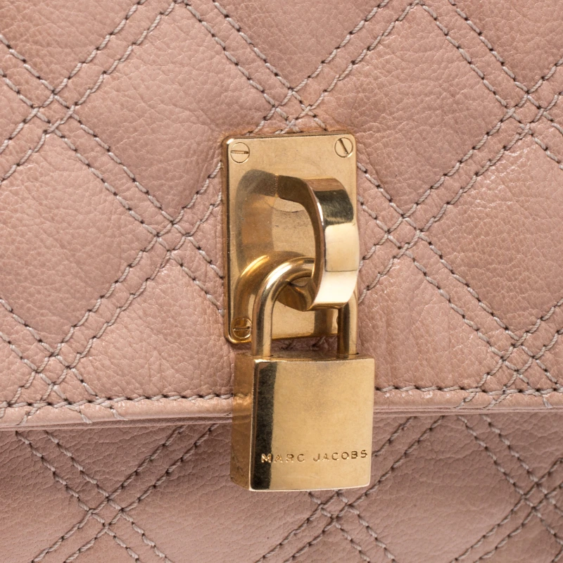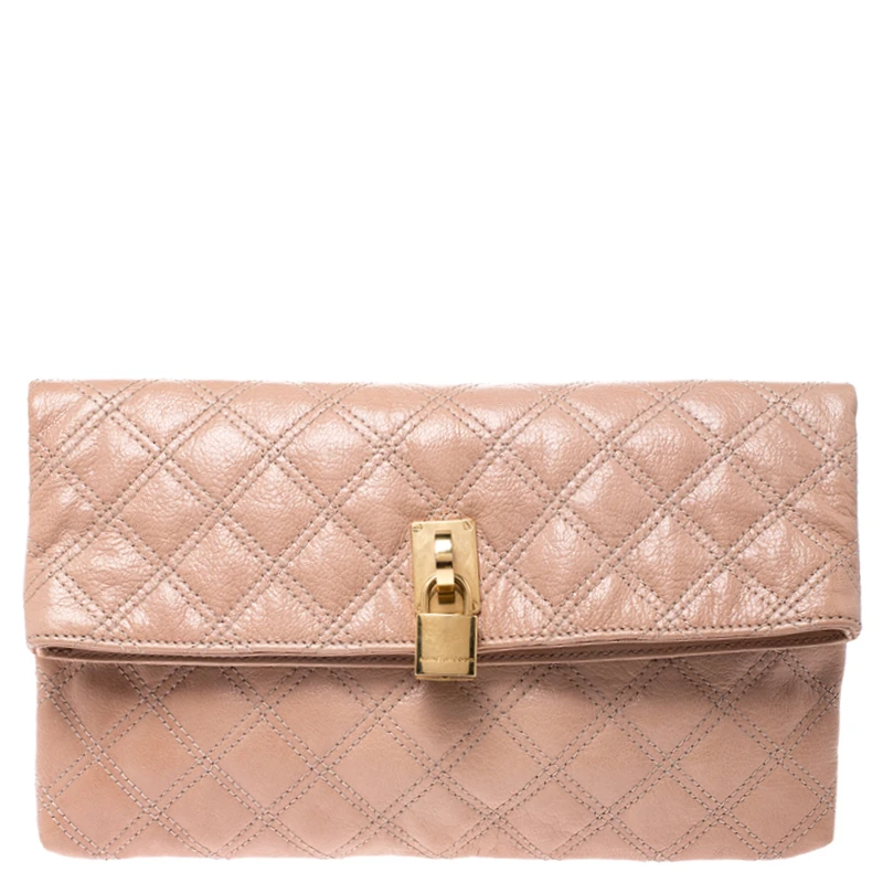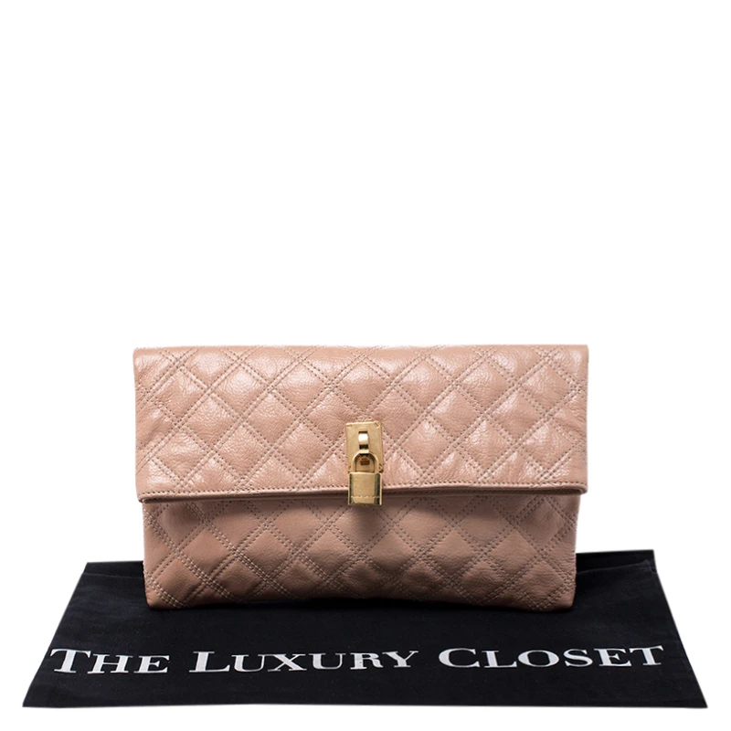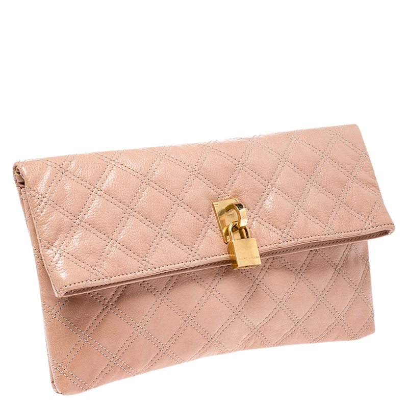 Covered in a timeless quilted pattern, this Eugenie clutch by Marc Jacobs comes in a flap style. It has a beige leather body with a padlock detail in gold tone on the flap and a well-sized fabric interior.