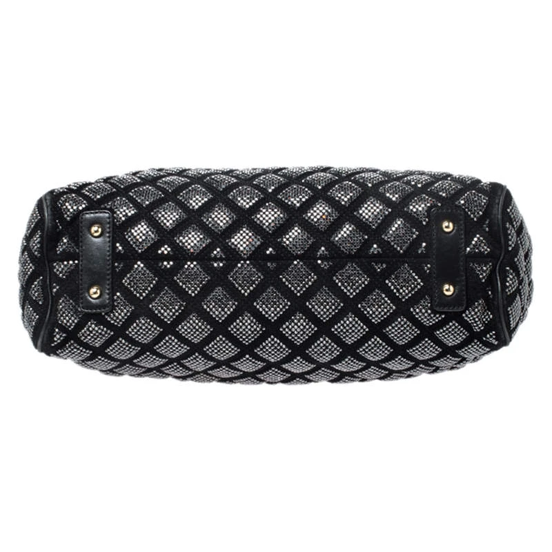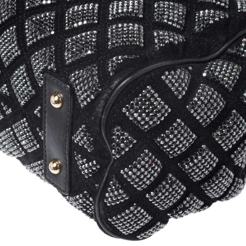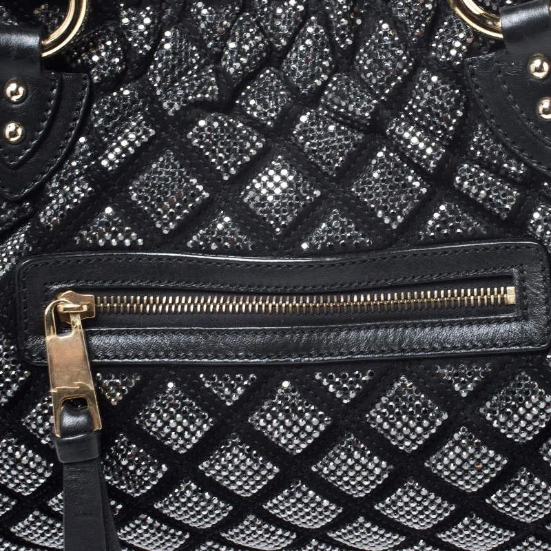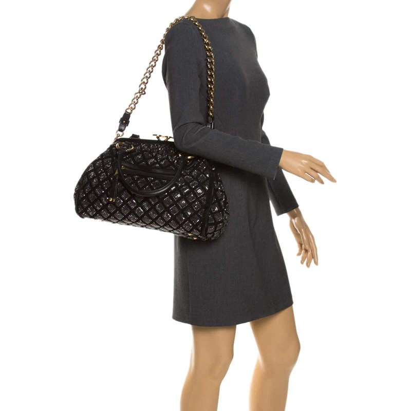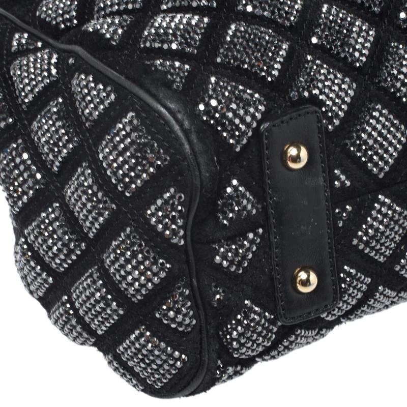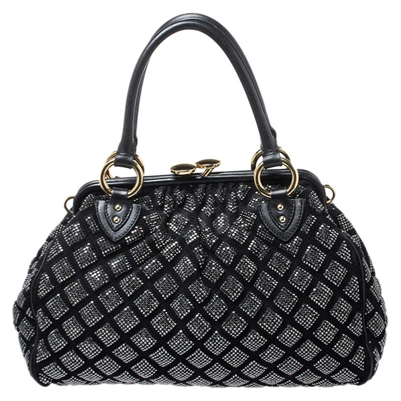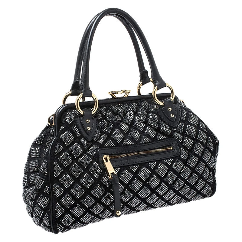 This Marc Jacobs design has a black quilted exterior crafted from suede and enhanced with gold-tone hardware and crystals. This elegant Stam bag features a kiss-lock top closure that opens to a fabric interior, dual top handles and a removable chain that converts this piece between shoulder and hand styles easily. Swing this beauty wherever you go and make heads turn!