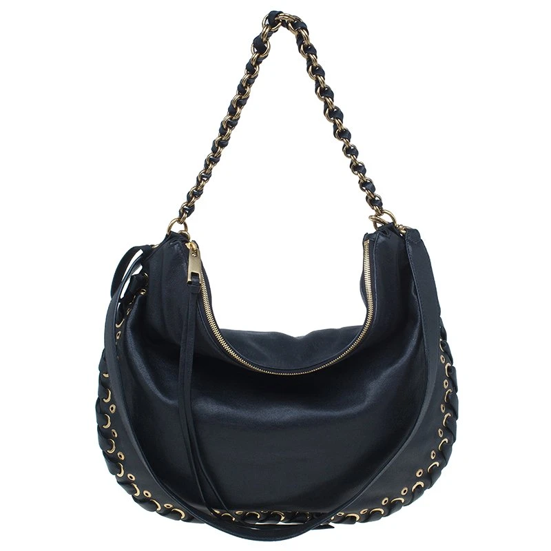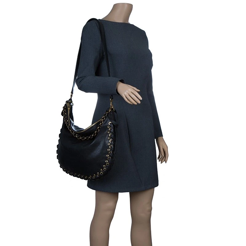 From the Spring 2014 collection, this Marc Jacob hobo is just beautiful. Crafted from black leather, it features laced-up leather sides and two ways to carry. It comes with gold-tone chain strap and a leather strap. Secured with a zip closure, the interior is fabric lined and has a zipper pocket.