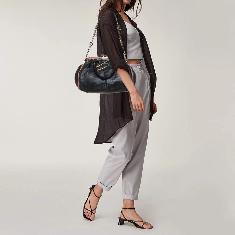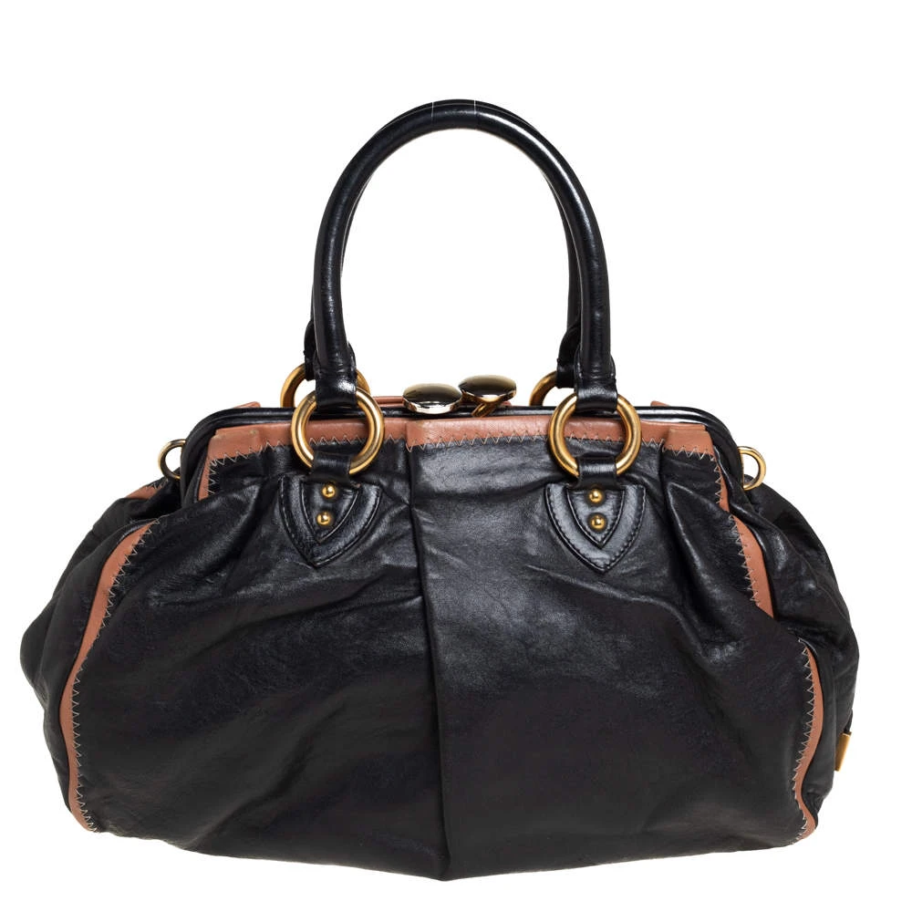 This Marc Jacobs design has a black exterior crafted from leather and enhanced with gold tone hardware. This elegant bag features a kiss-lock top closure that opens to a fabric interior, dual top handles and a removable chain that converts this piece between shoulder and hand styles easily. Swing this beauty wherever you go and make heads turn!
