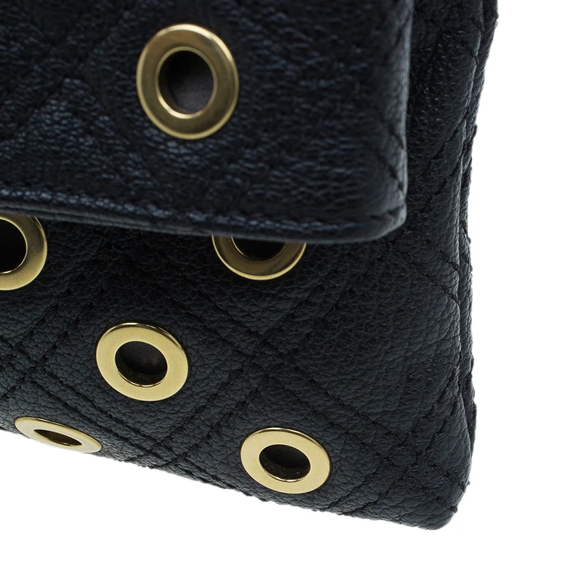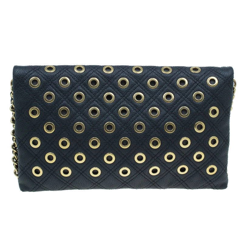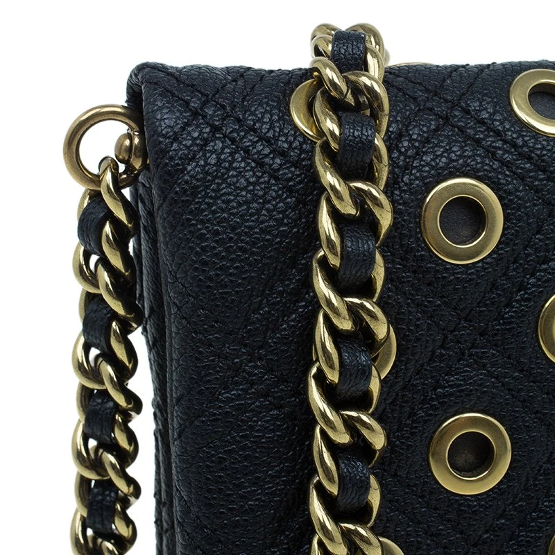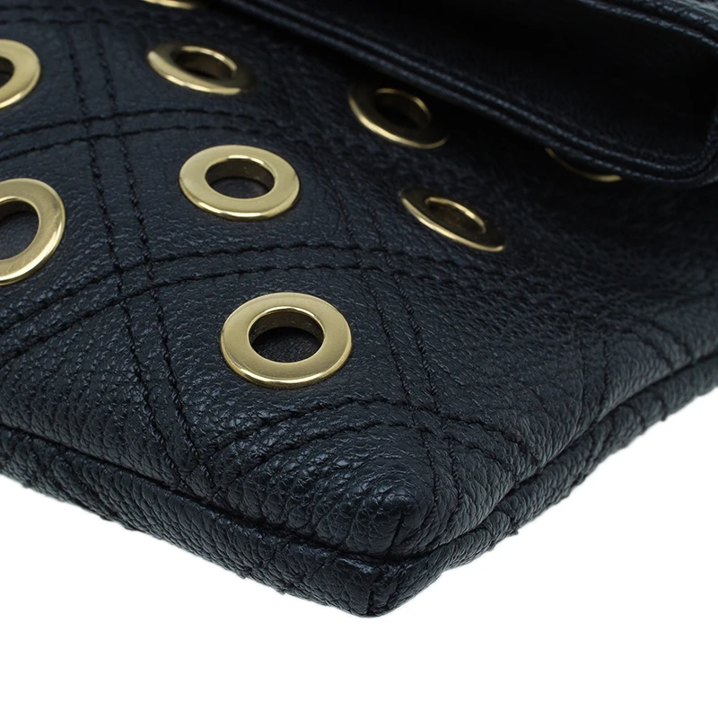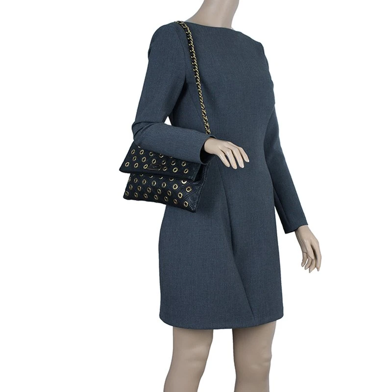 A little fun fused with elegance, this exquisite Marc Jacob’s Sandy shoulder bag is crafted from black leather. The exterior features leather woven chain removable strap and eyelets in gold tone detailing. The fold flap snap closure opens to a nylon lined interior housing two compartments and a zipped pocket.