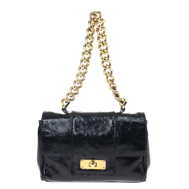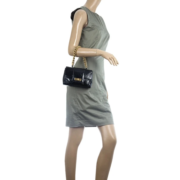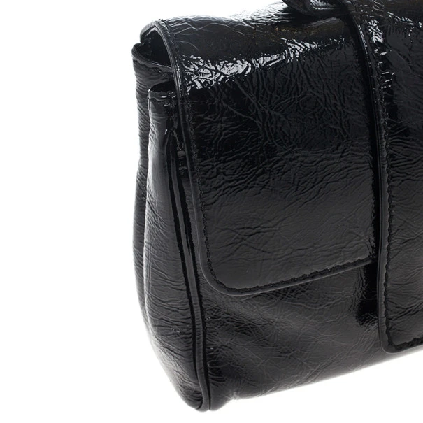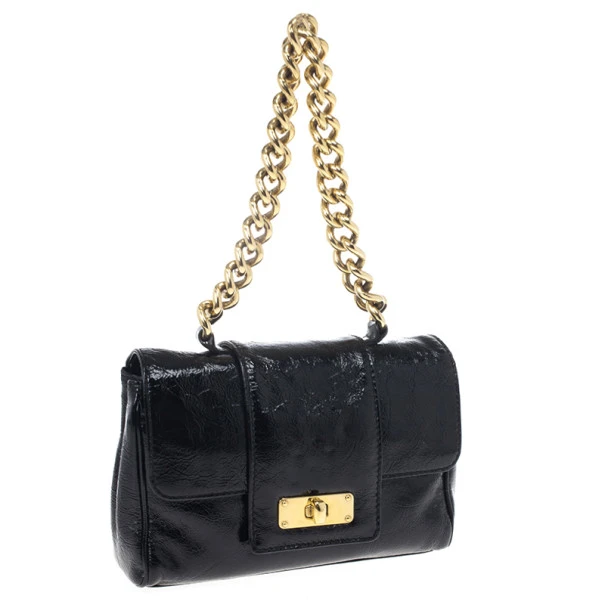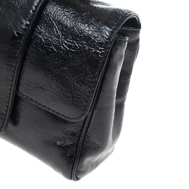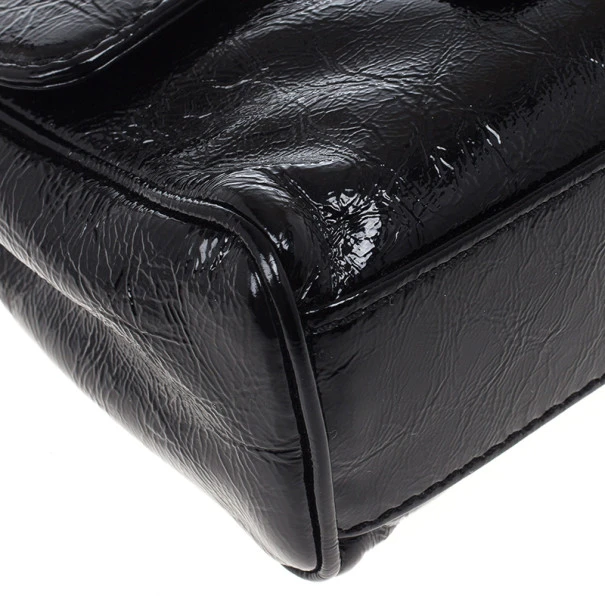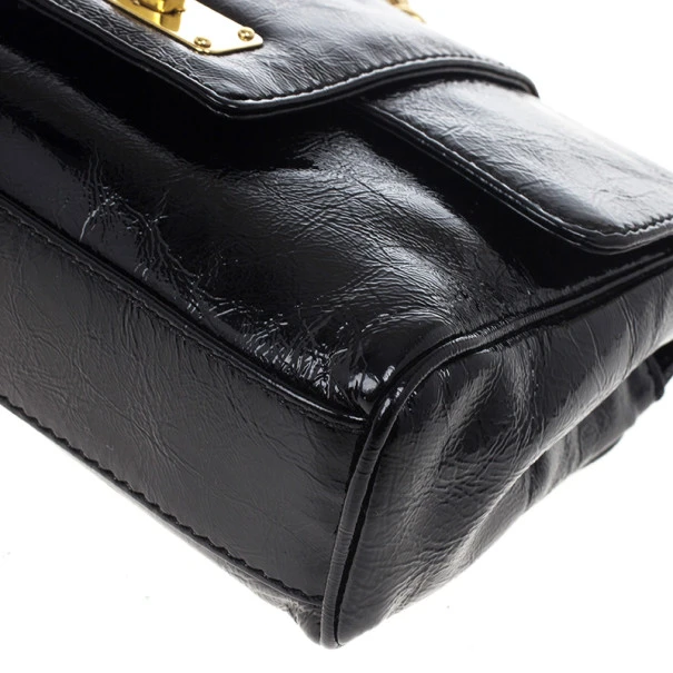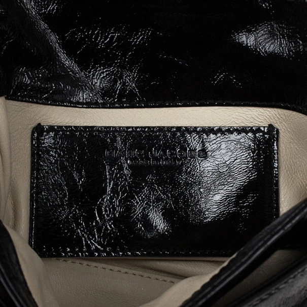 This ultra cute Marc Jacobs Black Patent Ursula Pochette is made from patent crackled black leather. It features a twist lock flap closure and a single chain link handle. The interior is lined with fabric and houses a patch pocket and a Marc Jacobs label. Original Retail Price:US $675