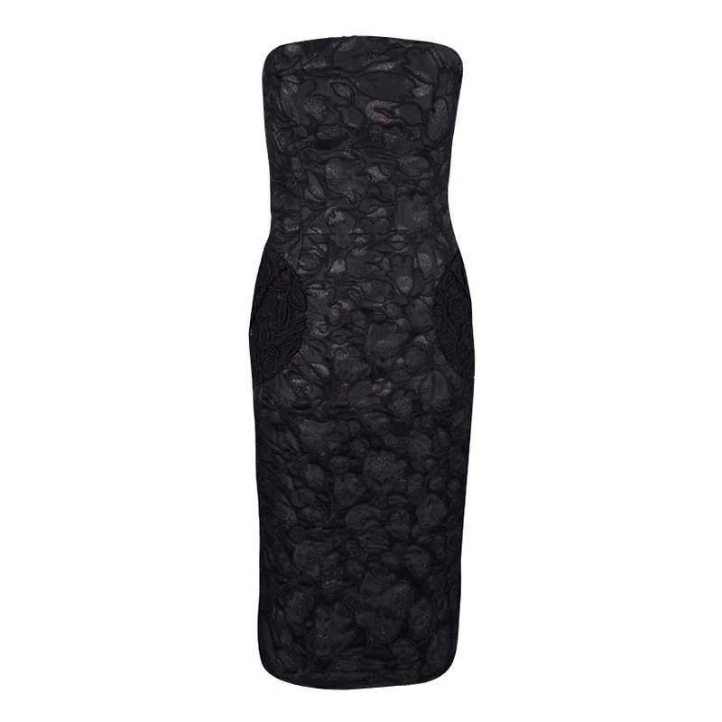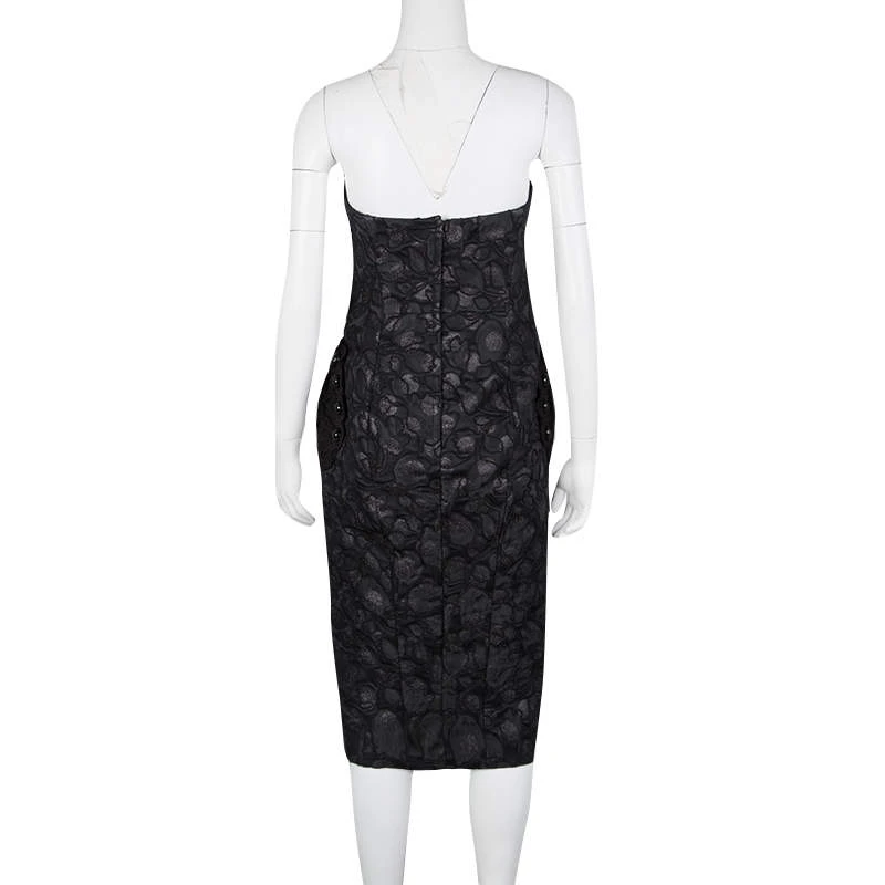 Marc Jacobs takes the classic retro beauty of the polka dot and combines it with the gorgeous detailing of the lace in this gorgeous strapless gown. This gown, with its incredible fit and the added pocket details, is a sure eye catcher in any event that you would be attending.