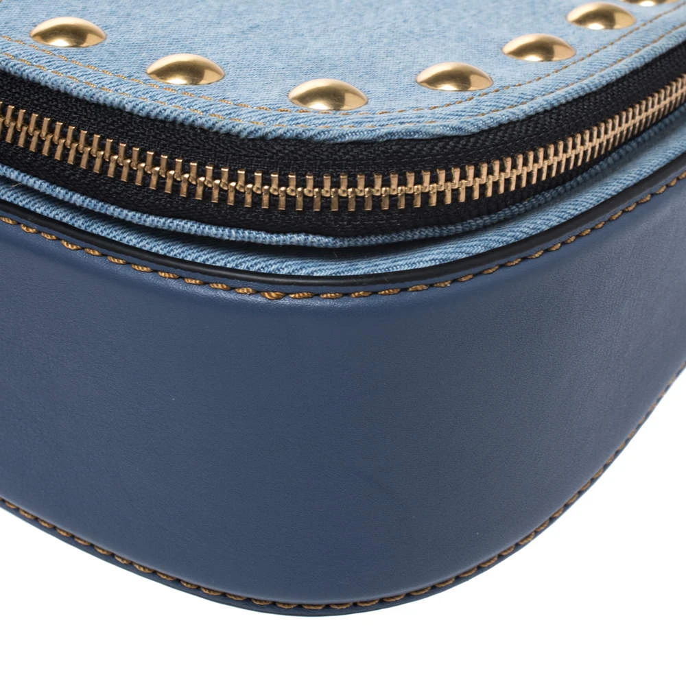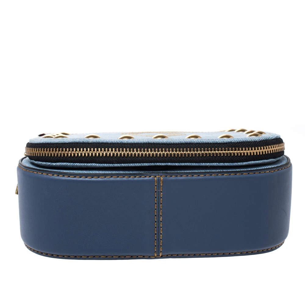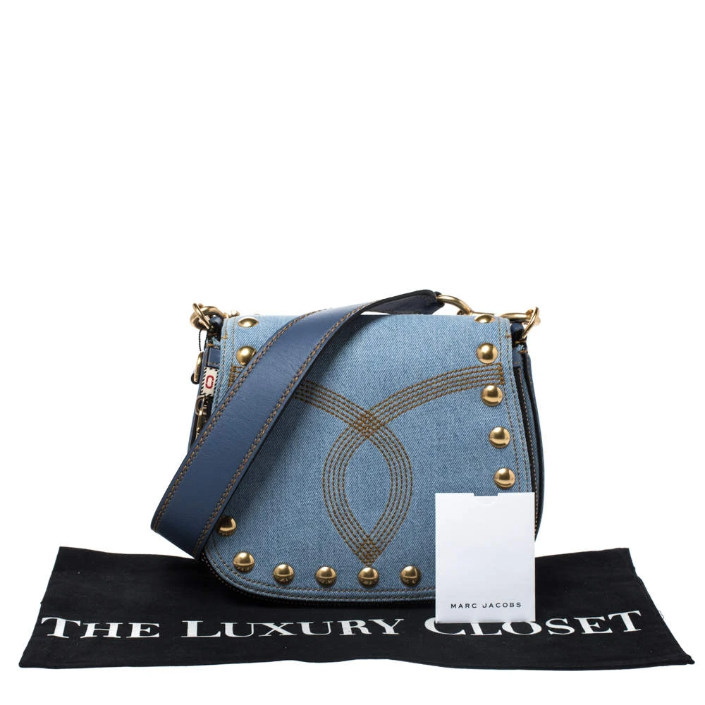 This Nomad crossbody bag from Marc Jacobs is not only visually appealing but is also quite durable. The blue bag is crafted from denim and leather and features a chic silhouette. It flaunts a front flap with a gold-tone zip around closure, neat stitch design and stud detailing on the edges. It comes equipped with a detachable shoulder strap and a fabric-lined spacious interior. Carry it with elan!
