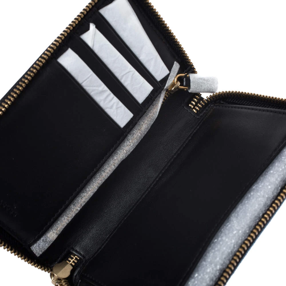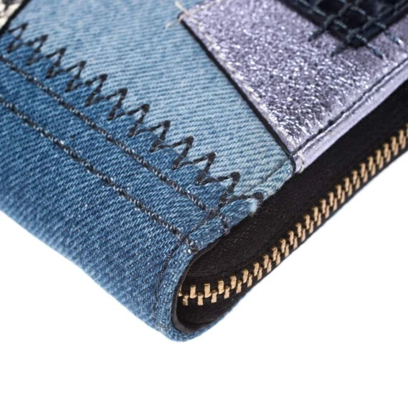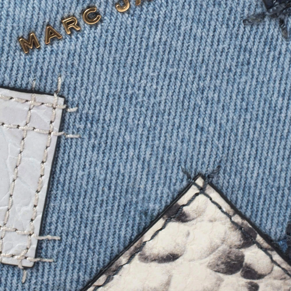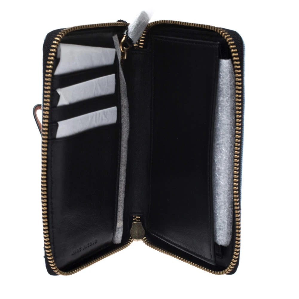 Store your daily essentials and put together a stylish look with this wallet from Marc Jacobs. It is crafted from denim fabric and features a patchwork detailed exterior that comes in lovely hues of blue. It has a zip closure that leads to a spacious fabric & leather interior. It is finished with a wristlet and gold-tone hardware.