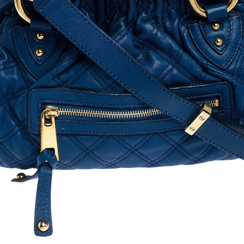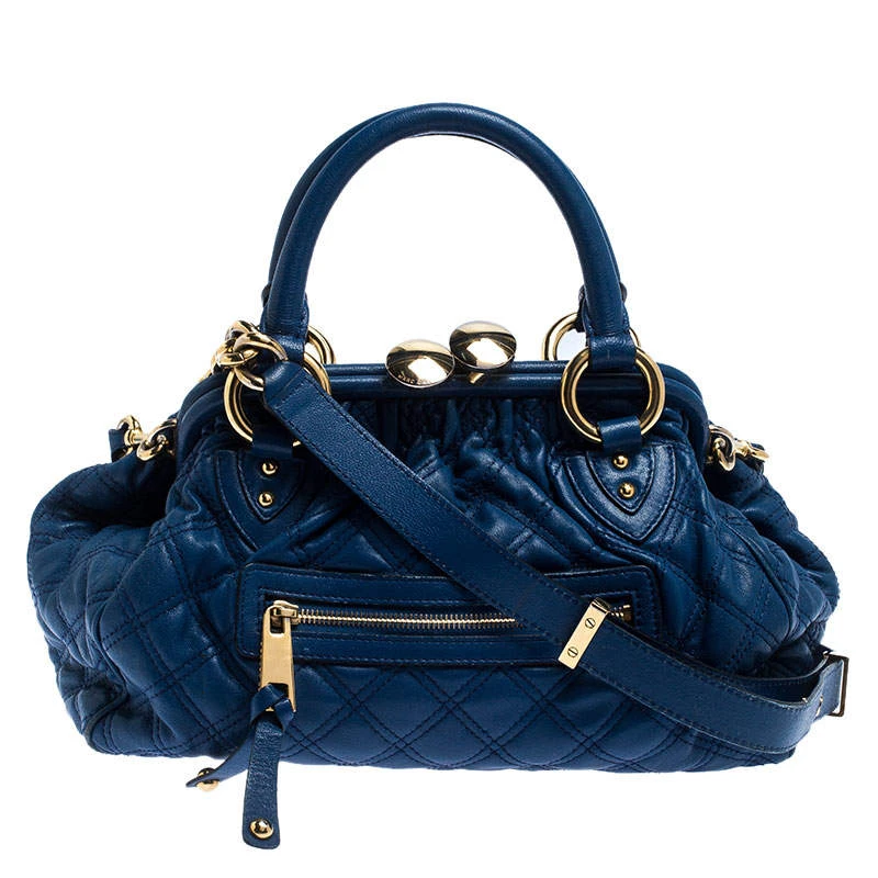 This Marc Jacobs design has a blue quilted exterior crafted from leather and is enhanced with gold-tone hardware. This elegant Stam bag features a kiss-lock top closure that opens to a canvas-lined interior, dual top handles and a removable shoulder strap that converts this piece between shoulder and hand styles easily. Swing this beauty wherever you go and make heads turn!