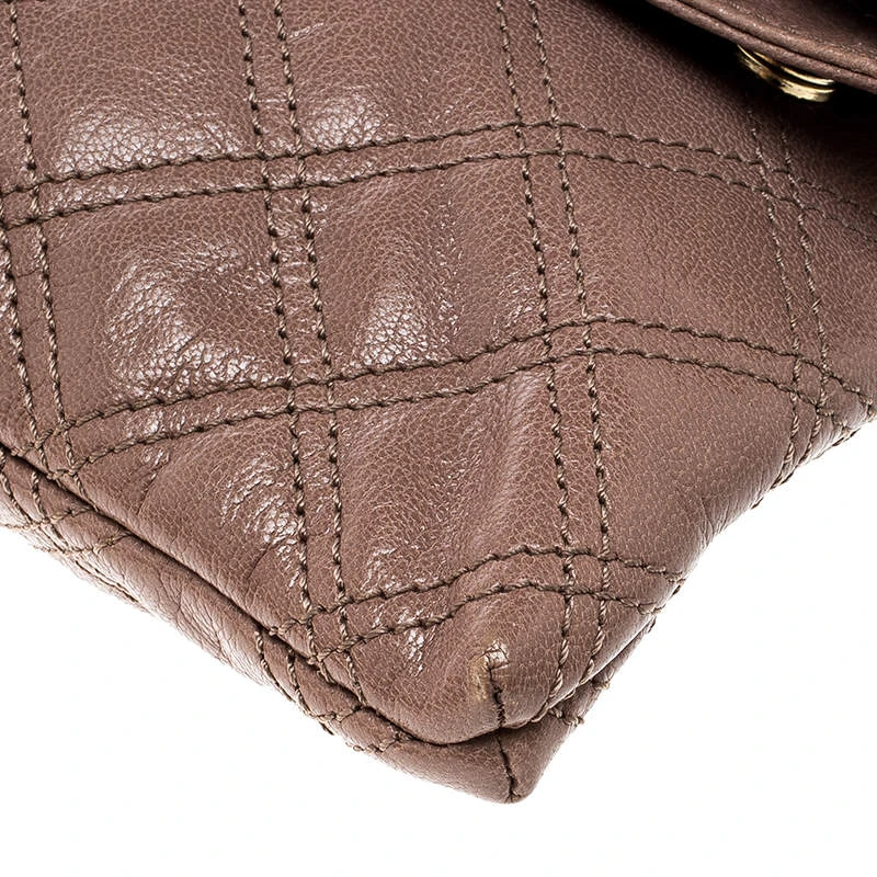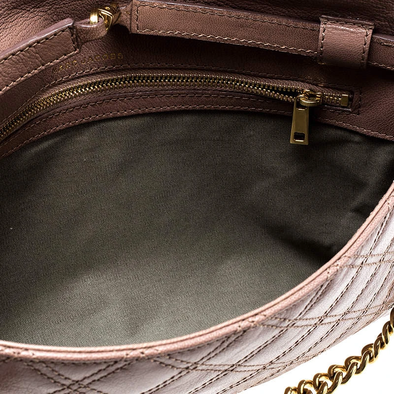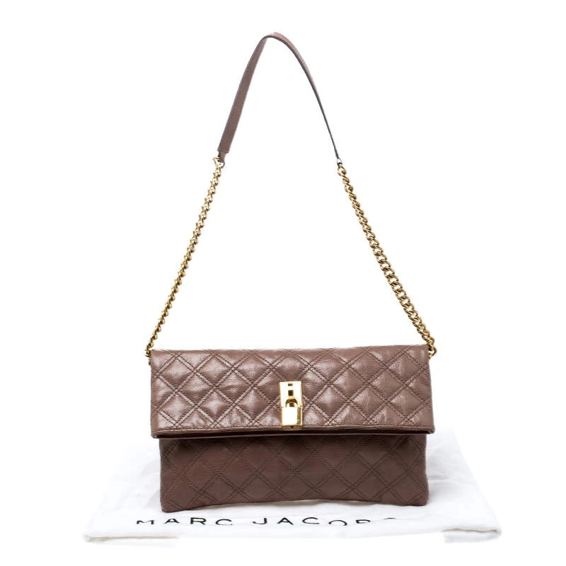 Covered in a timeless quilted pattern, this Eugenie clutch by Marc Jacobs comes in a flap style. It has a brown leather body with a padlock in gold tone on the flap, a canvas interior with a zip pocket and a chain with a leather shoulder rest.