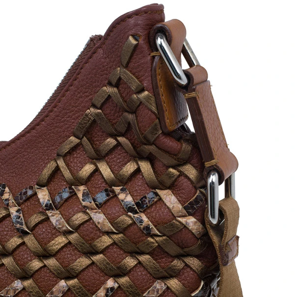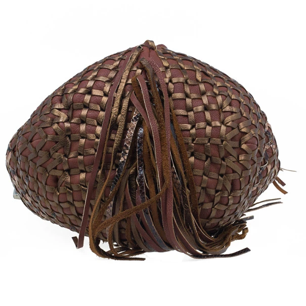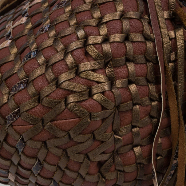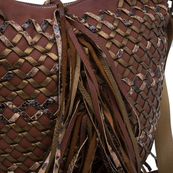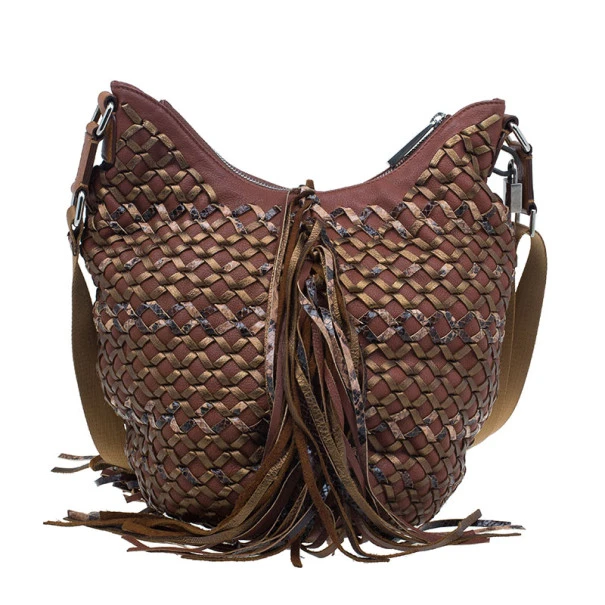 This is not your everyday hobo bag, it is a very unique creation by Marc Jacobs and will definitely make your outfits more interesting! It features a brown woven leather exterior with a large leather fringe in the front and a thick adjustable strap. It’s top zip closure opens up to a satin lined interior with an open pocket.