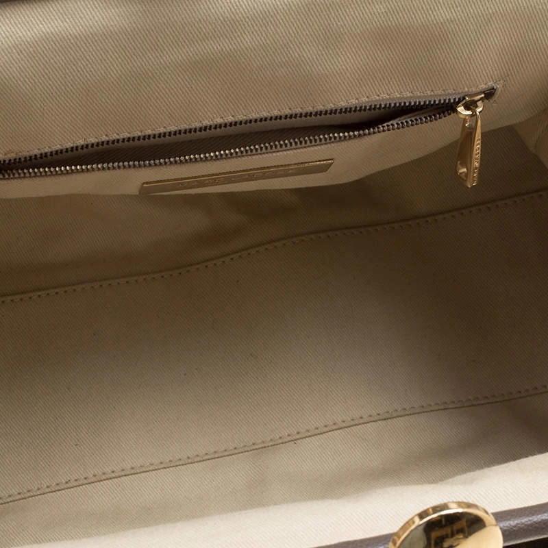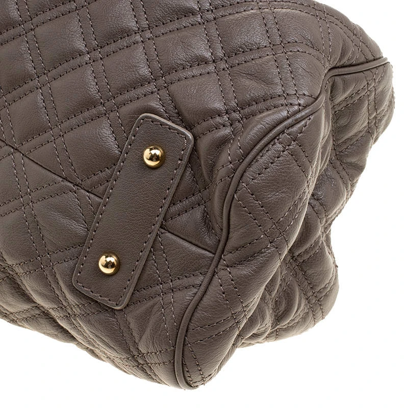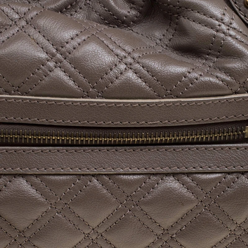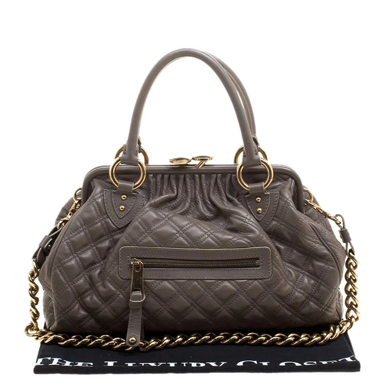 This Marc Jacobs design has a dark beige quilted exterior crafted from leather and gold-tone hardware. The elegant Stam bag features a kiss-lock top closure that opens to a fabric interior, a front zipper, dual handles and a shoulder chain. Swing this beauty wherever you go and make heads turn!