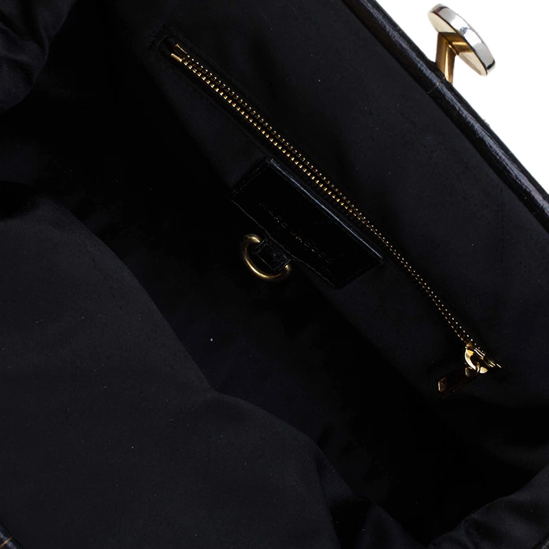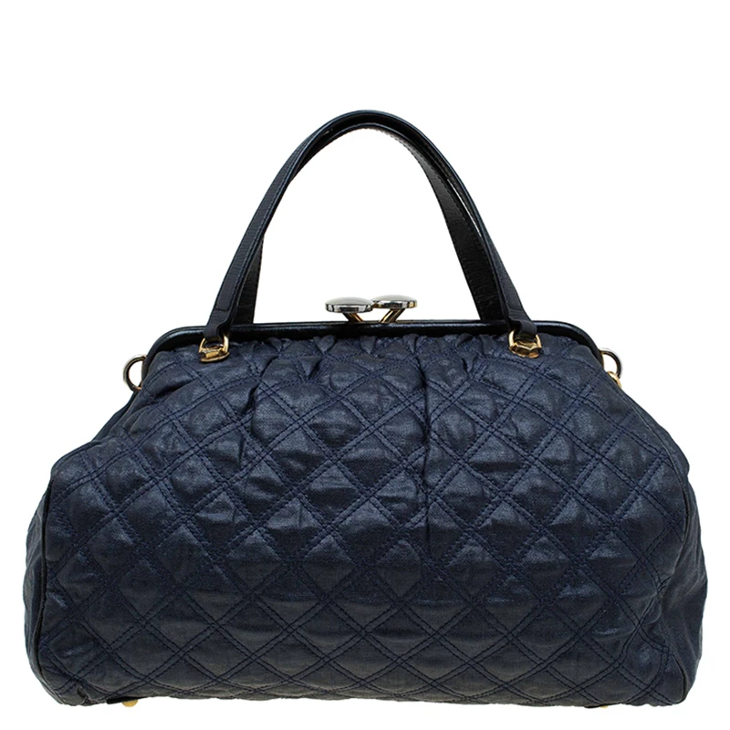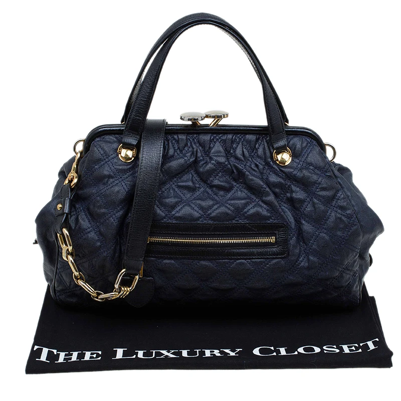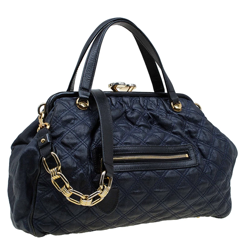 This Marc Jacobs Stam Satchel is crafted in gorgeous dark blue quilted canvas. It features flat leather handles, gold-tone chain link strap and kissing clasp closure. It opens up to a satin-lined interior with zippered wall pocket. Carry it by the shoulder strap or on the crook of your arm.