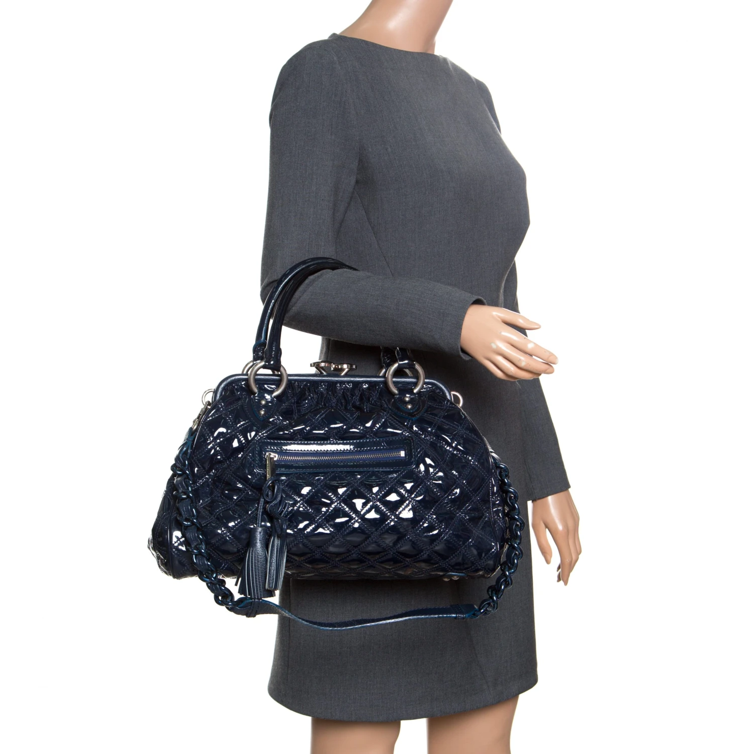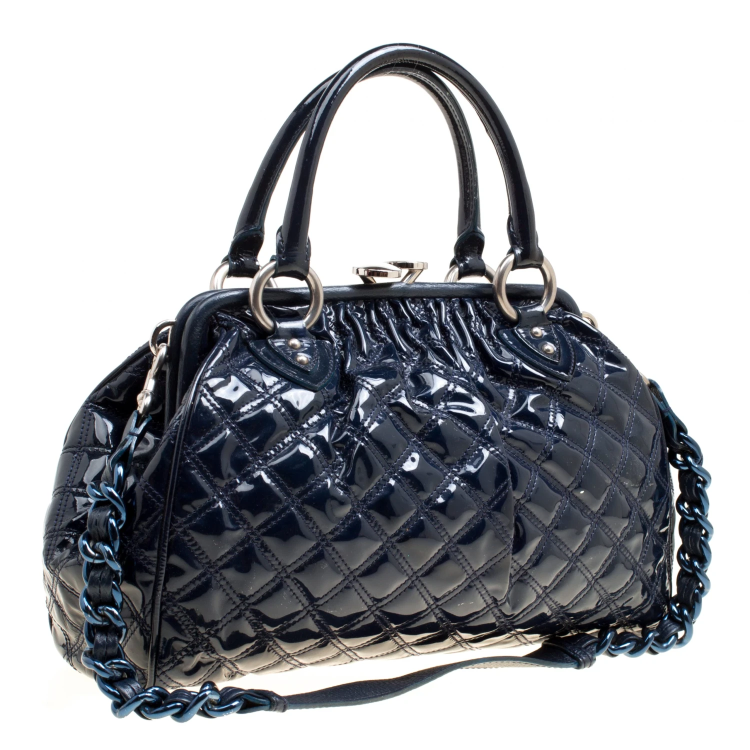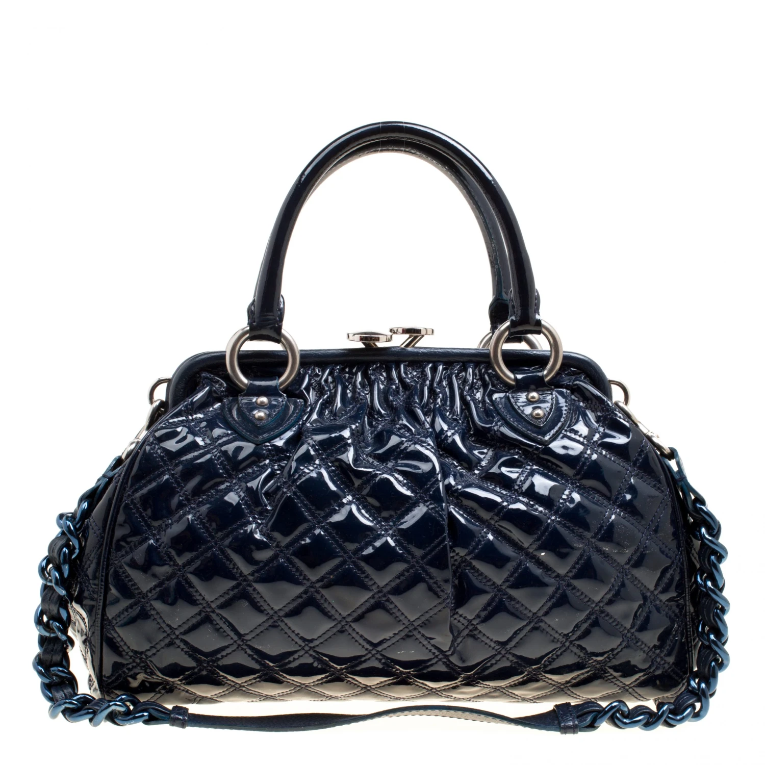 This Marc Jacobs design has a dark blue quilted exterior crafted from patent leather and enhanced with gold-tone hardware. This elegant Stam bag features a kiss-lock top closure that opens to a fabric interior and dual top handles.