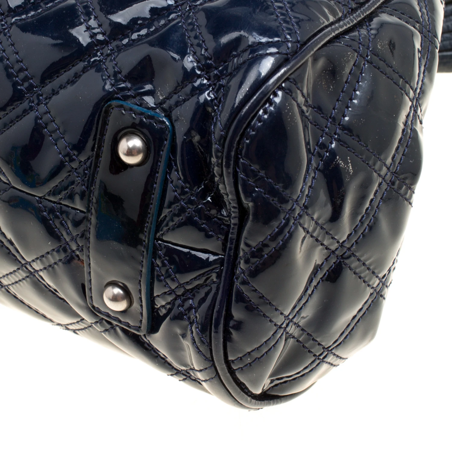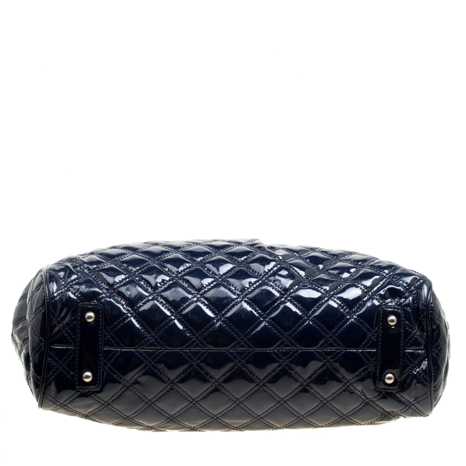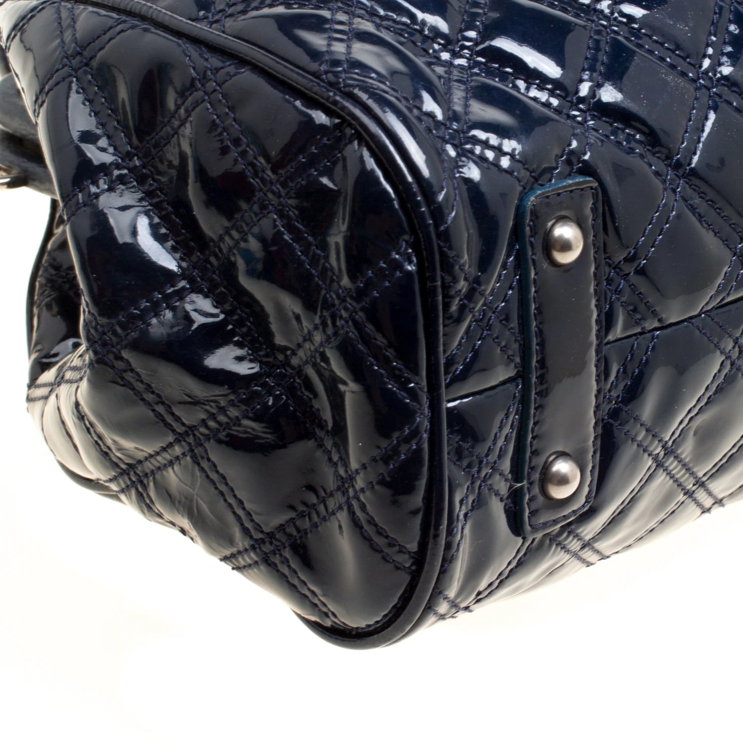 This Marc Jacobs design has a dark blue quilted exterior crafted from patent leather and enhanced with gold-tone hardware. This elegant Stam bag features a kiss-lock top closure that opens to a fabric interior and dual top handles.