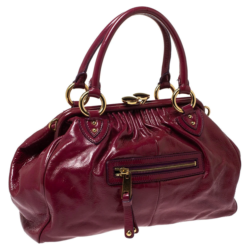 This Marc Jacobs design is perfect for a high fashion look that doesn’t let you compromise on practicality. It has an exterior crafted from patent leather featuring a quilted pattern all over and gold-tone hardware. The elegant Stam bag features a kiss-lock top closure that opens to a satin interior, a front zipper, dual handles and a shoulder chain with leather shoulder rest. Swing this dark pink beauty wherever you go and make heads turn!