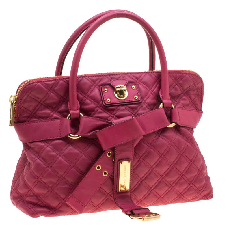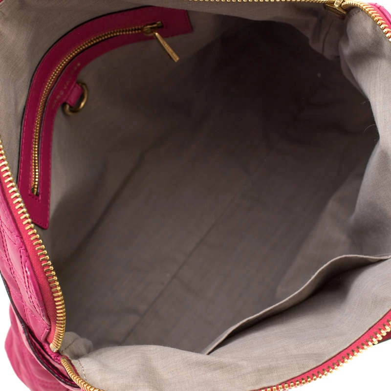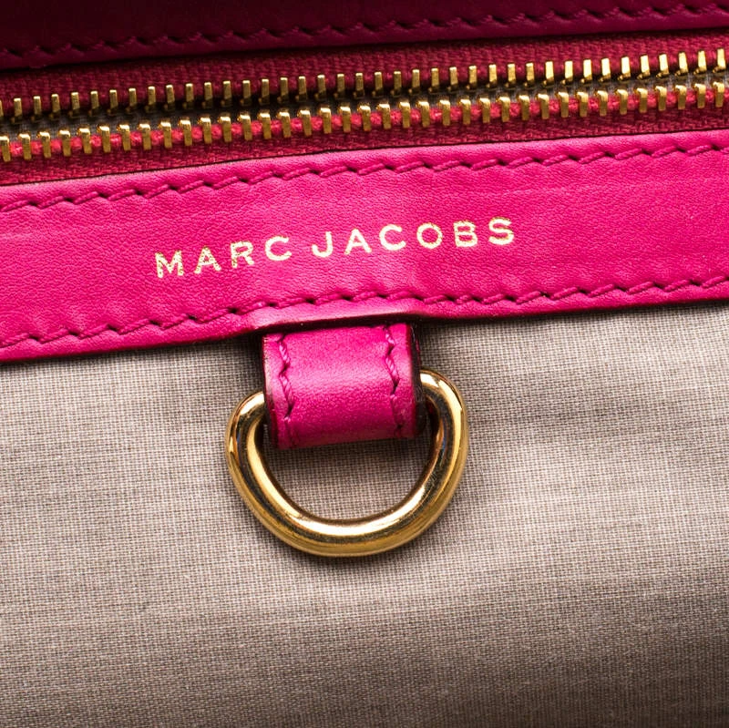 This colorful and chic tote from Marc Jacobs is flamboyance personified. Crafted from leather, it features a quilted exterior in dark pink and enhanced with knotted belt applique detailed with gold-tone Marc Jacobs plaque on the front. The bag comes with twin rolled handles, zip closure at the top, and a gold-tone push-button motif at the front face. Its fabric lined interior has one zip and one slip pocket.