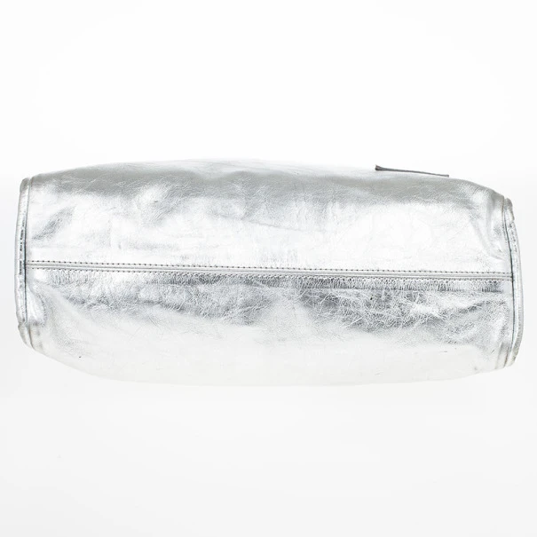 This ultra cool and structured bag by Marc Jacobs will have your look transformed. Made from metallic silver crackled leather, it’s equipped with two rolled leather handles. The exterior is accented with triple pyramid stud detailing. The interior is enclosed with a lobster clasp closure and features a zipper pocket.Original Retail Price: US $1,350