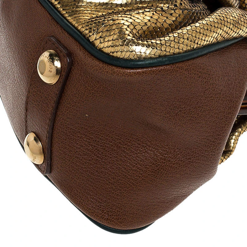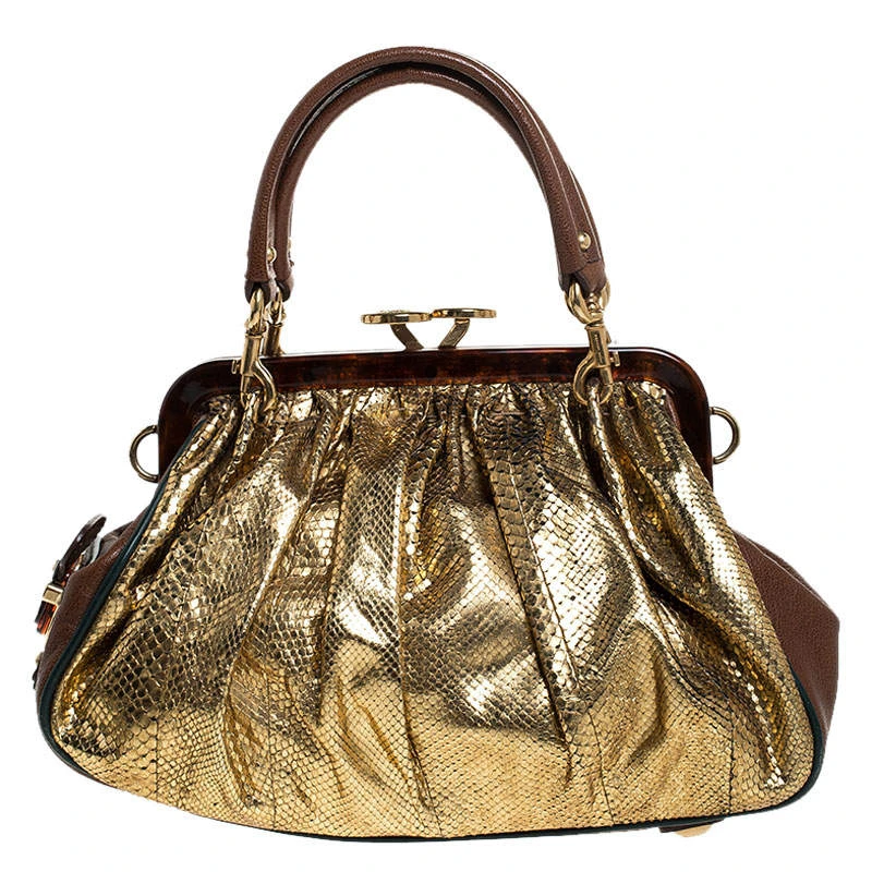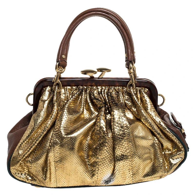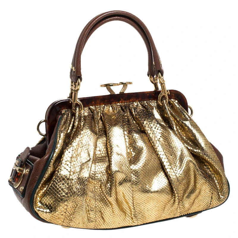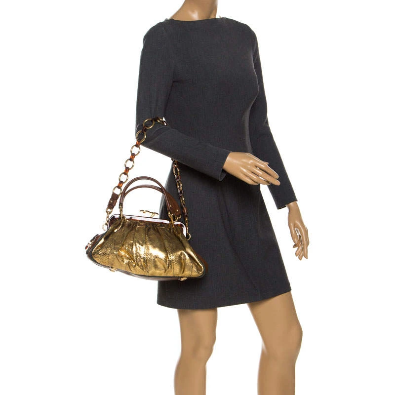 This Marc Jacobs design has a gold quilted exterior crafted from snakeskin and enhanced with gold-tone hardware. This elegant Stam bag features a kiss-lock top closure that opens to a suede interior, a top handle and a removable chain that converts this piece between shoulder and hand styles easily. Swing this beauty wherever you go and make heads turn!