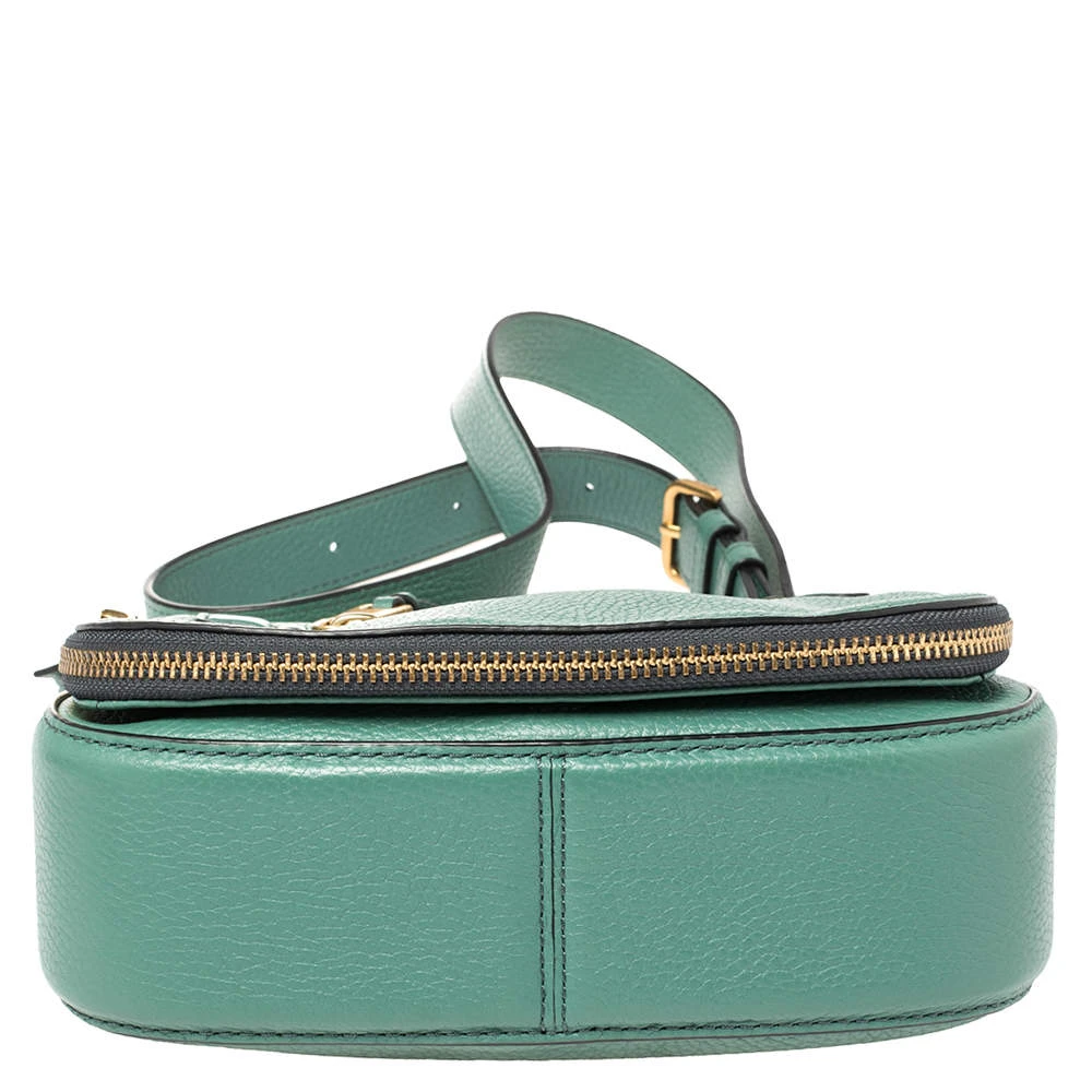 This chic and contemporary Recruit Nomad saddle bag from Marc Jacobs will help you outline a stylish look and outshine everyone else! It is crafted from green leather and adorned with gold-tone hardware. It features a front zip pocket and a zipper closure at the bottom. The flap opens to a spacious fabric-lined interior that houses a zip pocket and an open compartment. The bag is equipped with a shoulder strap and is sure to be an amazing buy.