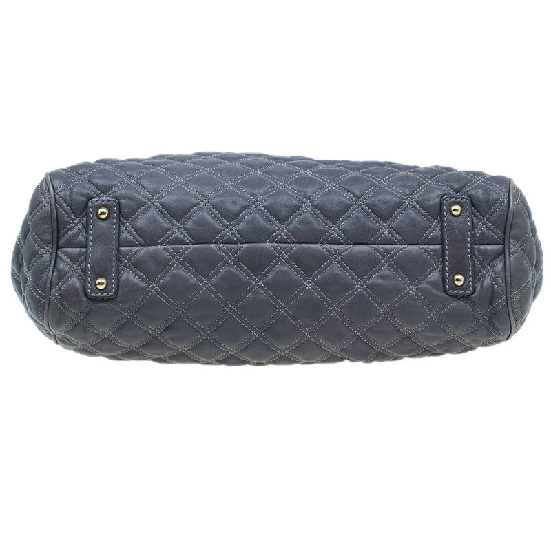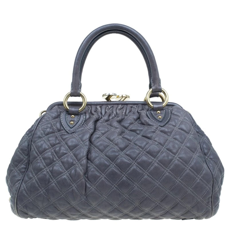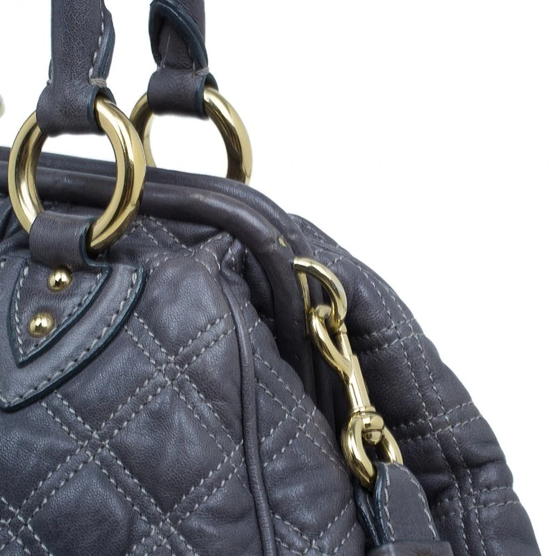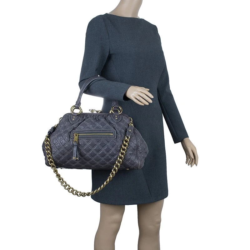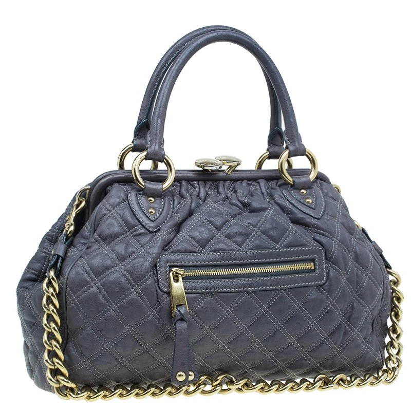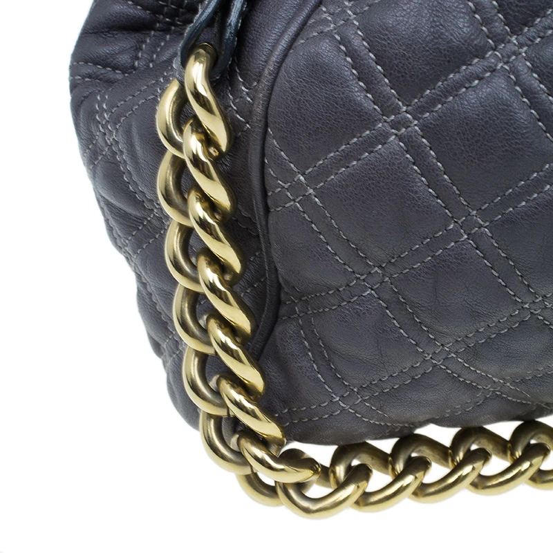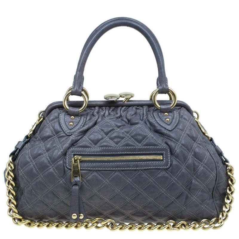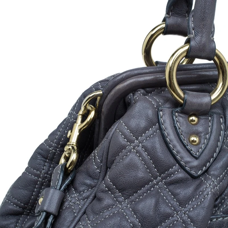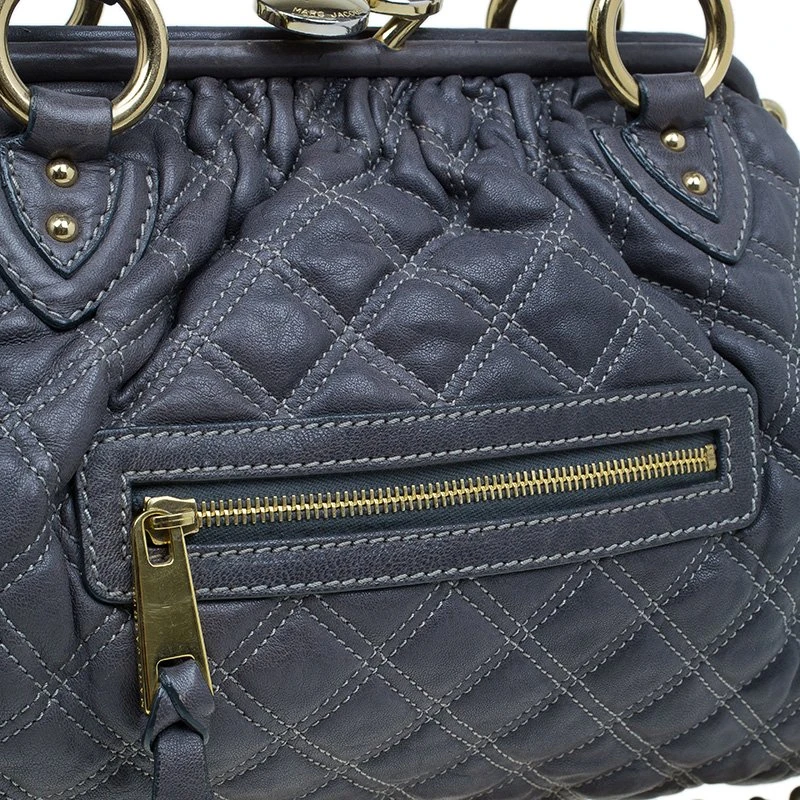 Named after the beautiful Jessica Stam, the Stam is one of the most wanted ‘it’ bags from Marc Jacobs. This version of the bag is crafted from grey quilted stitched leather that is detailed with a structured upper, thick gold-tone chain-link shoulder strap, top rolled handles, kiss-lock closure and a front zip pocket. The interior is lined with fabric and features a zip pocket.
