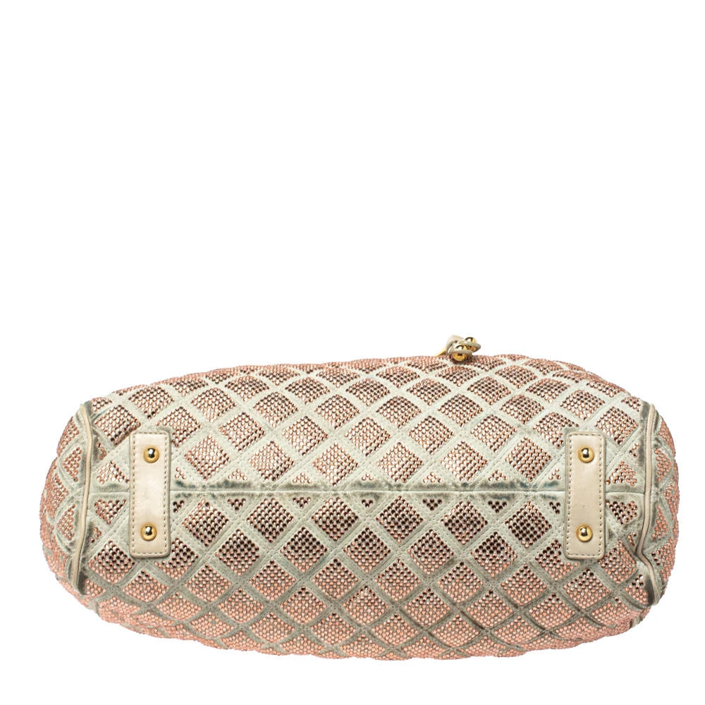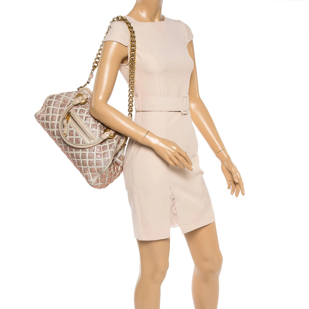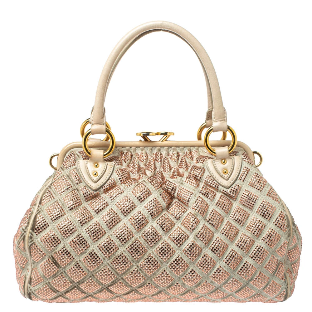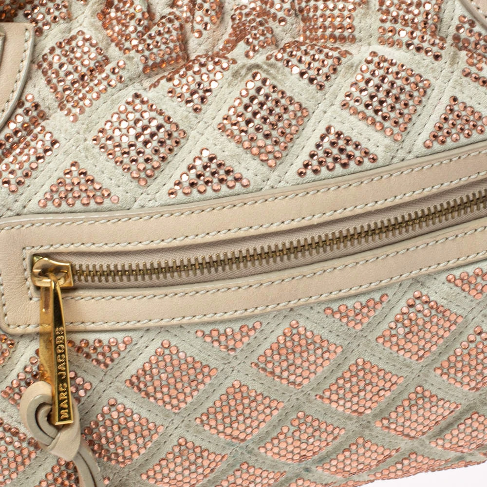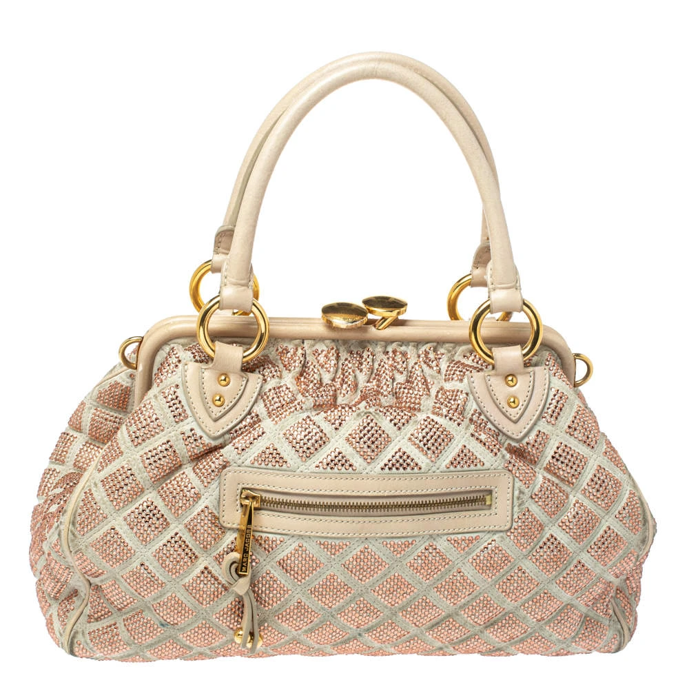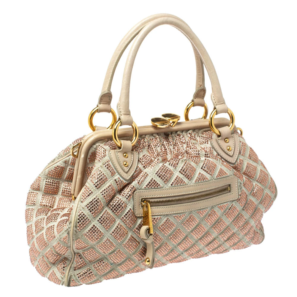 This Marc Jacobs design has a ivory exterior crafted from embellished suede and enhanced with gold-tone hardware. This elegant Stam bag features a kiss-lock top closure that opens to a satin interior, dual top handles and a removable chain that converts this piece between shoulder and hand styles easily. Swing this beauty wherever you go and make heads turn!