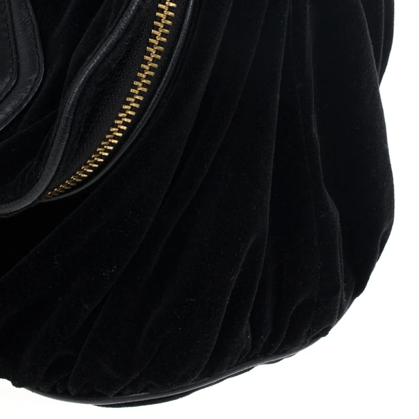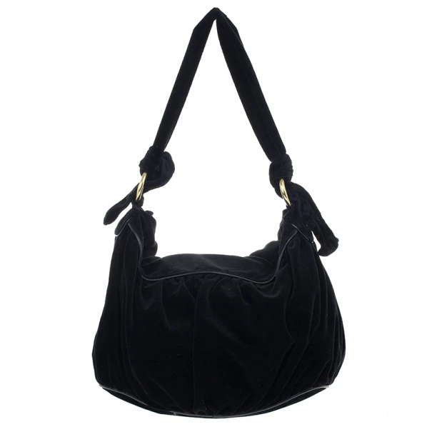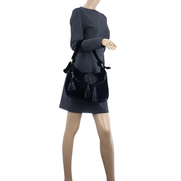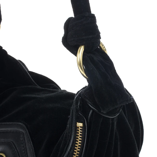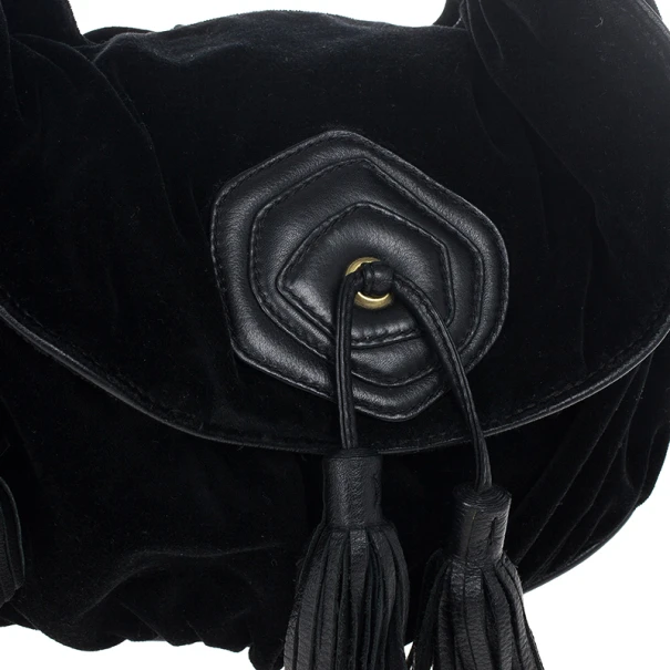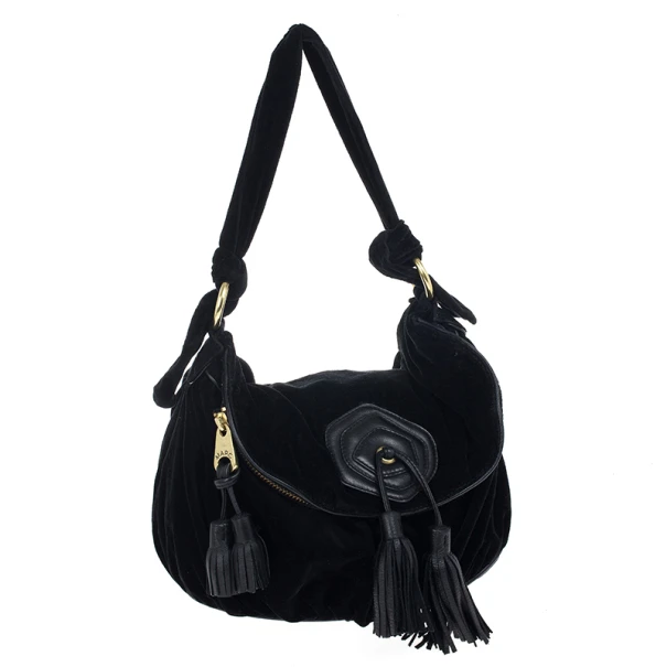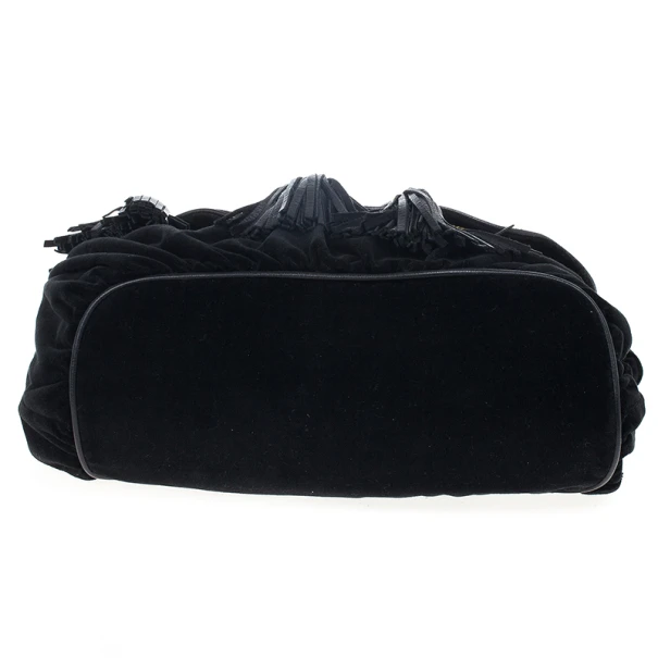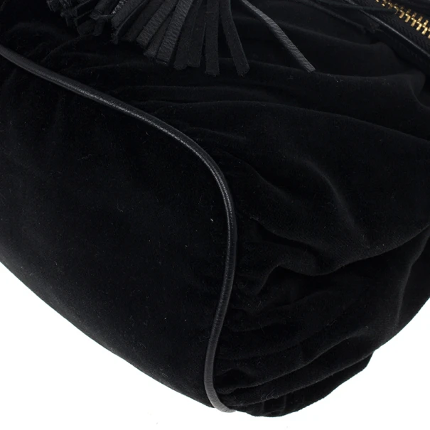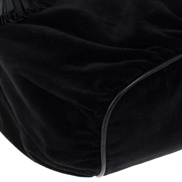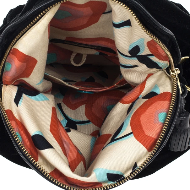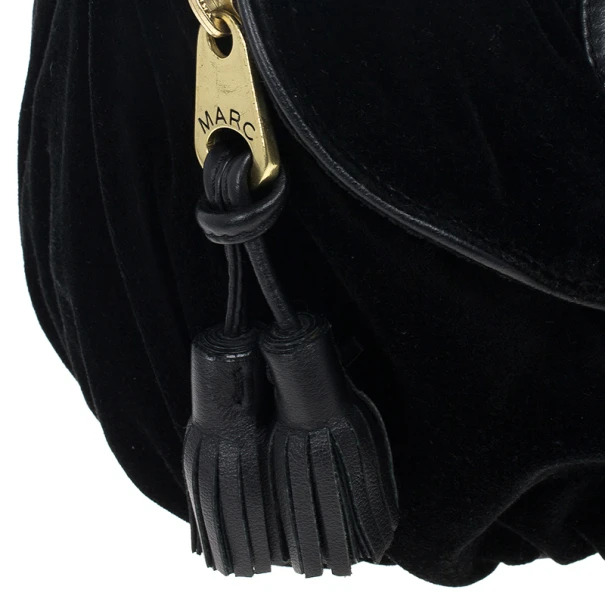 This slouchy and fun Marc by Marc Jacobs bag is made from soft velvet. The flap closure is accented with leather tassels. The top zipper closure comes with a leather tassel zipper pull. The printed canvas lined interior has one button pocket.Original Retail Price: US $278