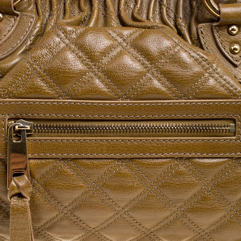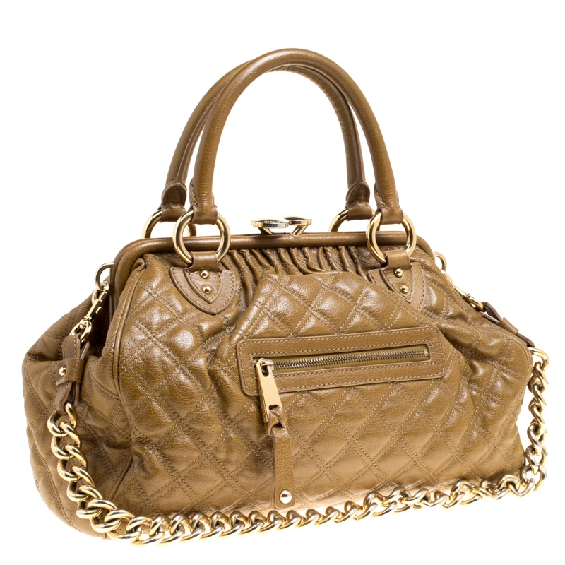This Marc Jacobs design has a quilted exterior crafted from leather and gold-tone hardware. The elegant Stam bag features a kiss-lock top closure that opens to a fabric interior, a front zipper, dual handles and a shoulder chain. Swing this beauty wherever you go and make heads turn!