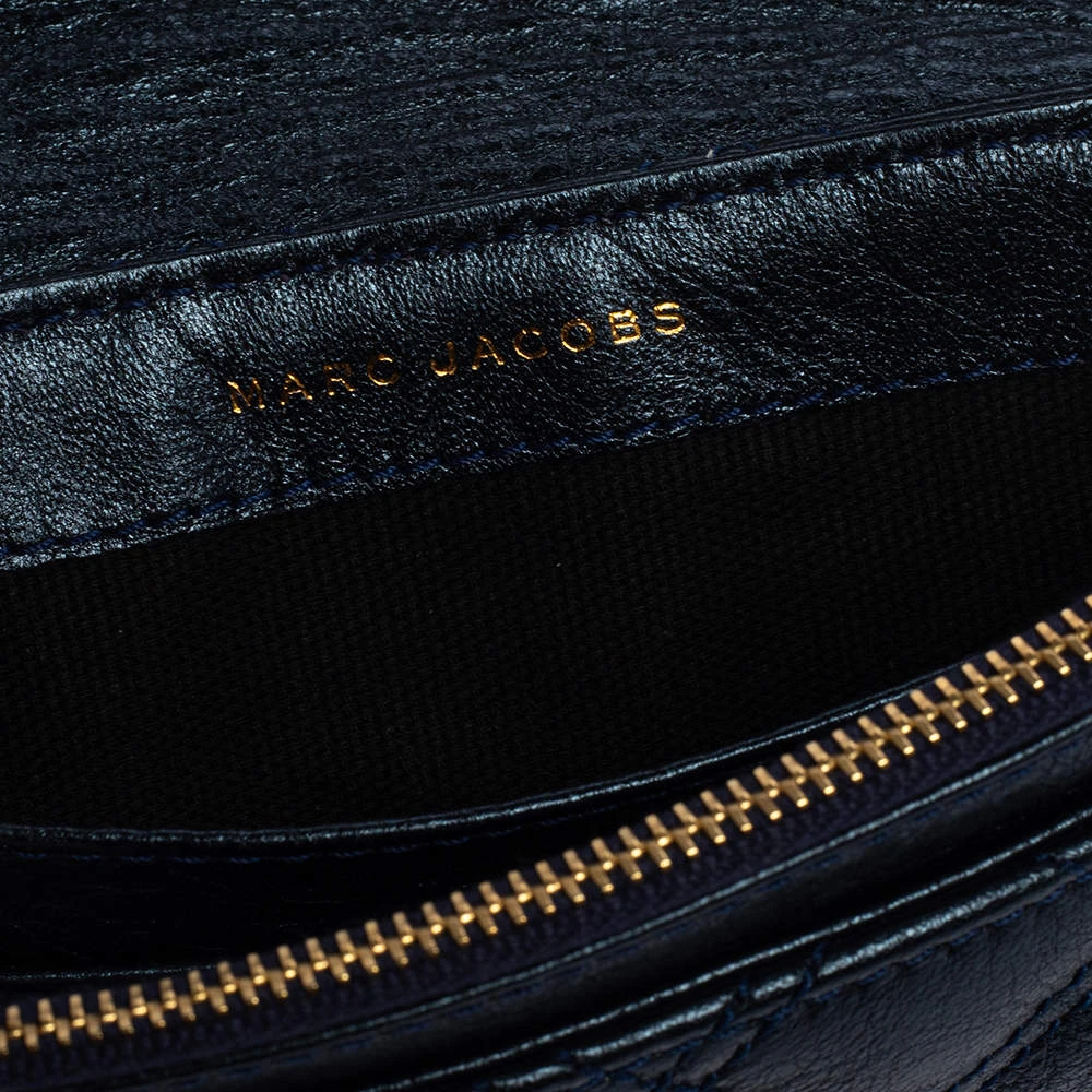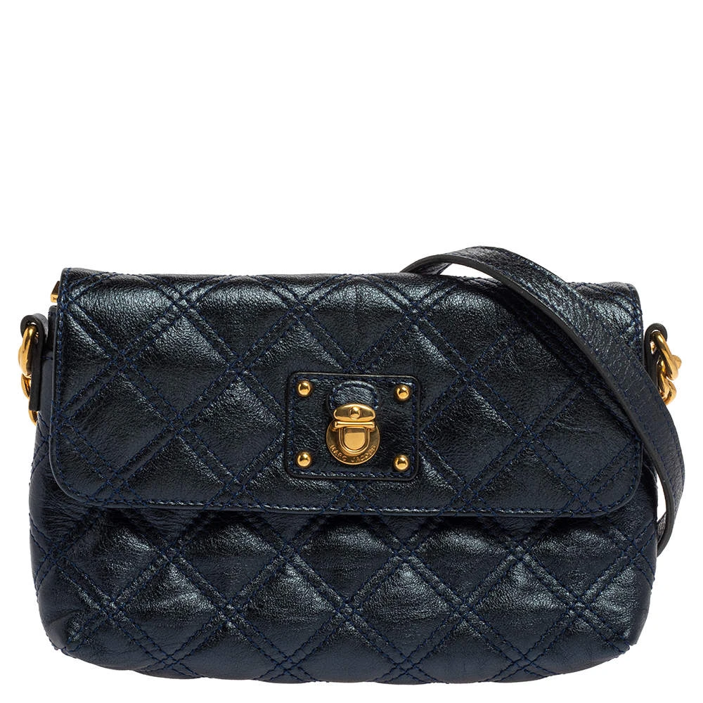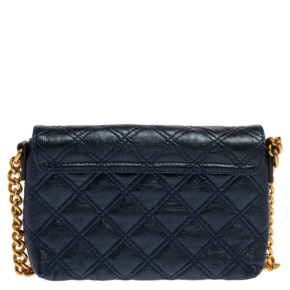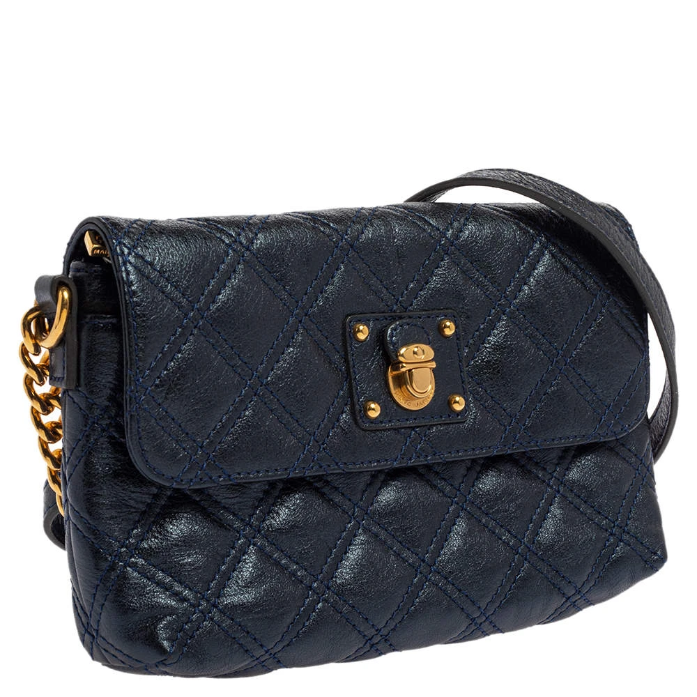 Utterly gorgeous and extremely stylish, this metallic blue bag from Marc Jacobs deserves to be yours! It has been crafted from leather in a quilted design and styled with an engraved gold-tone push-lock detail on the front flap. It opens to a canvas-lined interior that can easily accommodate your daily essentials and is held by a chain-link and leather shoulder strap. Go ahead and make it yours today.