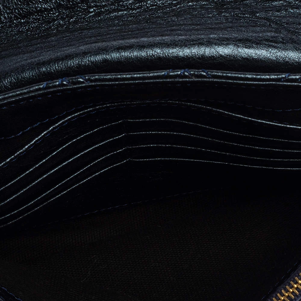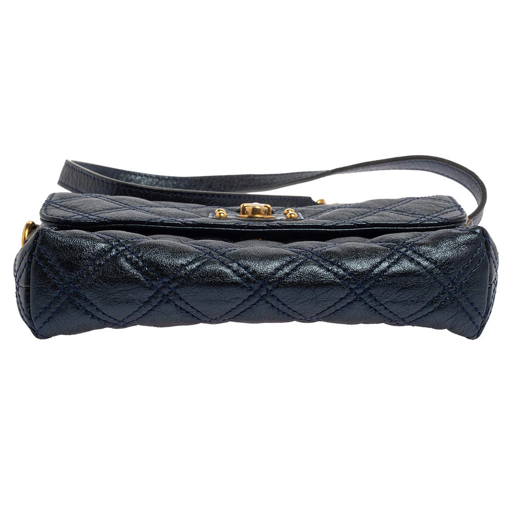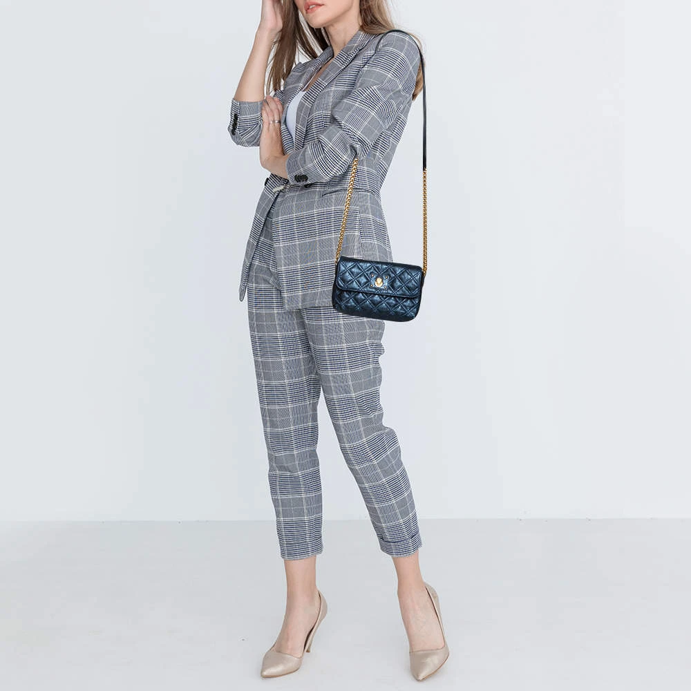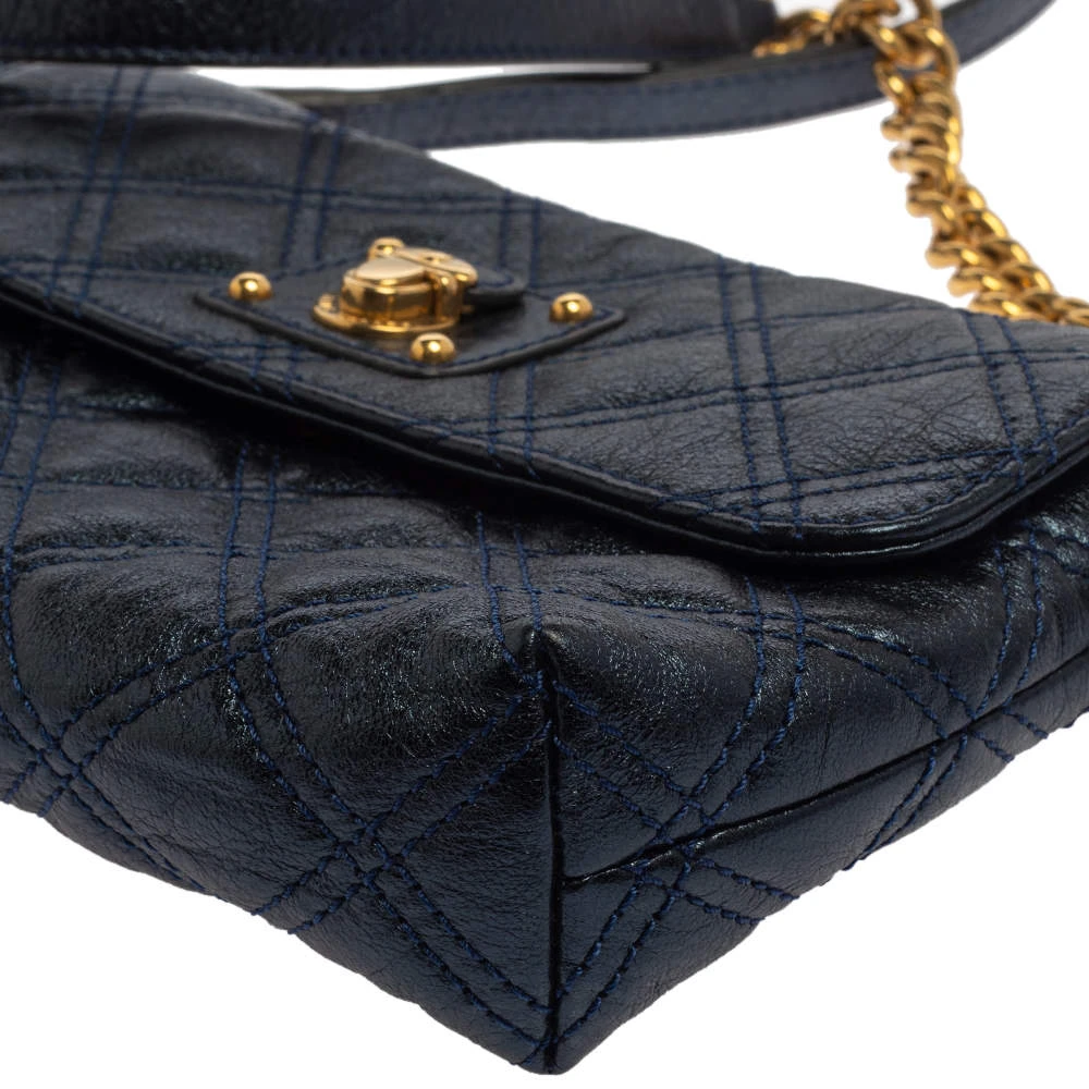 Utterly gorgeous and extremely stylish, this metallic blue bag from Marc Jacobs deserves to be yours! It has been crafted from leather in a quilted design and styled with an engraved gold-tone push-lock detail on the front flap. It opens to a canvas-lined interior that can easily accommodate your daily essentials and is held by a chain-link and leather shoulder strap. Go ahead and make it yours today.