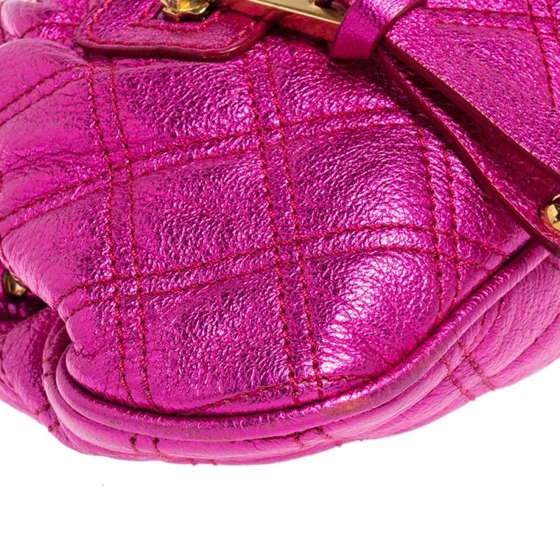 This is the Little Stam bag from Marc Jacobs’ famous Stam collection. The quilted creation is made from premium quality leather and chunky gold-tone hardware. It has a kiss lock closure at the top and a fabric interior. This fuchsia shoulder bag is perfectly sized for everyday use.