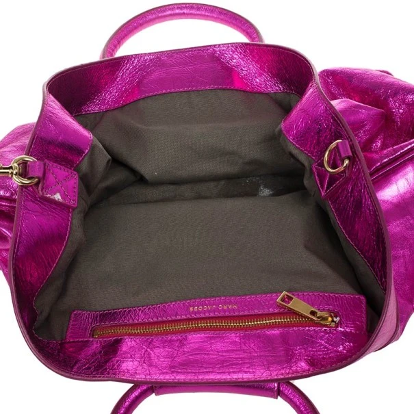This ultra cool and structured bag by Marc Jacobs will have your look transformed. Made from metallic pink crackled leather, it’s equipped with two rolled leather handles. The exterior is accented with triple pyramid stud detailing. The interior is enclosed with a lobster clasp closure and features a zipper pocket.