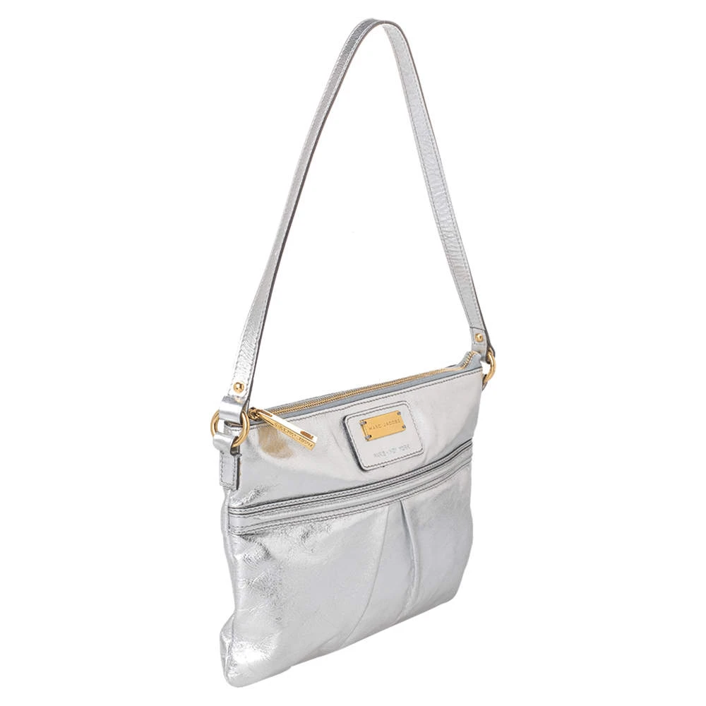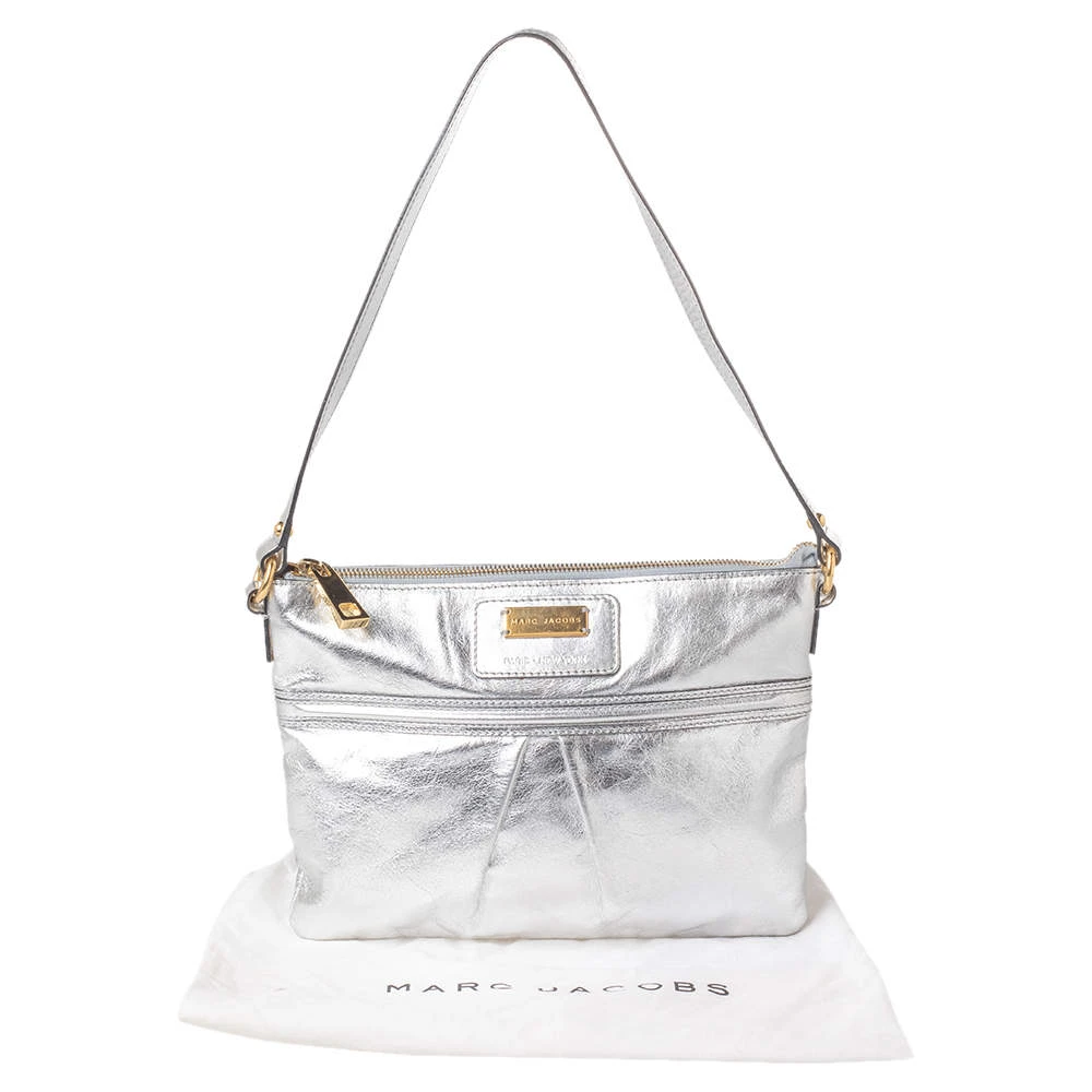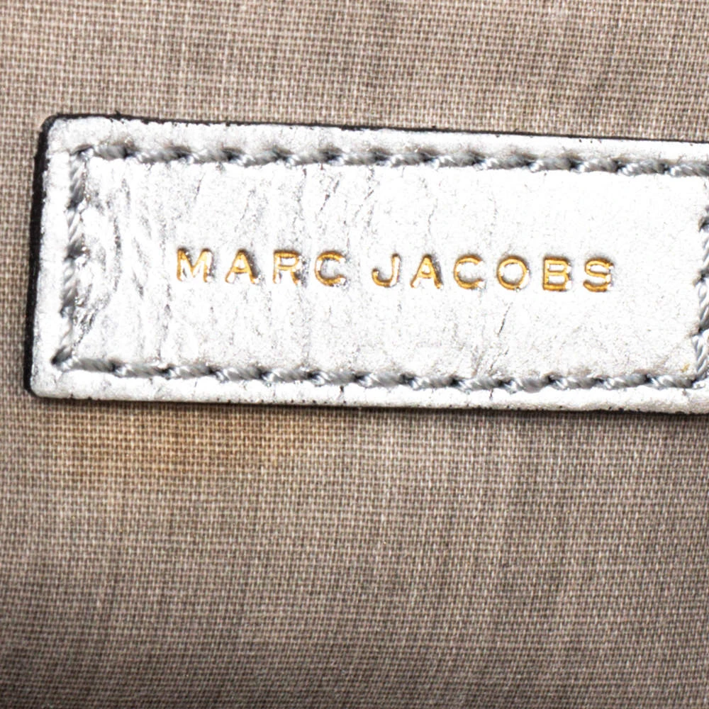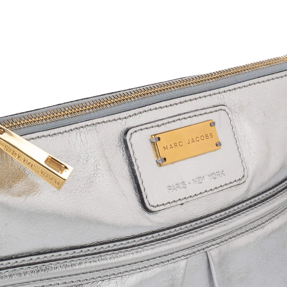 This women’s clutch from Marc Jacobs has been made using leather. It has the brand plaque at the front and a lined interior secured by a top zip closure. This metallic silver clutch has a simple shape and a durable quality.