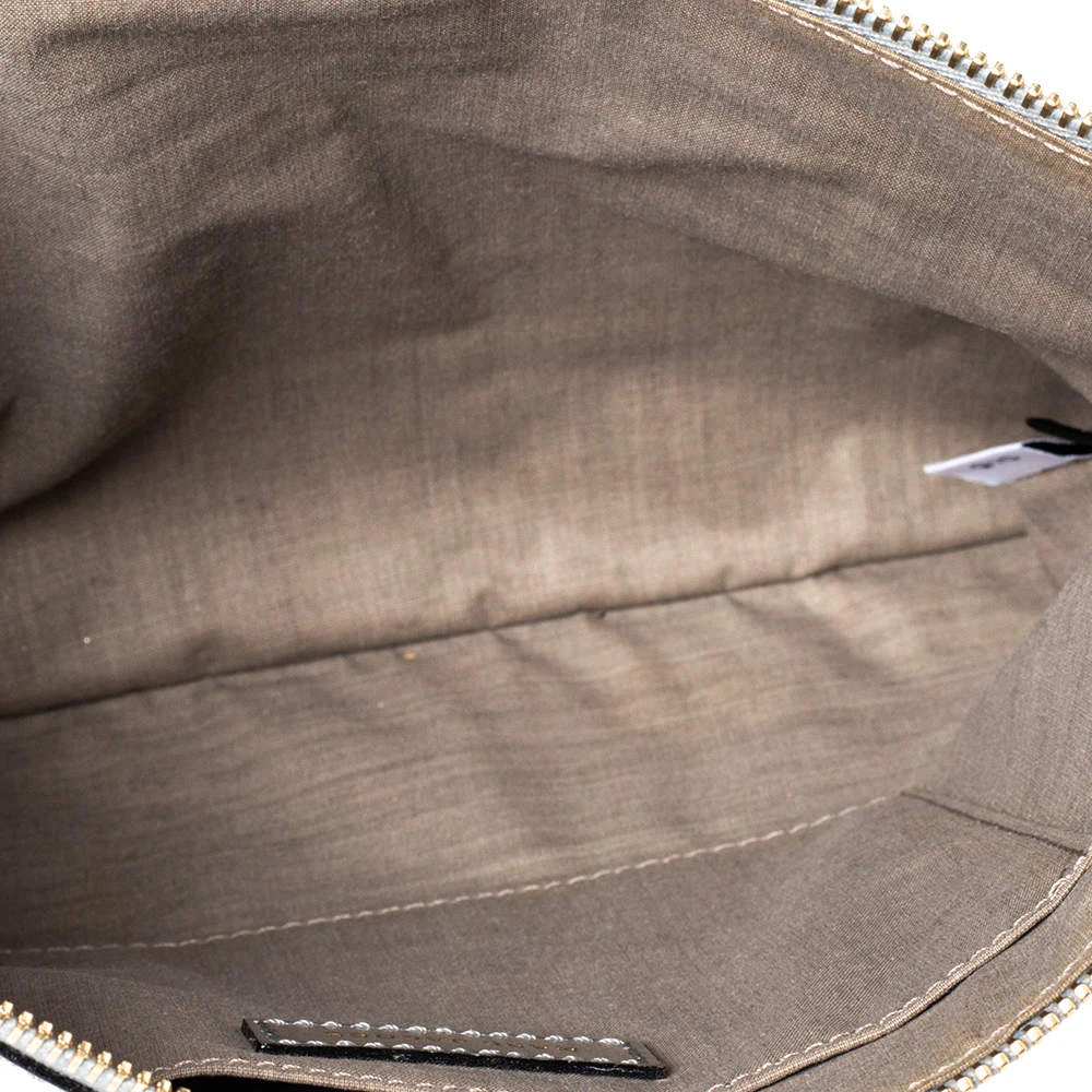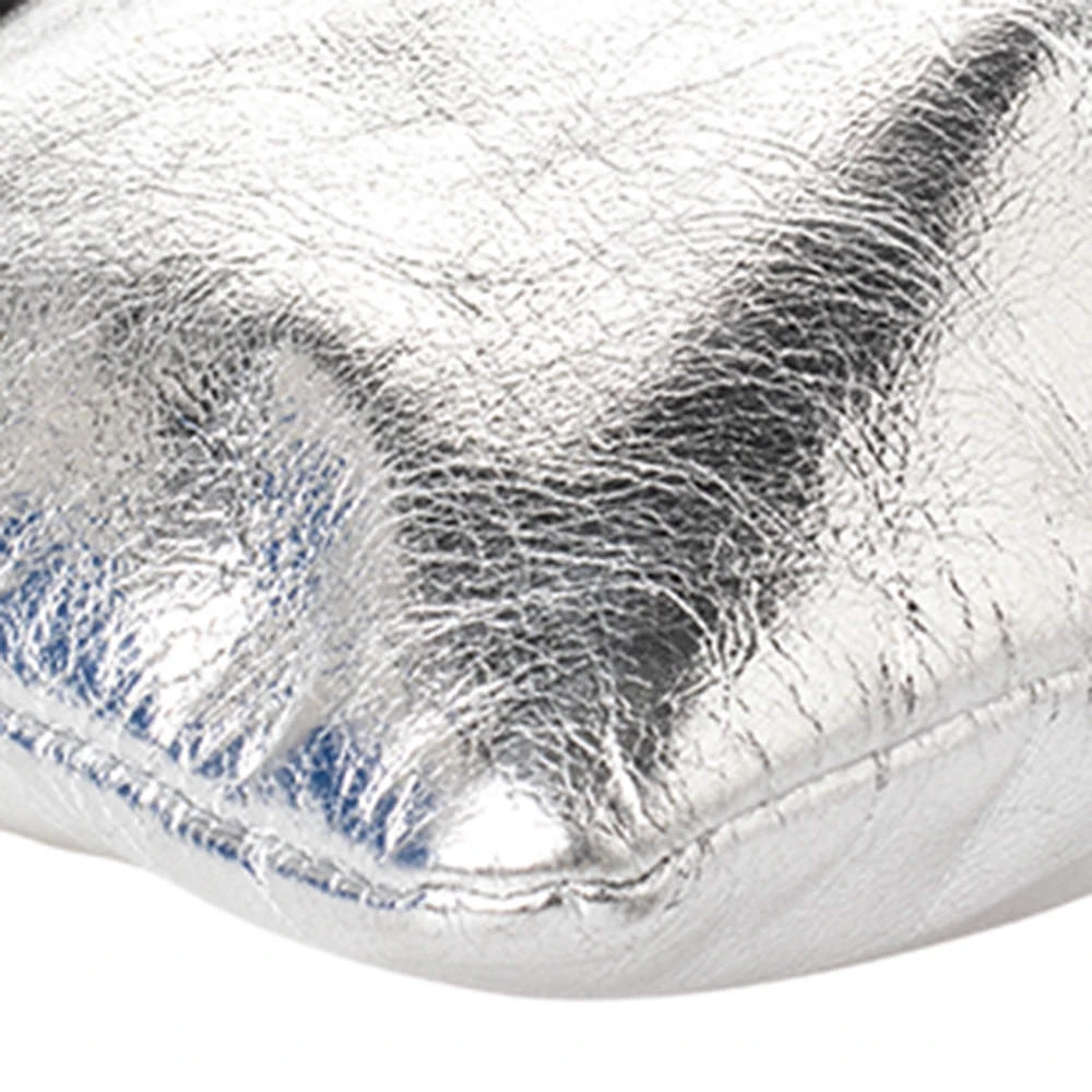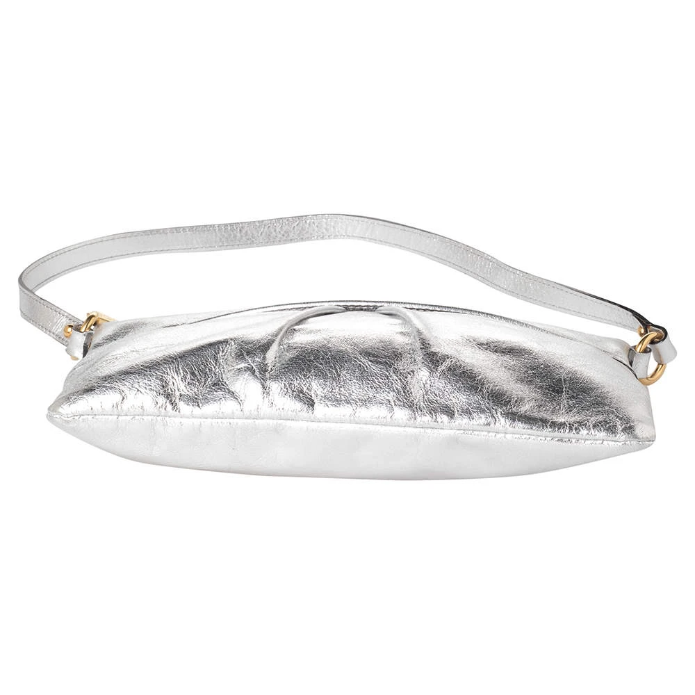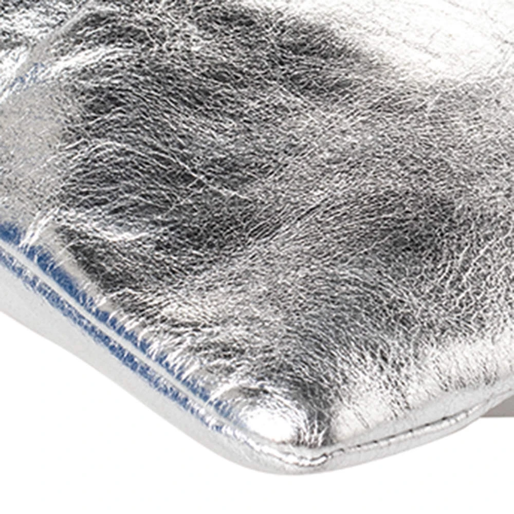 This women’s clutch from Marc Jacobs has been made using leather. It has the brand plaque at the front and a lined interior secured by a top zip closure. This metallic silver clutch has a simple shape and a durable quality.