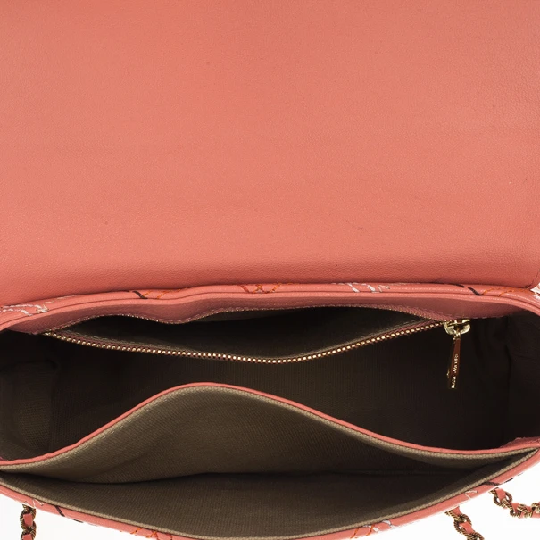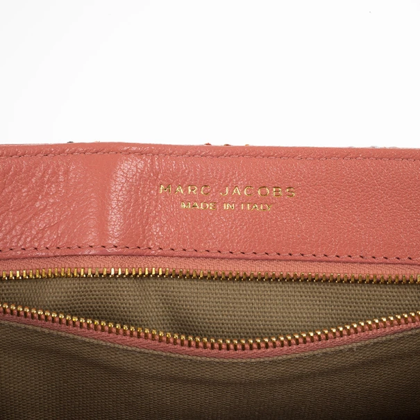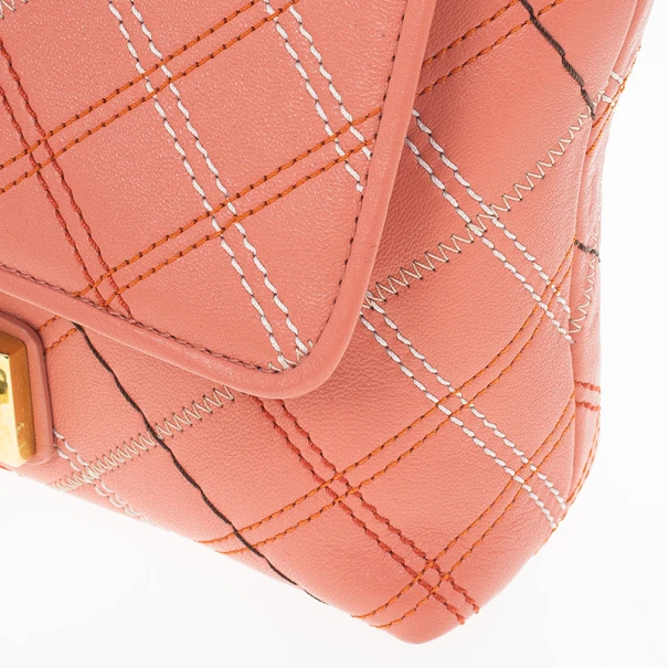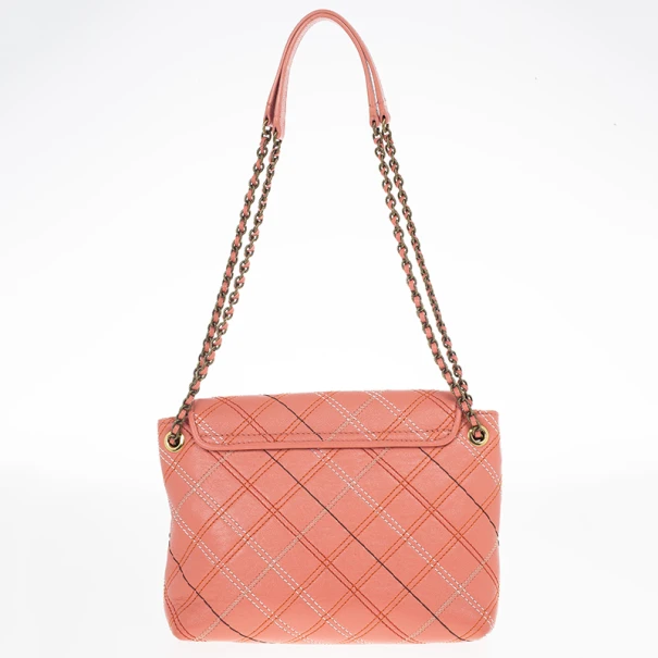Featuring a multicolored design, this Marc Jacobs bag is a feminine beauty. Its pink leather is combined with quilted stitching in beige, orange, white, and black, giving it a fun twist. The exterior features gold-tone hardware and two braided leather and chain shoulder straps with leather shoulder pads for comfort. It has a flap opening with a monogrammed push-lock and beige canvas lining. The interior includes one open pocket and one zipped.Original Retail Price: US $1,125