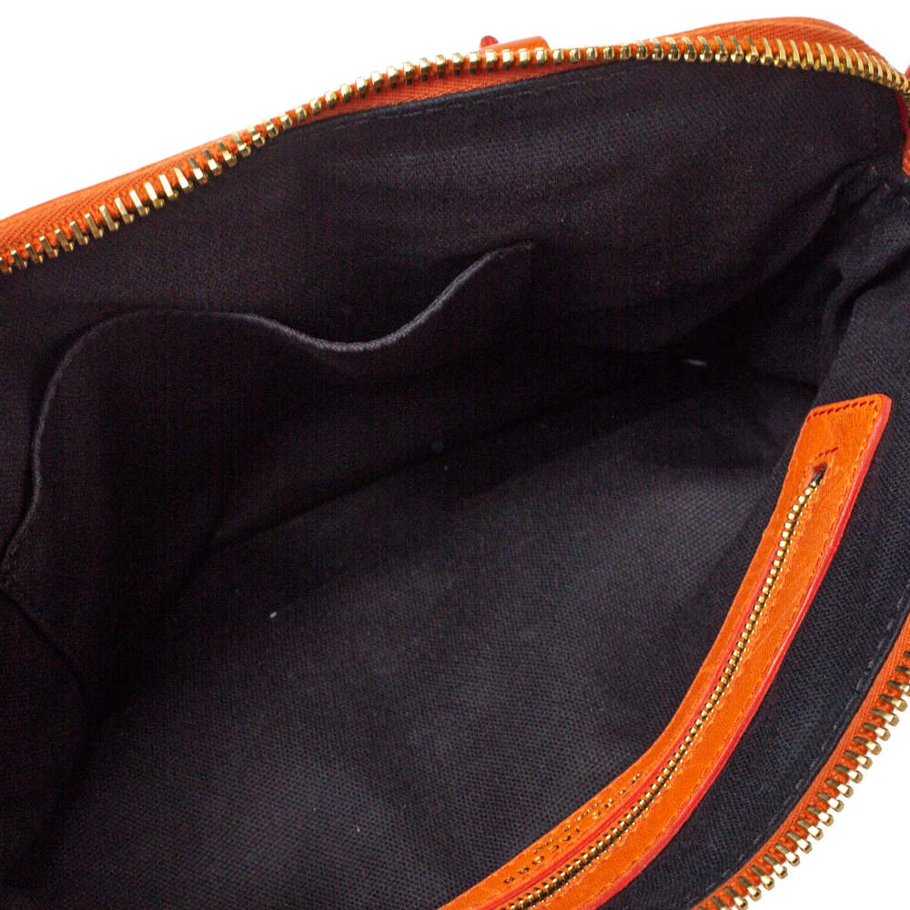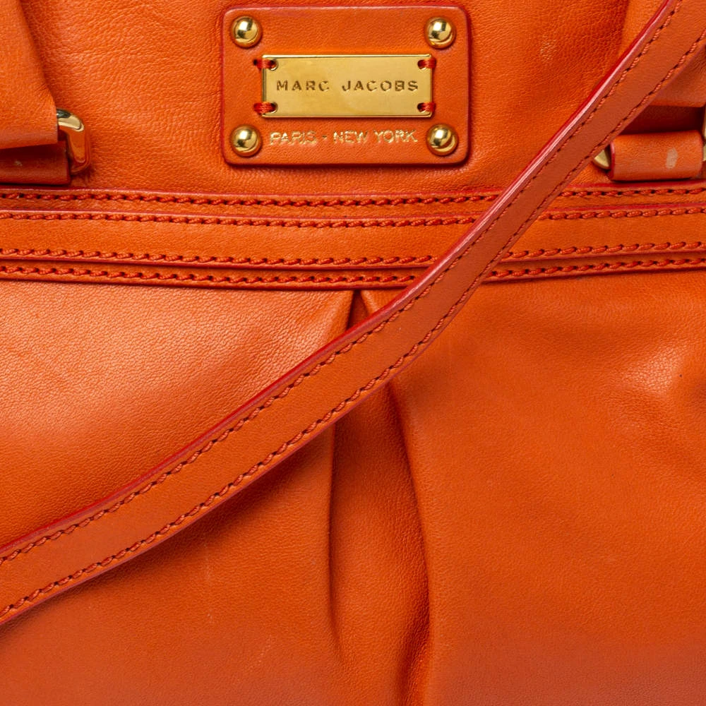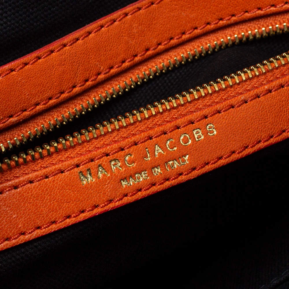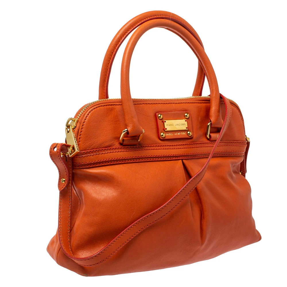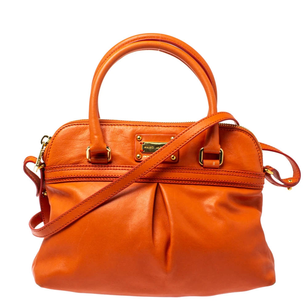 This stylish satchel bag by Marc Jacobs will add a pop of color to your outfits. It has been crafted from quality leather and comes in a bright shade of orange. It has dual handles, the logo plaque, shoulder strap, canvas-lined interior and gold-tone hardware.