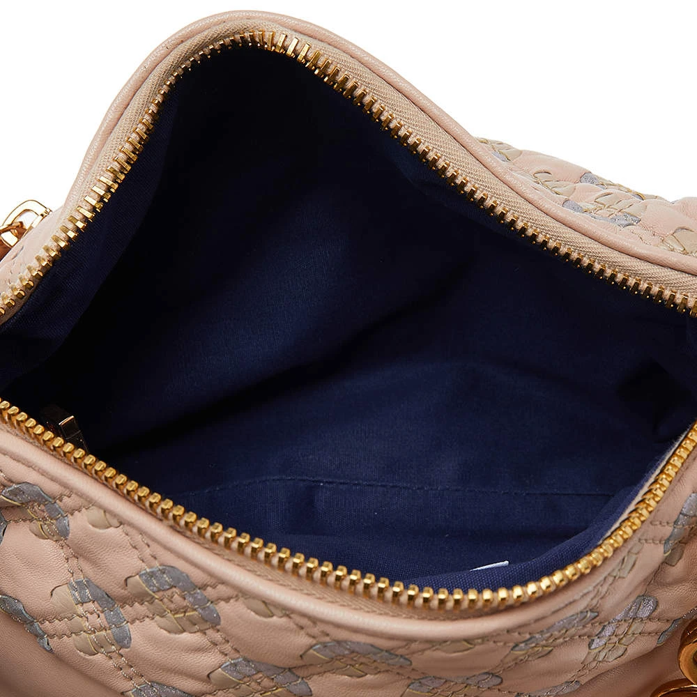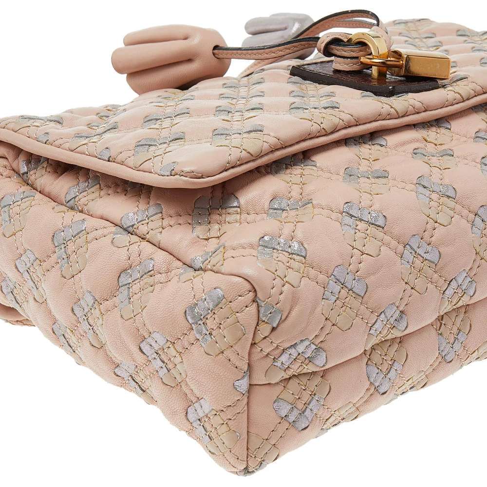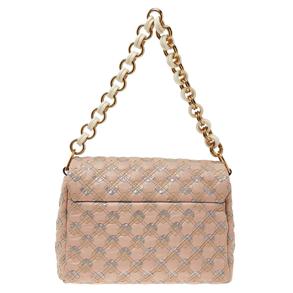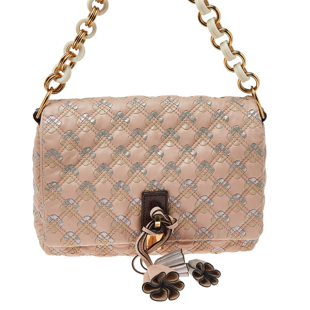 For parties, lunch, or dinner dates, carry a chic bag like this one from the house of Marc Jacobs. The flap bag features a pink quilted leather body fitted with a chain handle. It can easily hold your basics in style.