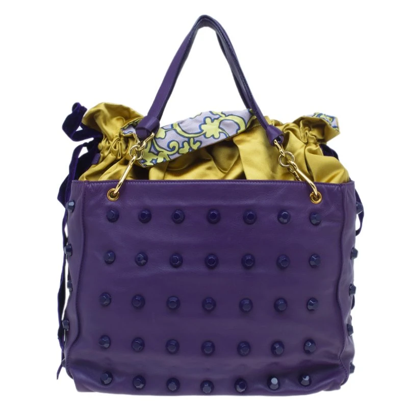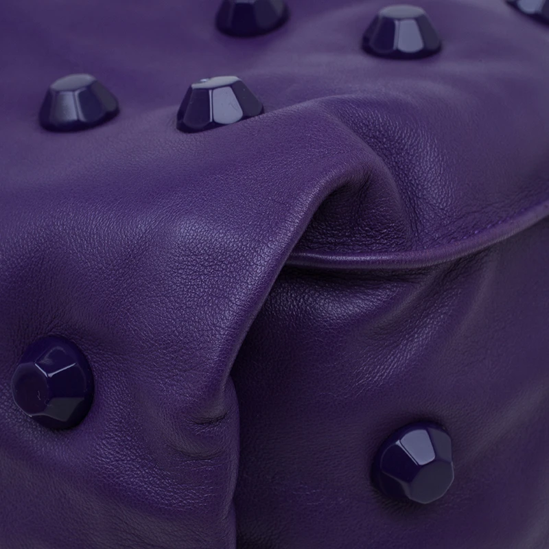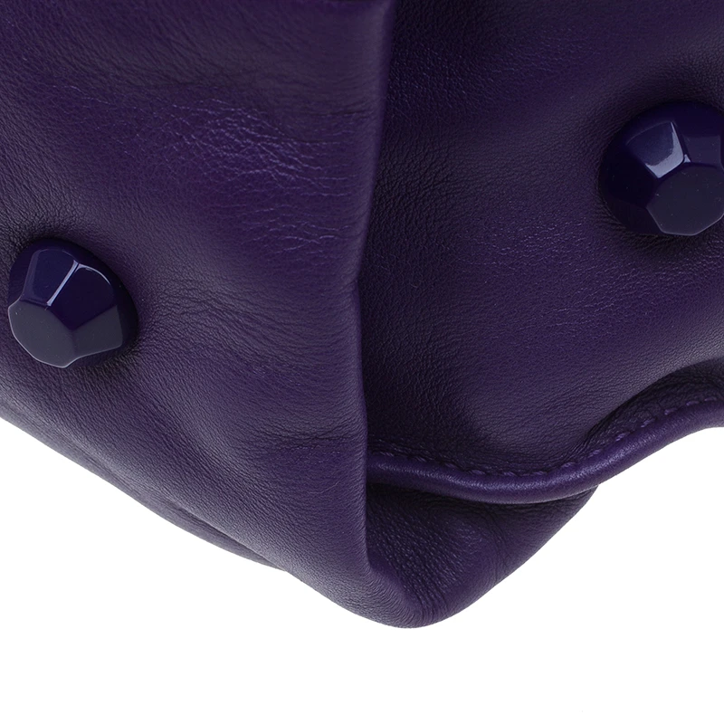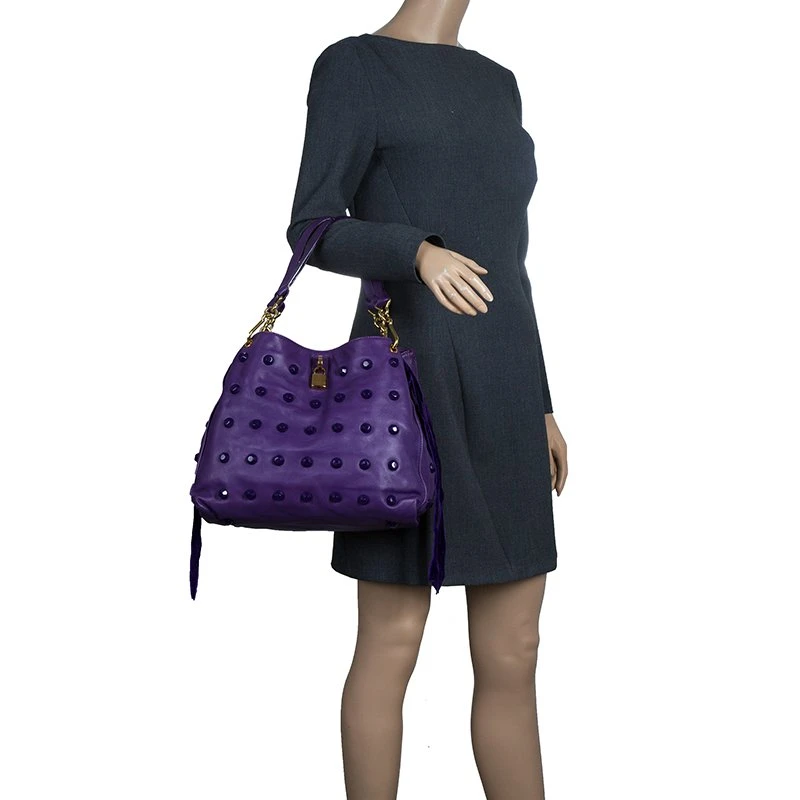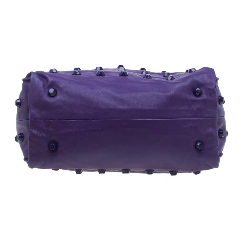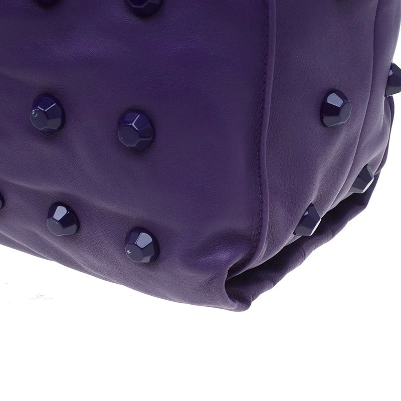 Marc Jacobs gives us a great design in this studded jet tote. Crafted from purple lambskin leather, the exterior features matching stud detailing all over, a gold-tone padlock, and a detachable shoulder straps with gold-tone hook details. The satin lined interior comes with a zipper pocket and a dust bag that can be attached with a stud closure.