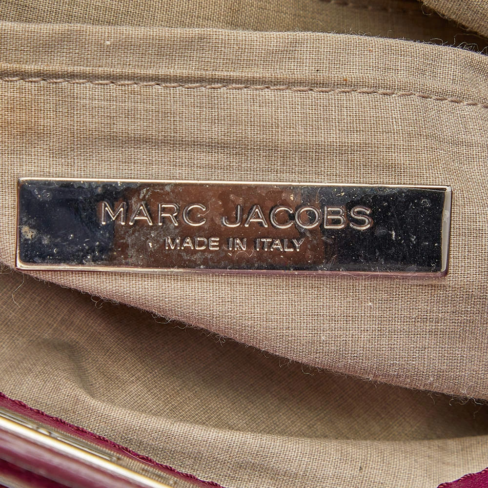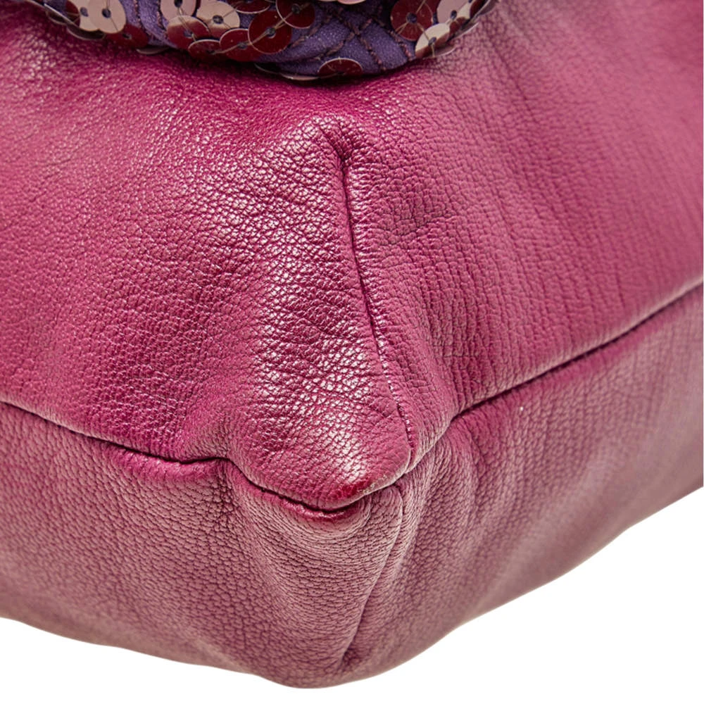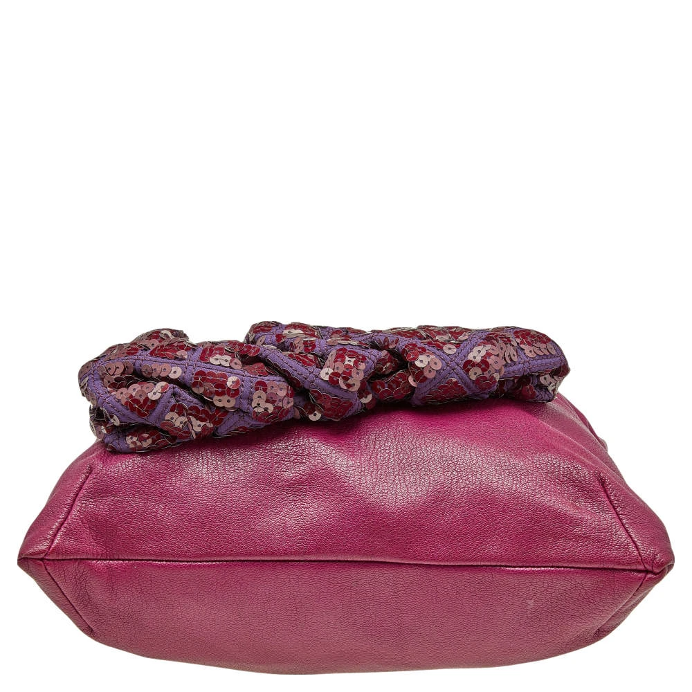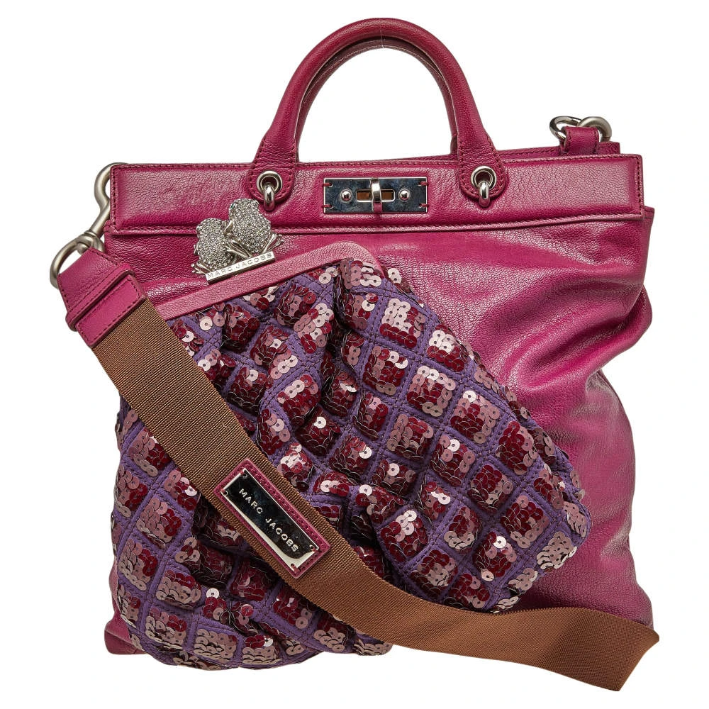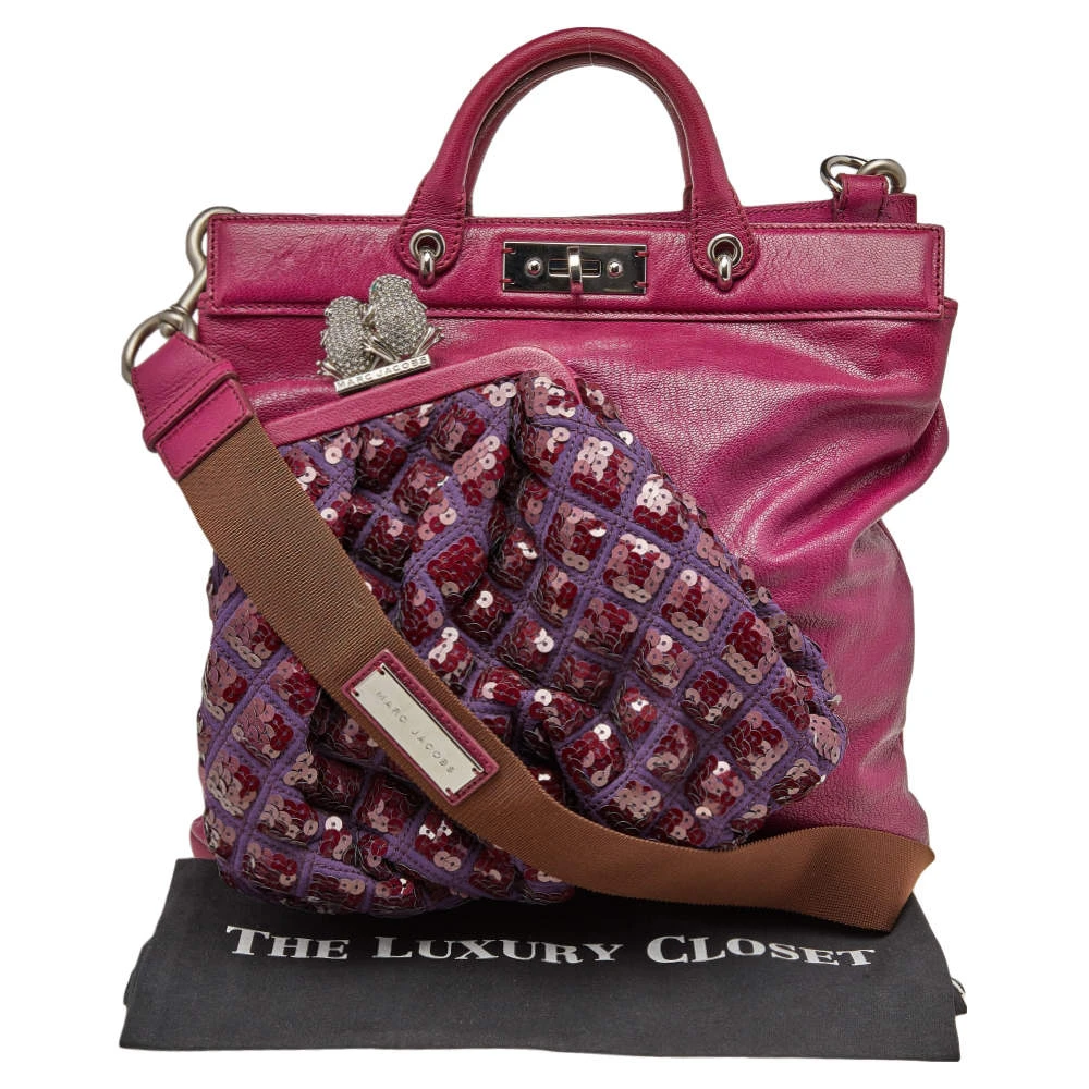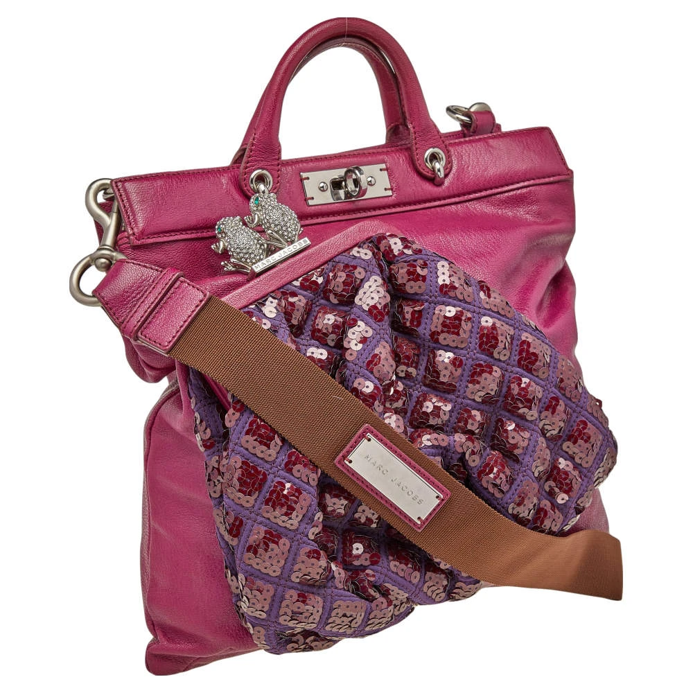 The Robert Duffy bag by Marc Jacobs has a two-in-one design with a sequin-covered pouch added to the front of the main leather tote. The tote has a spacious interior, two handles, a shoulder strap, and twist-lock closure. The front pouch resembles the iconic Stam bag.