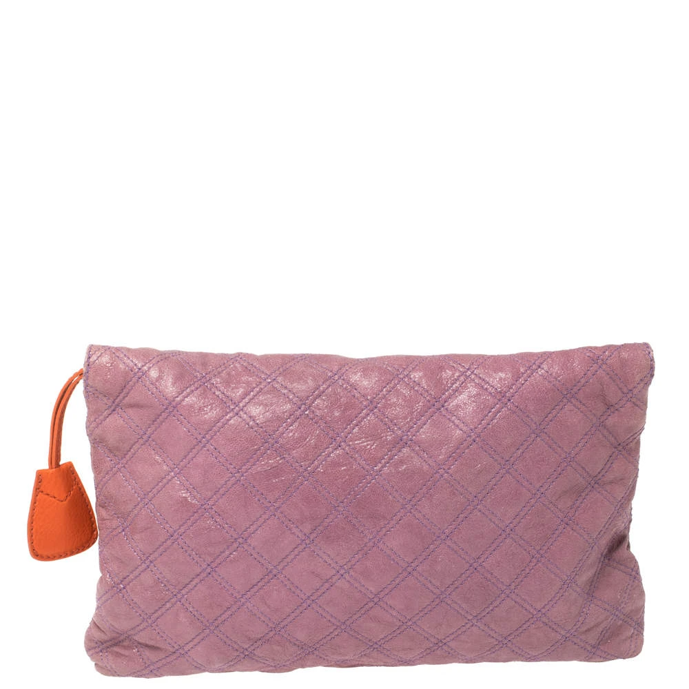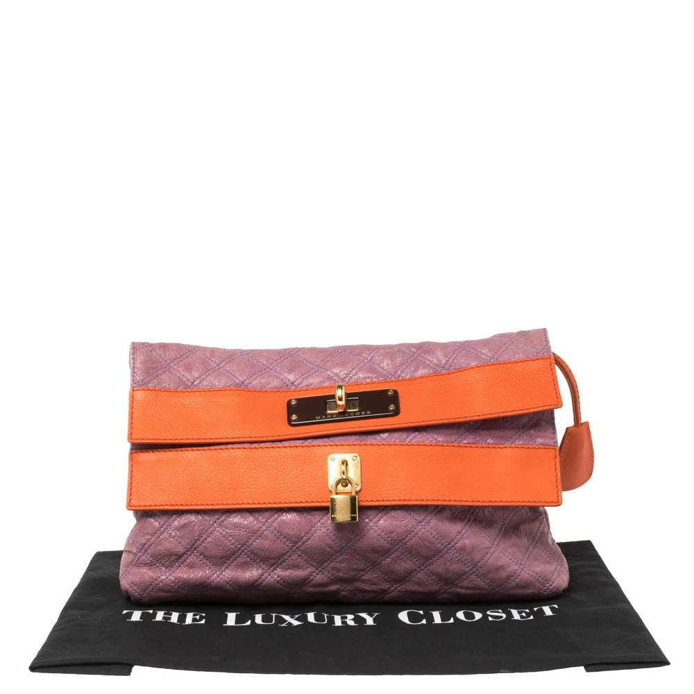 This attractive oversized clutch from Marc Jacobs is made to flaunt your fashion-forward choices. Crafted meticulously from leather, this clutch is accented with a refreshing combination of orange and purple hues and features a quilted design. A double flap with twist-lock closure and a padlock opens to an interior lined with fabric.