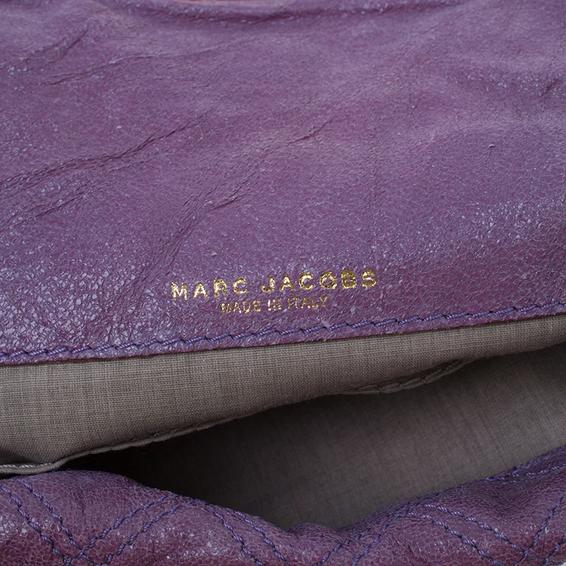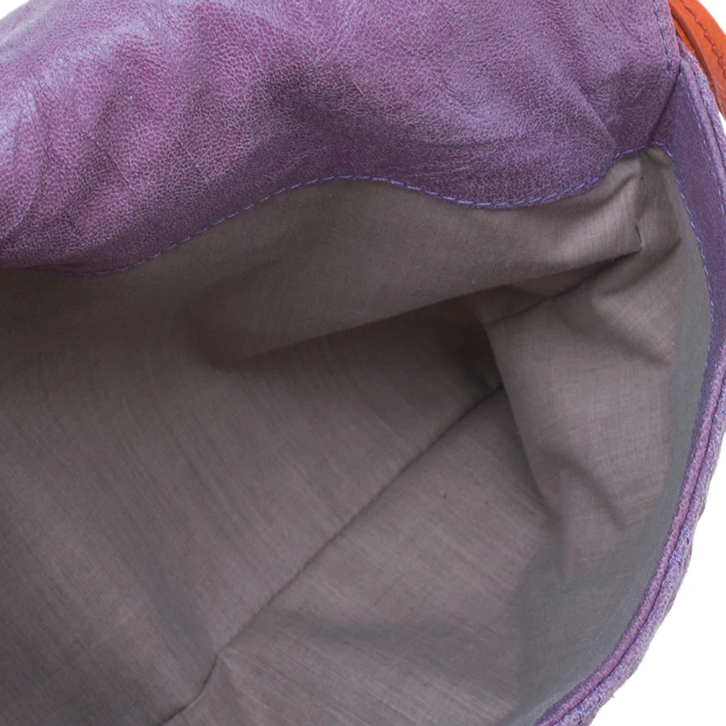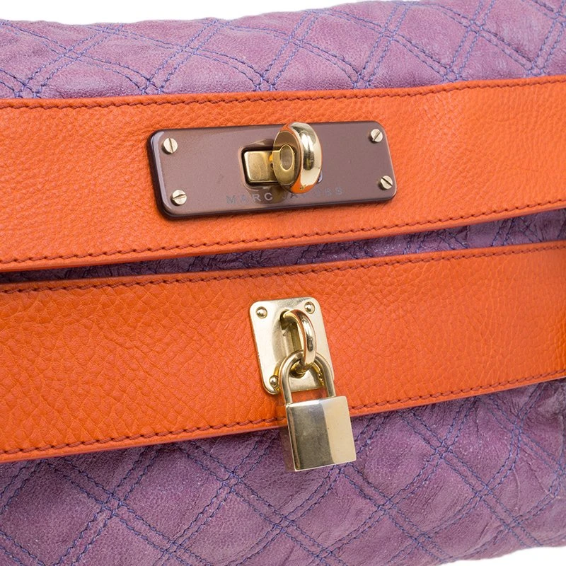 This ultra cute Marc Jacobs oversized Pochette is made from purple and orange leather. It features a double flap front with bold orange trim and is accented with, twist lock closure on one and a snap closure with a padlock and clochette on the other. The interior is lined with fabric and houses two compartments, a patch pocket and a Marc Jacobs label.