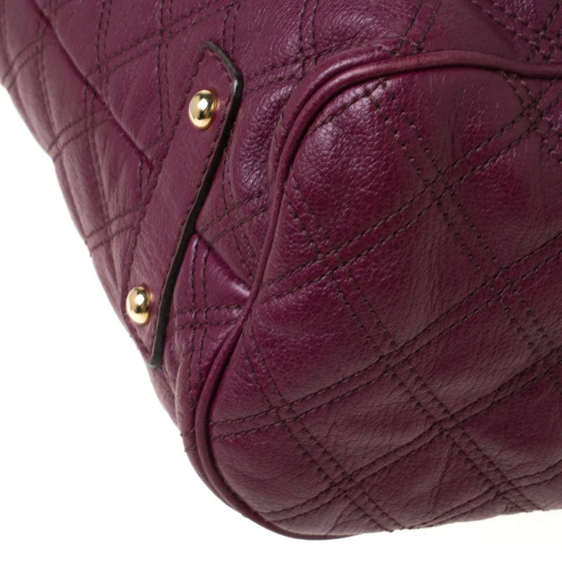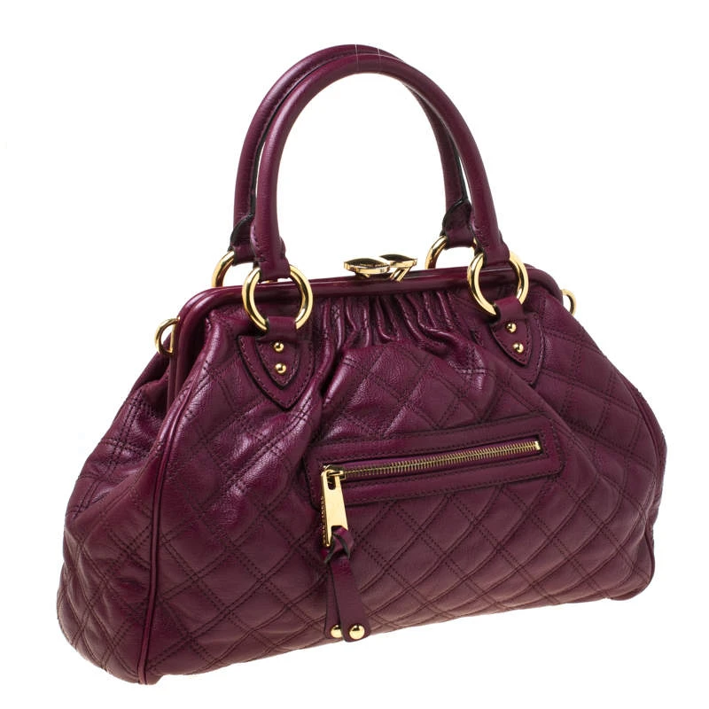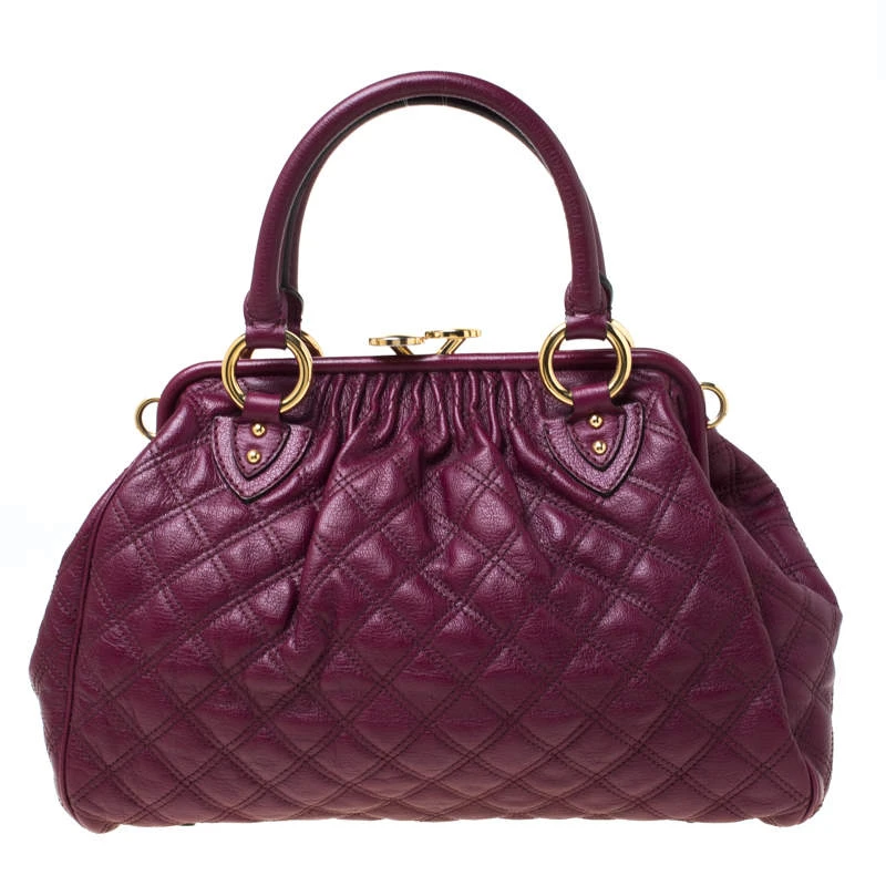 This Marc Jacobs design has a purple quilted exterior crafted from leather and enhanced with gold-tone hardware. This elegant Stam bag features a kiss-lock top closure that opens to a fabric interior, dual top handles and a removable chain that converts this piece between shoulder and hand styles easily. Swing this beauty wherever you go and make heads turn!