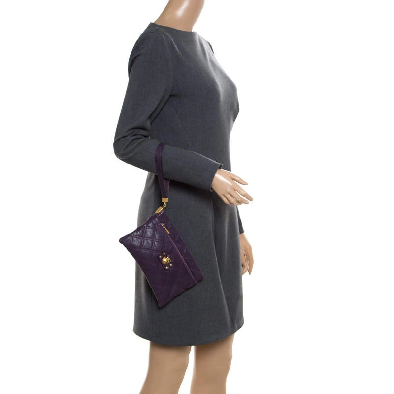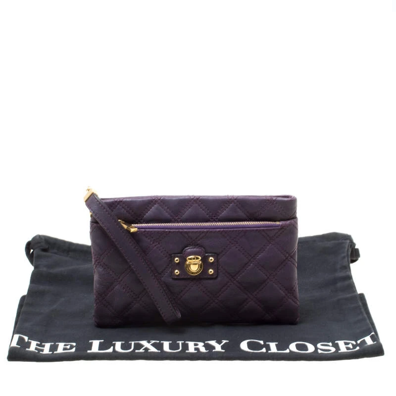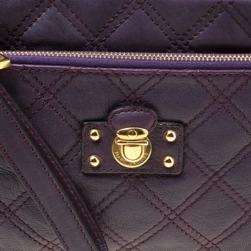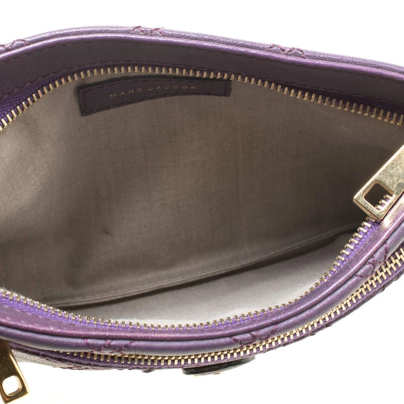 Cute and adorable, this wristlet clutch from Marc Jacobs definitely needs to be on your wishlist! The purple creation is crafted from leather and features a quilted pattern all over it. It flaunts a logo engraved gold-tone lock detailing at the front and a zip pocket and a wristlet. The top zipper opens to a fabric lined spacious interior. Carry your essentials in style and let it do all the talking.