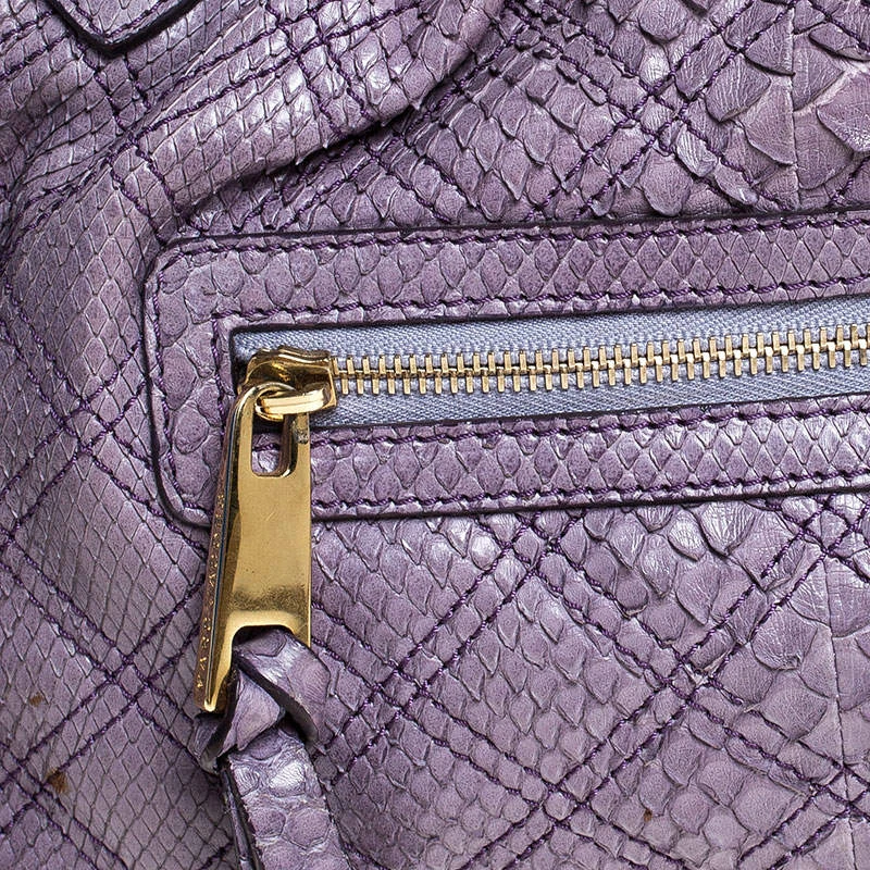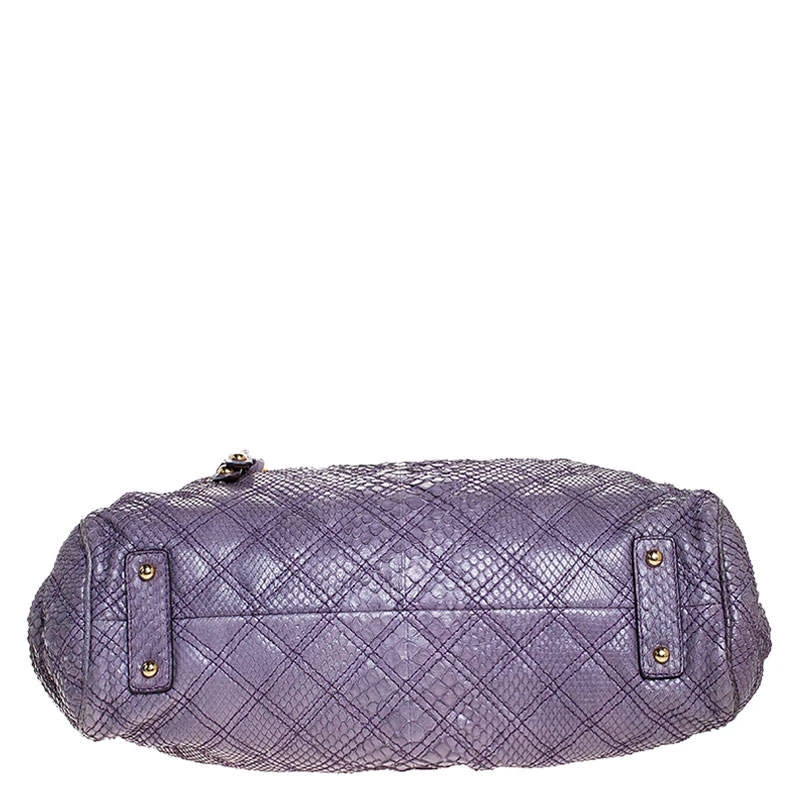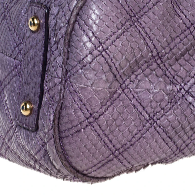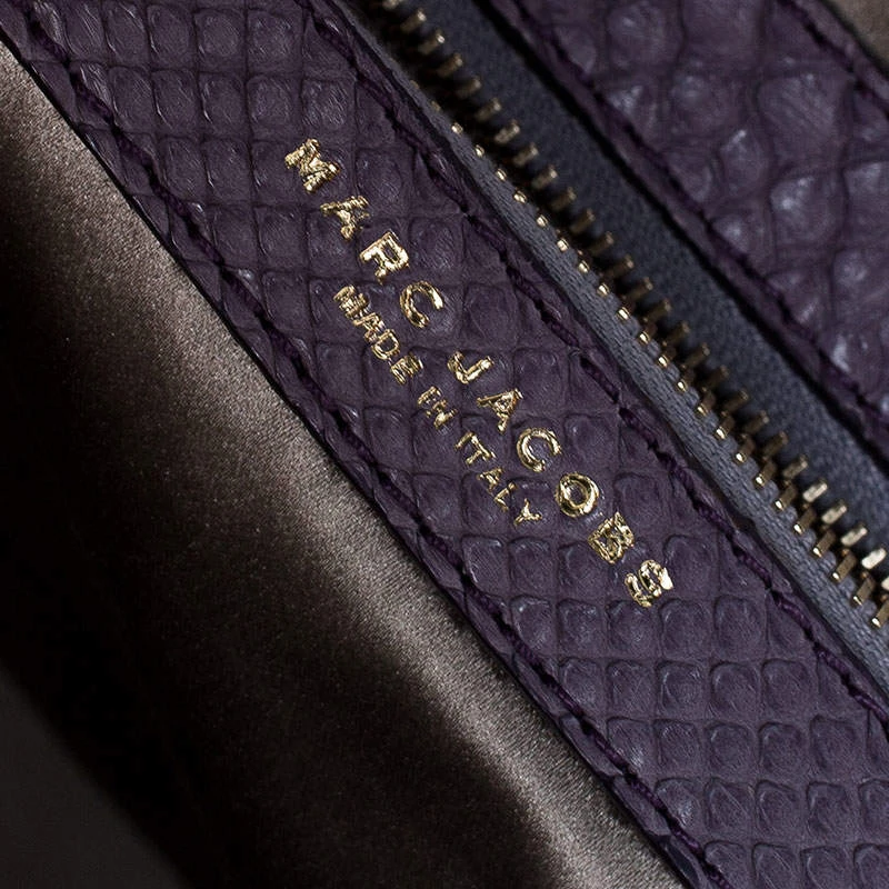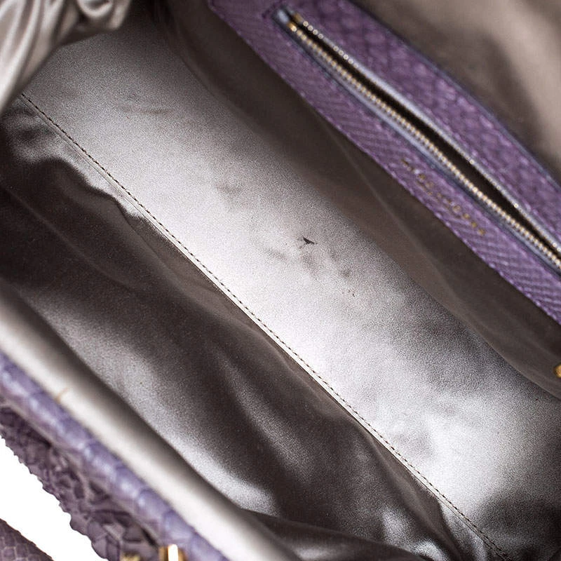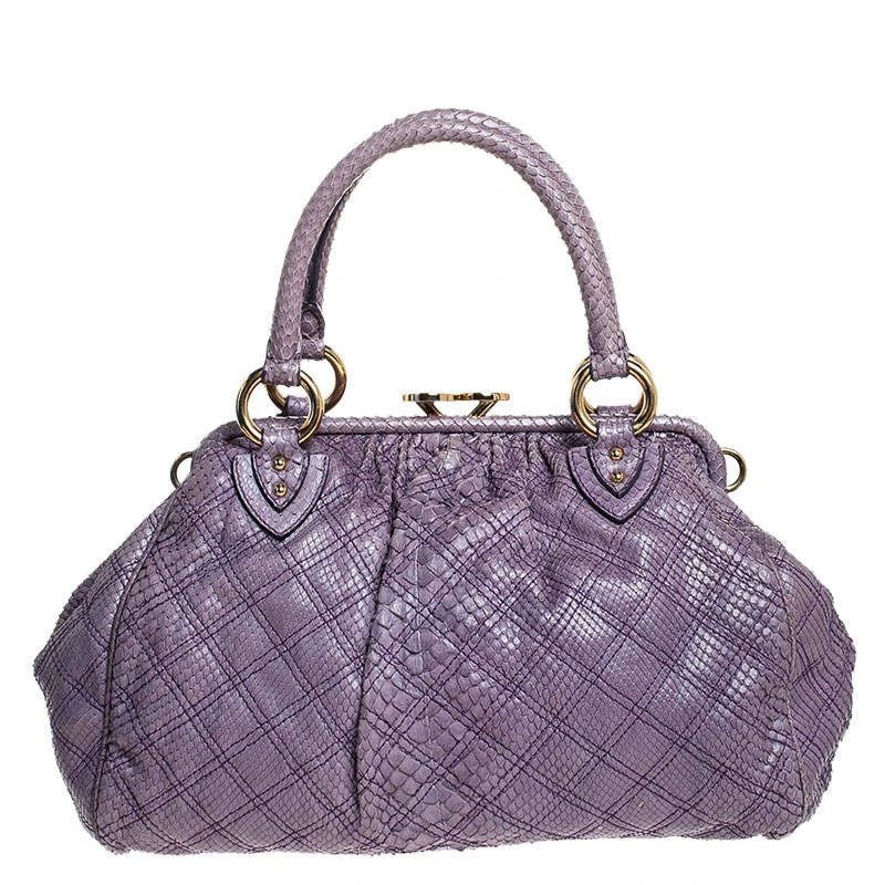 This Marc Jacobs design has a purple quilted exterior crafted from exotic python skin and enhanced with gold-tone hardware. This elegant Stam bag features a kiss-lock top closure that opens to a satin interior, dual top handles and a removable chain that converts this piece between shoulder and hand styles easily. Swing this beauty wherever you go and make heads turn!