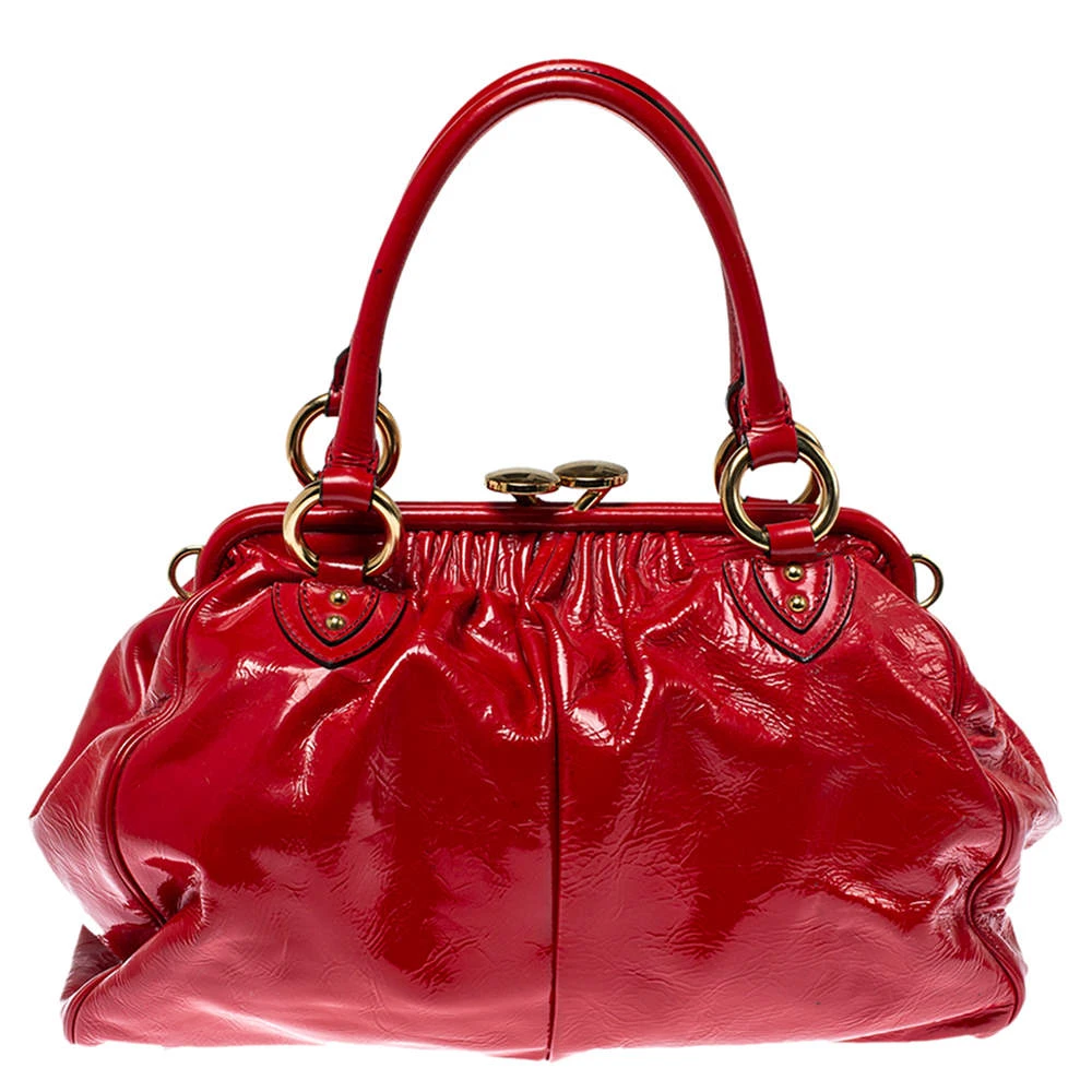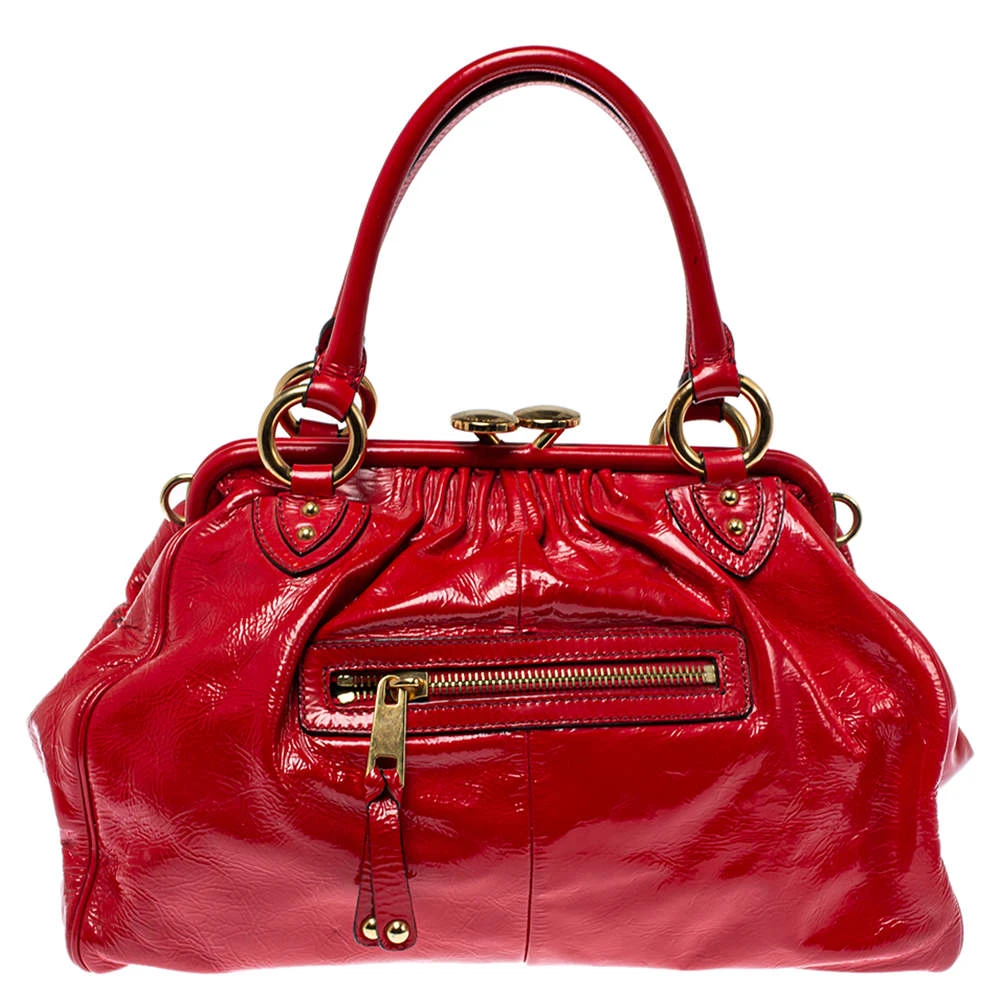 This Marc Jacobs design has a red quilted exterior crafted from patent leather and enhanced with gold-tone hardware. This elegant Stam bag features a kiss-lock top closure that opens to a satin interior, dual top handles, and a removable chain that converts this piece between shoulder and hand styles easily. Swing this beauty wherever you go and make heads turn!
