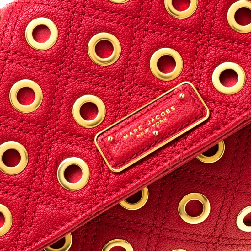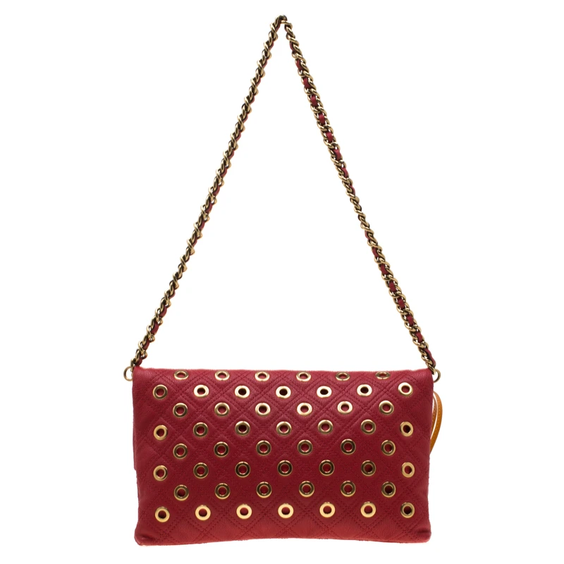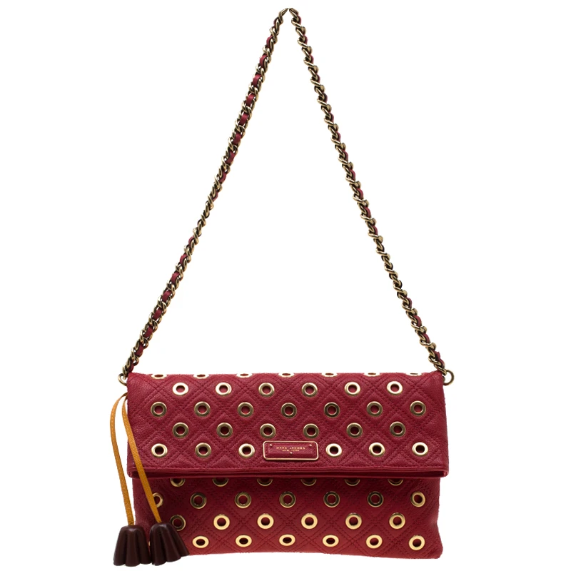 This Marc Jacobs shoulder bag is quite a statement-making creation. Made from red quilted leather, it is detailed with gold-tone eyelets, tassels, and a foldover flap. The canvas-lined interior comes with a zipped pocket and the bag is held by an interwoven chain.