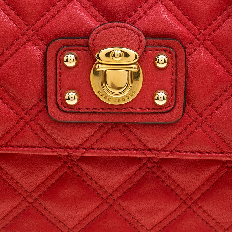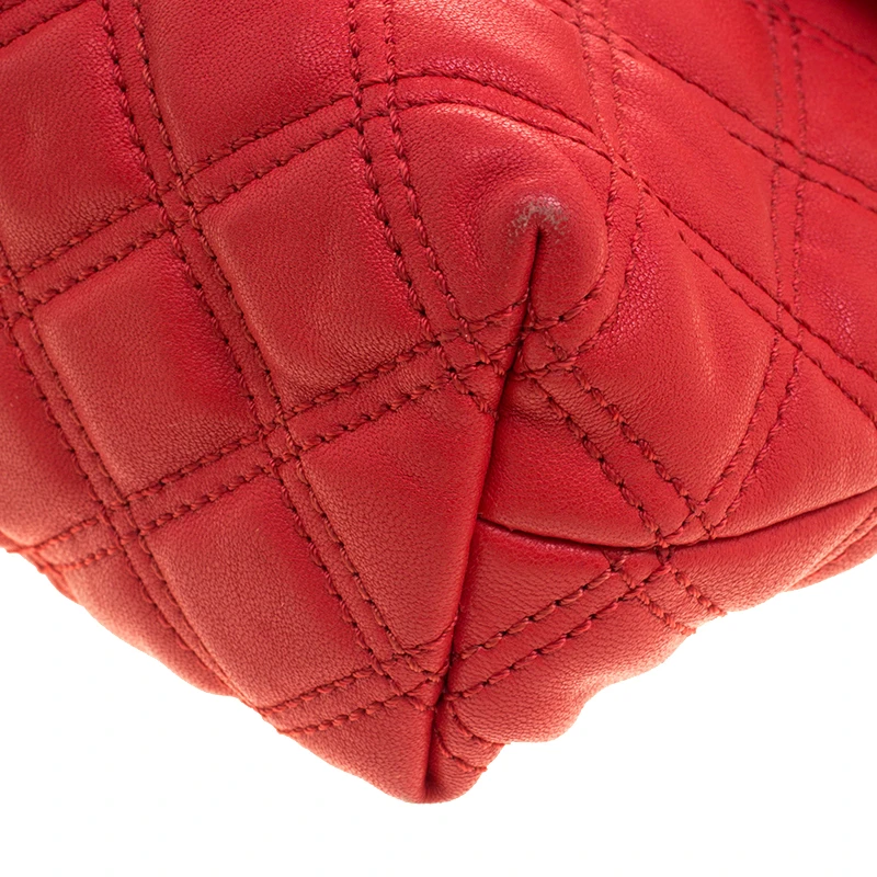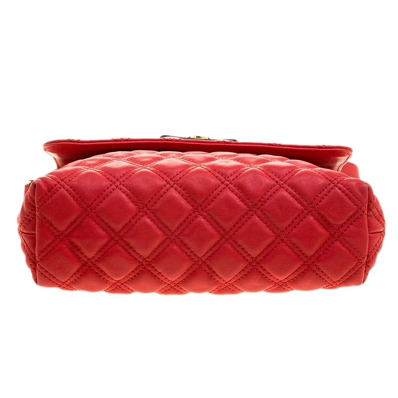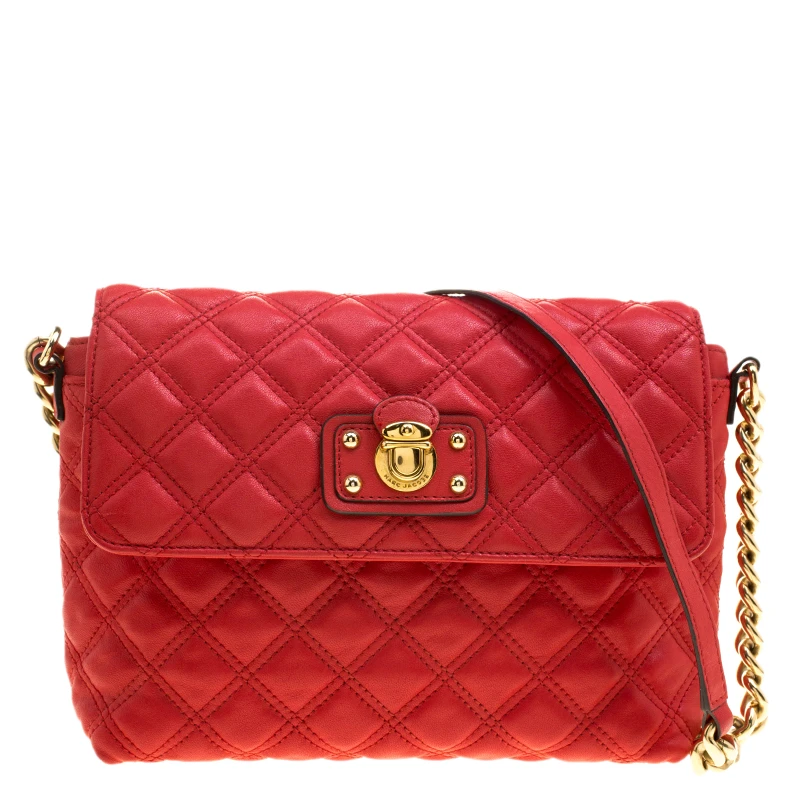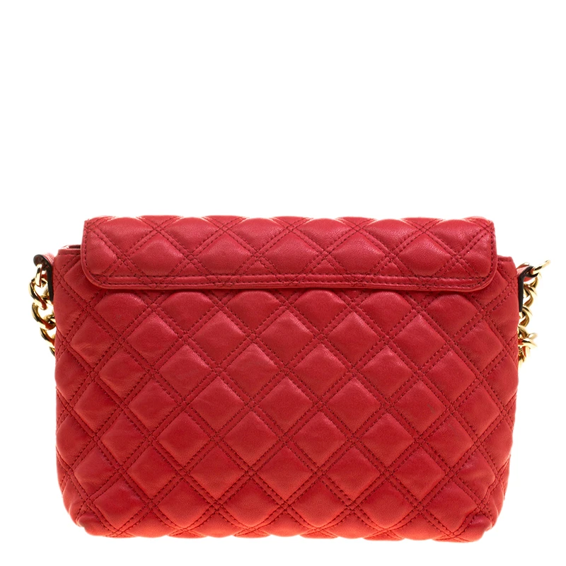 How gorgeous is this shoulder bag from Marc Jacobs! It carries an outstanding design and a fabulous red quilted leather exterior. The flap has a push lock which secures a fabric interior and the bag is held by a long shoulder chain. This piece is well made and perfected to delight your style.