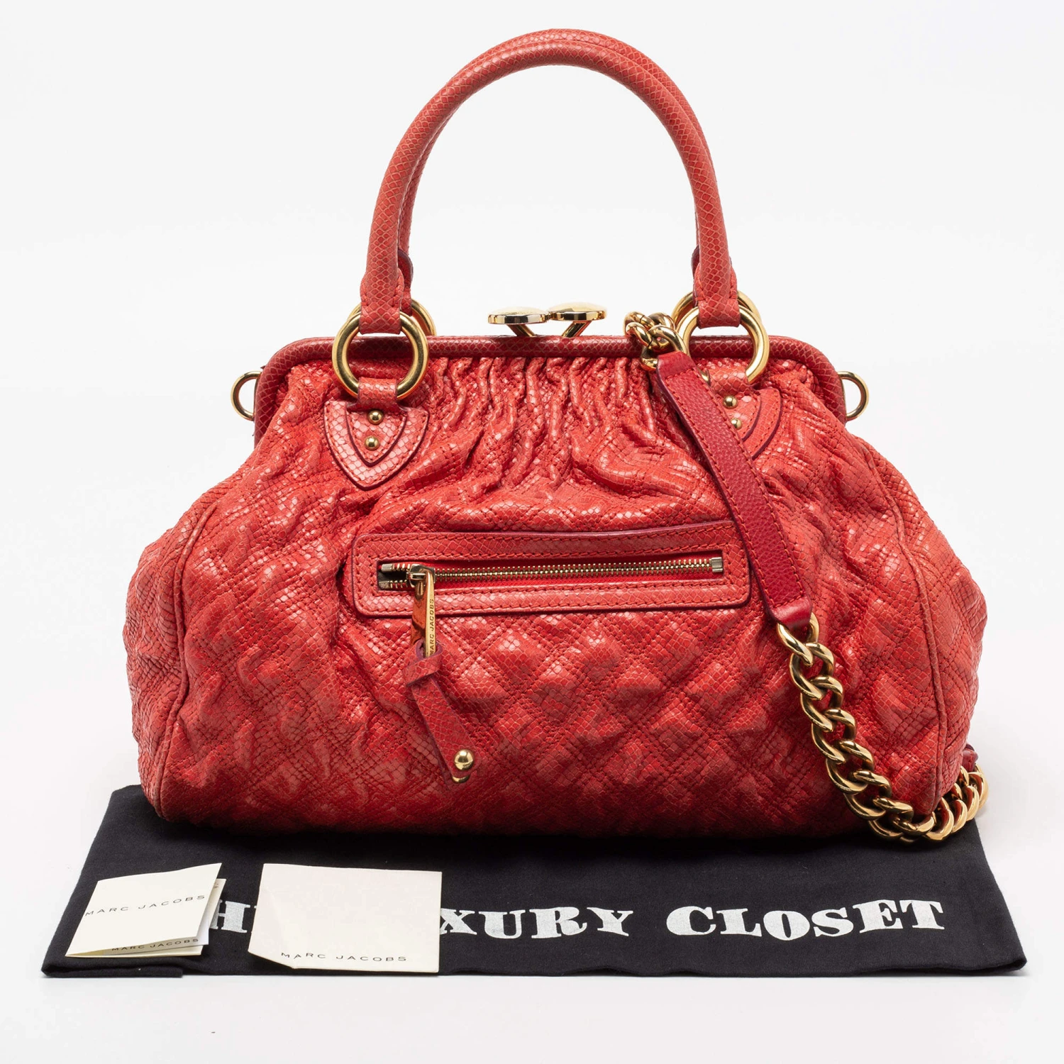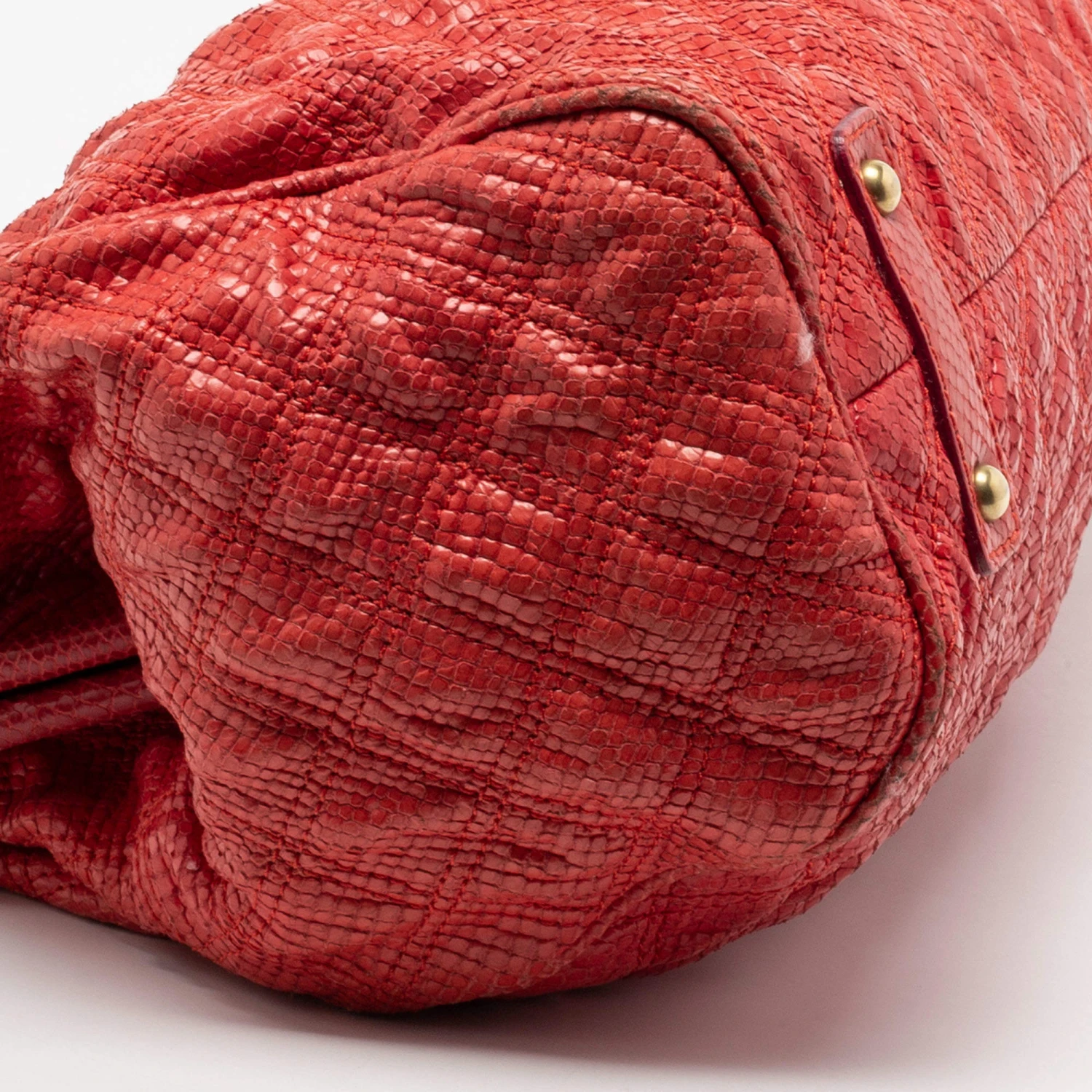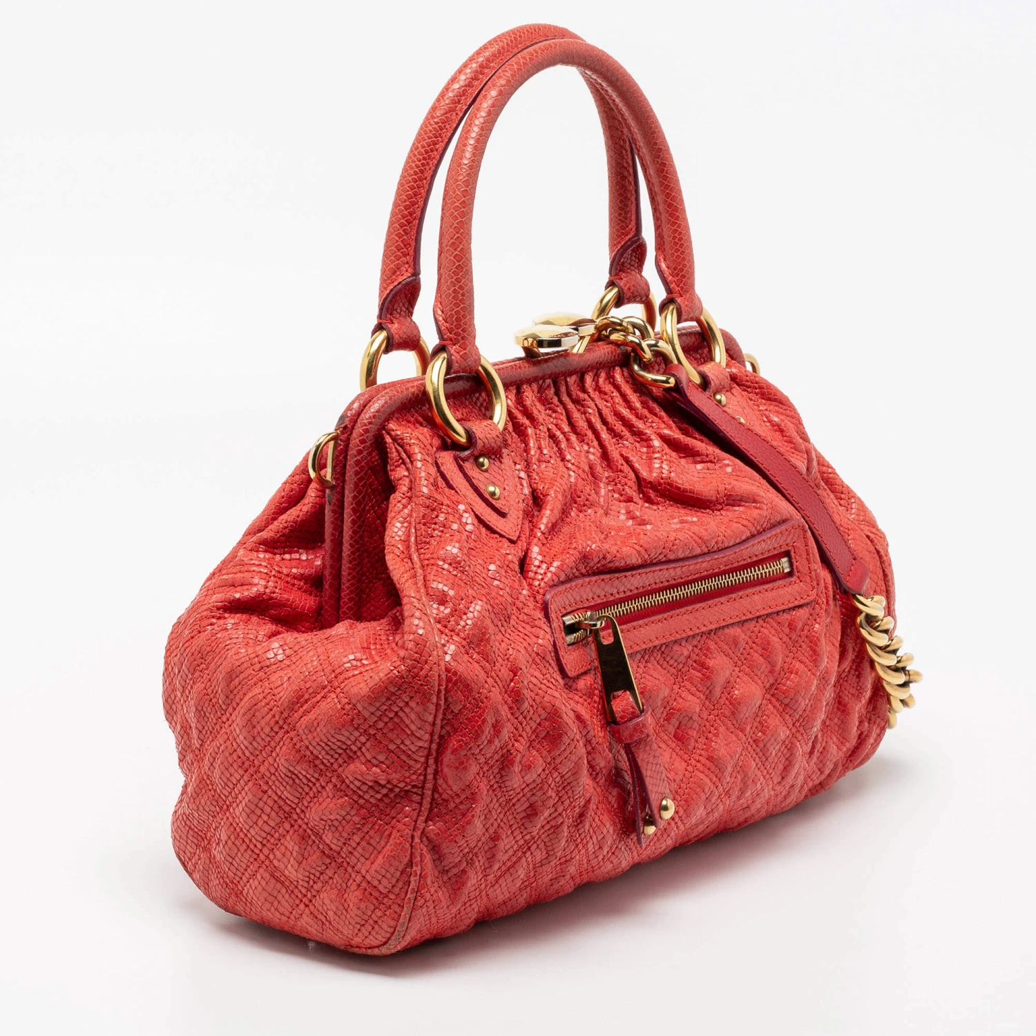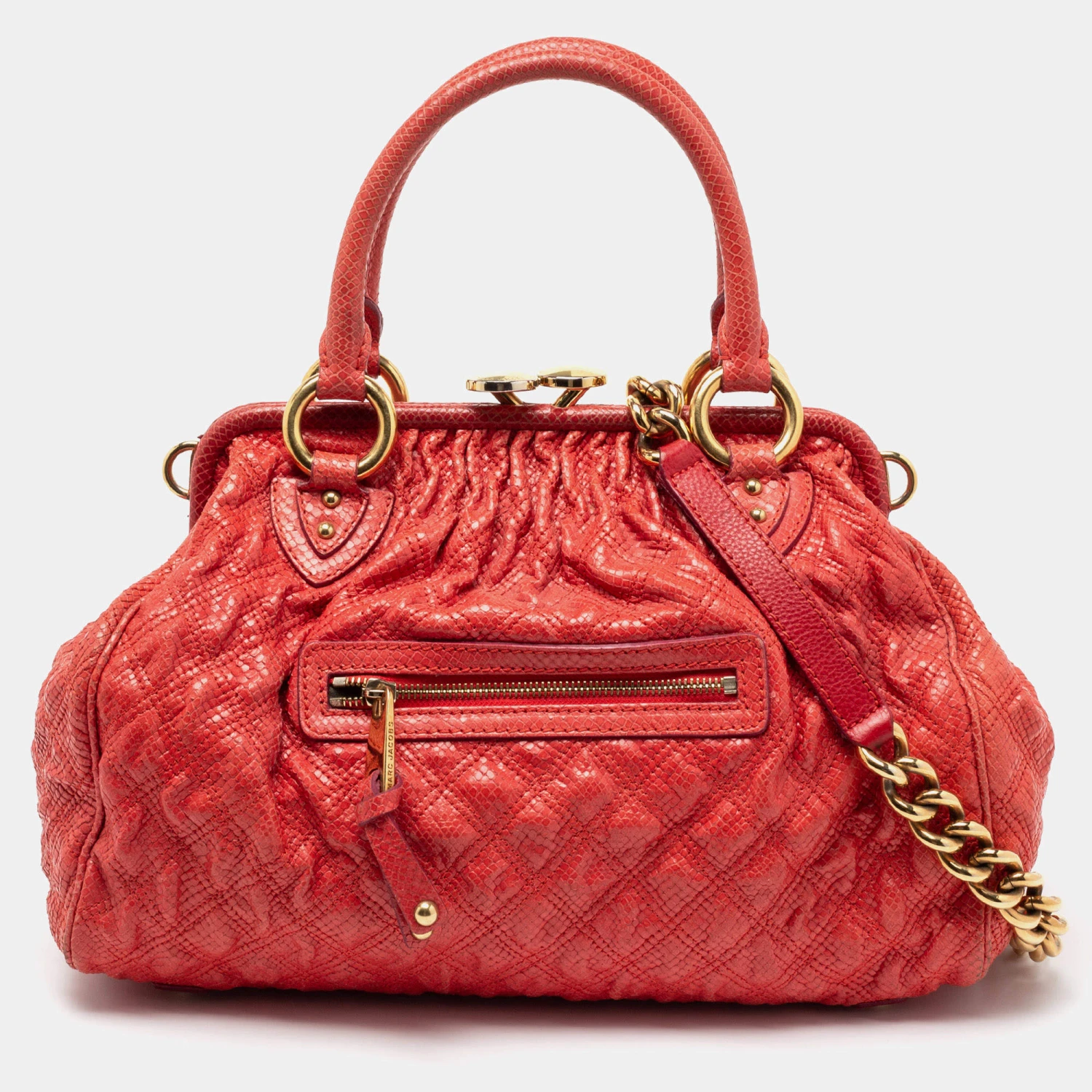 Easy to carry and stylish in appearance, this Stam satchel from the House of Marc Jacobs will certainly be your favorite pick this season. It is crafted using red snake-skin embossed leather, with gold-tone hardware elevating its beauty. It provides two handles and a spacious fabric-lined interior. Say hello to this beauty!