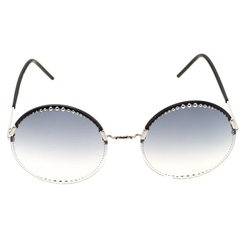Studded and shimmering, these Marc Jacobs sunglasses will keep you shining. Its opulent design is made from silver acetate and it has slender temples carrying logo engravngs. These round sunnies feature gradient blue lenses that are beautified with studs for a touch of feminity.