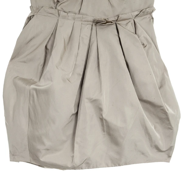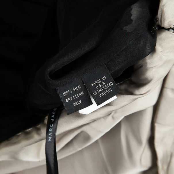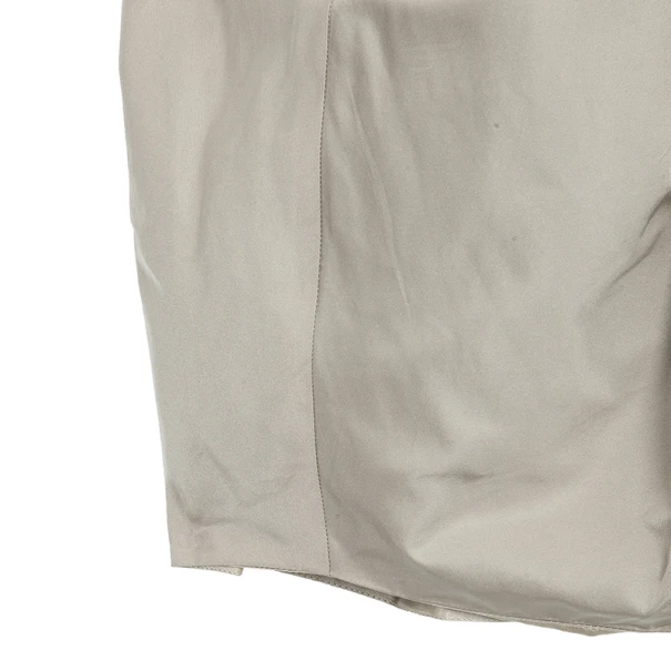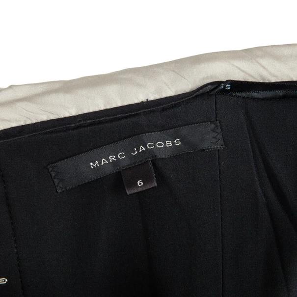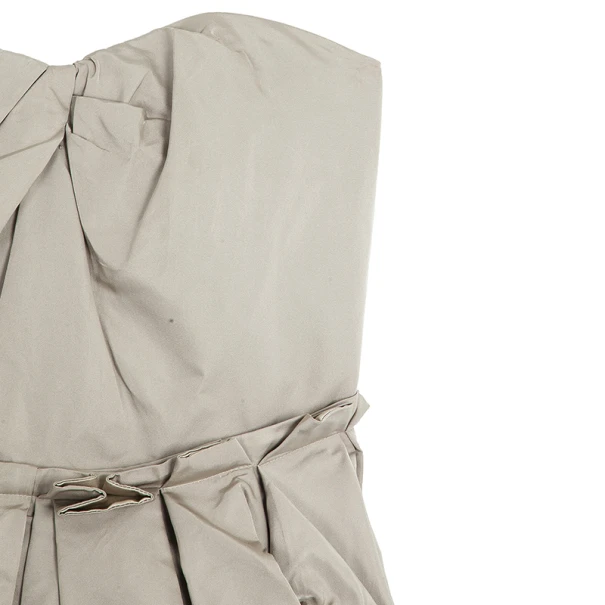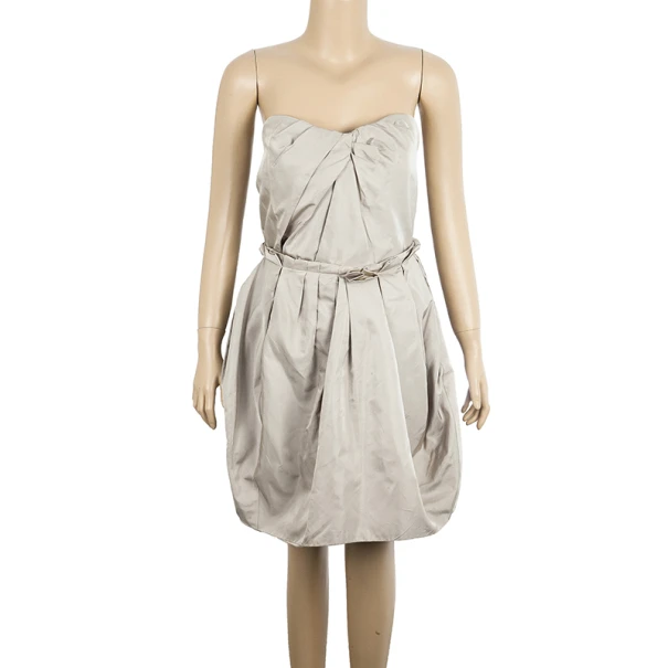 Get the look of a winter princess with this Marc Jacobs strapless dress. Made entirely from silk, its tafetta material creates its dreamlike design, with pleats across the bust and the waist. The grey color combined with the stitching at the waist gives it the illusion of a belt and a peaceful and crisp appearance. It has a back zip closure, as well as a clasp fastening on the lining. Pair up this piece with some glittery platforms and a statement clutch for the perfect ensemble!