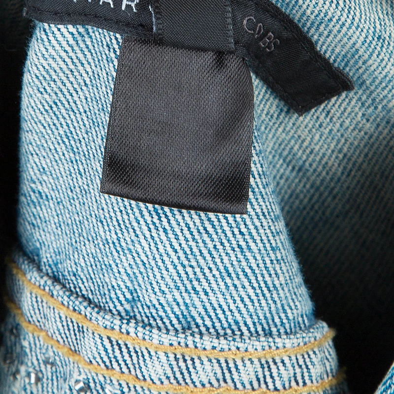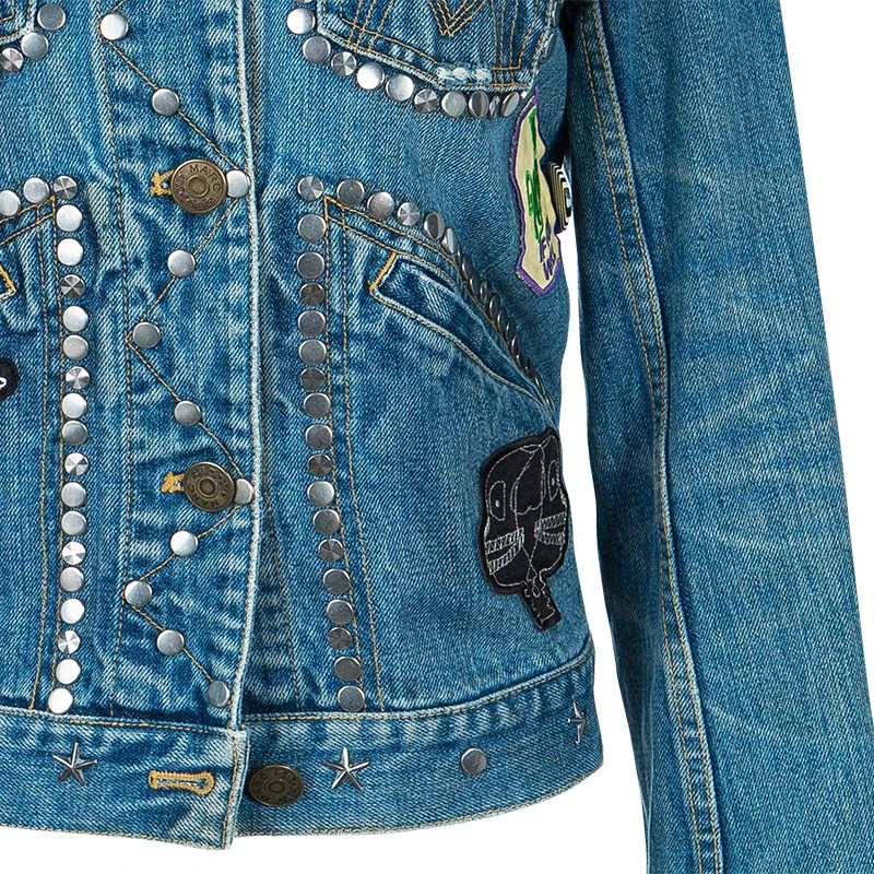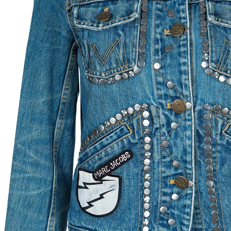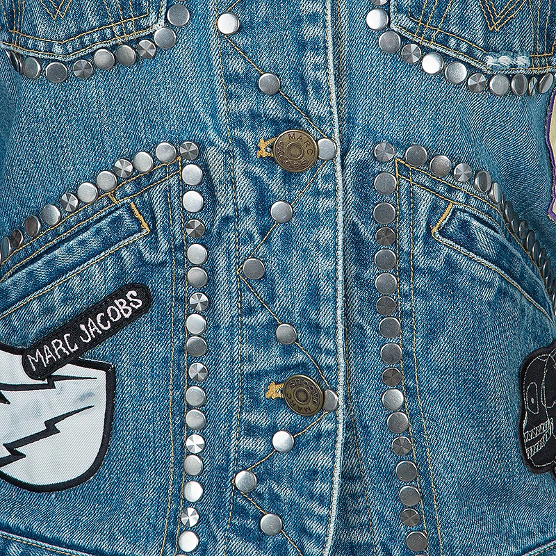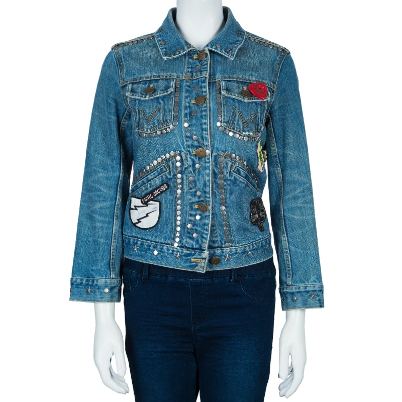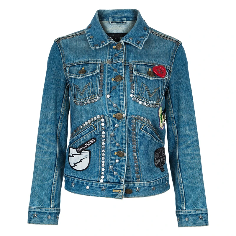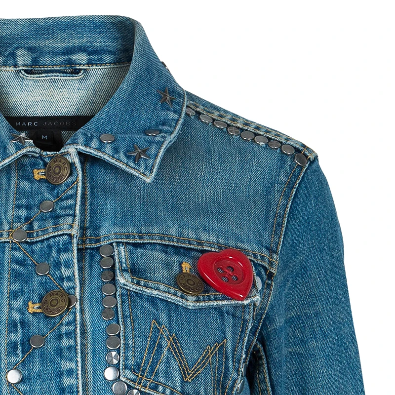 This cute denim jacket by Marc Jacobs will bring out the child in you. It has a collar, front button closures and long sleeves. The main highlight of this jacket is the stud embellishments and patches all over.