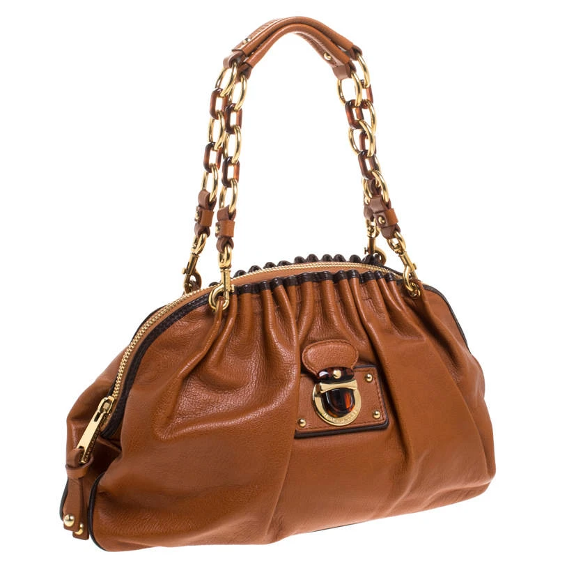 Flaunt your exclusive taste of fashion with this Capra satchel from Marc Jacobs. This polished and sophisticated bag is crafted from tan leather and is smart enough to uplift any look. It comes equipped with a top zip closure that opens to reveal a fabric-lined interior with a zip pocket, chain and leather straps, logo detail on the front and gold-tone hardware. Look dressy with minimum efforts by carrying this satchel.